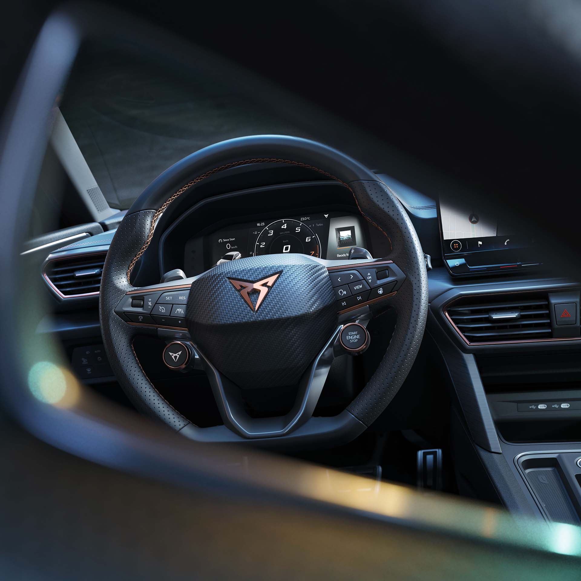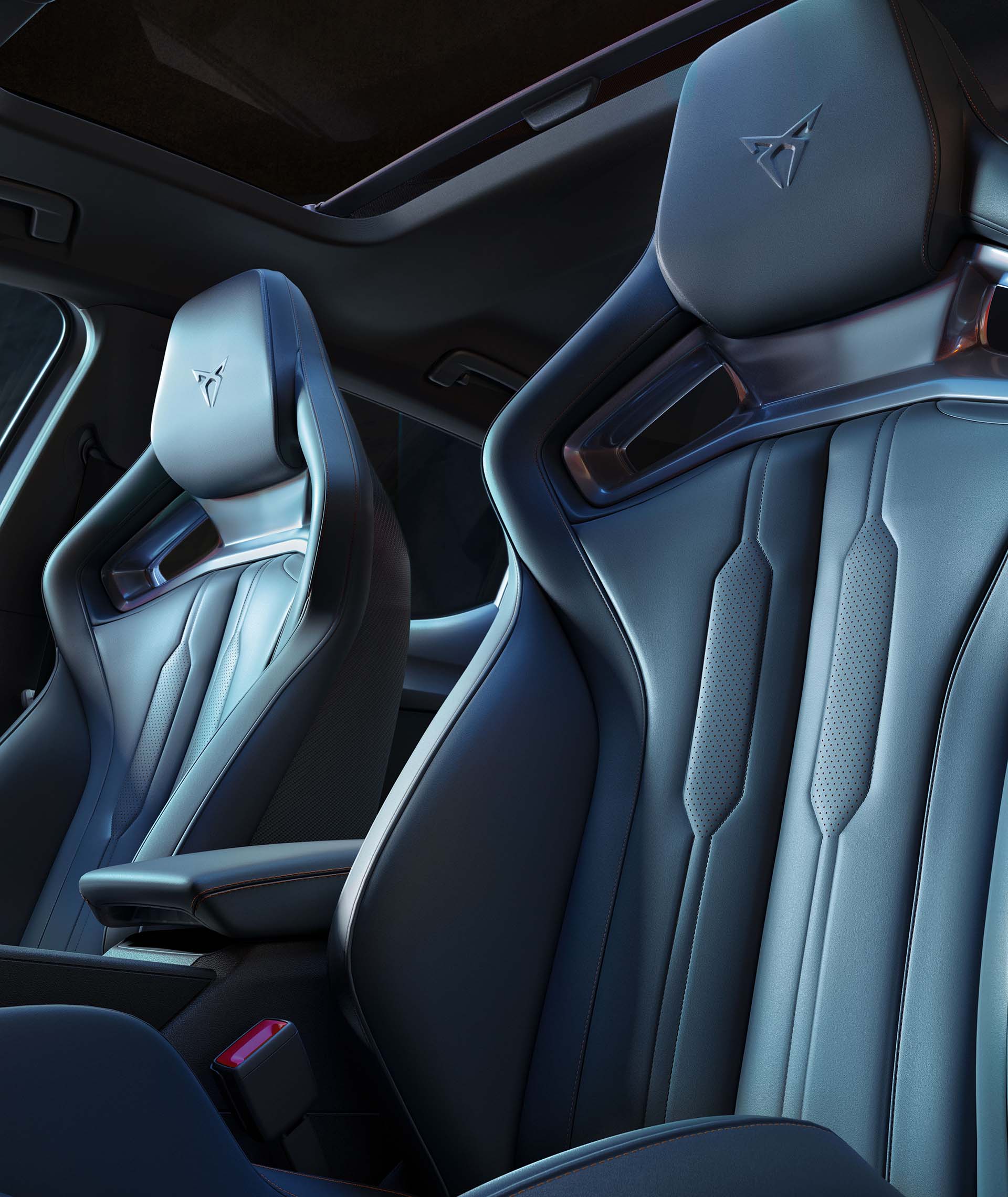 Como elementos destacados en el interior figuran los asientos CUPBucket, disponibles en cuero Negro o Azul Petrol. Vistos por primera vez en el sorprendente CUPRA Formentor VZ5, los cuales ofrecen una experiencia de conducción mejorada y más cómoda.