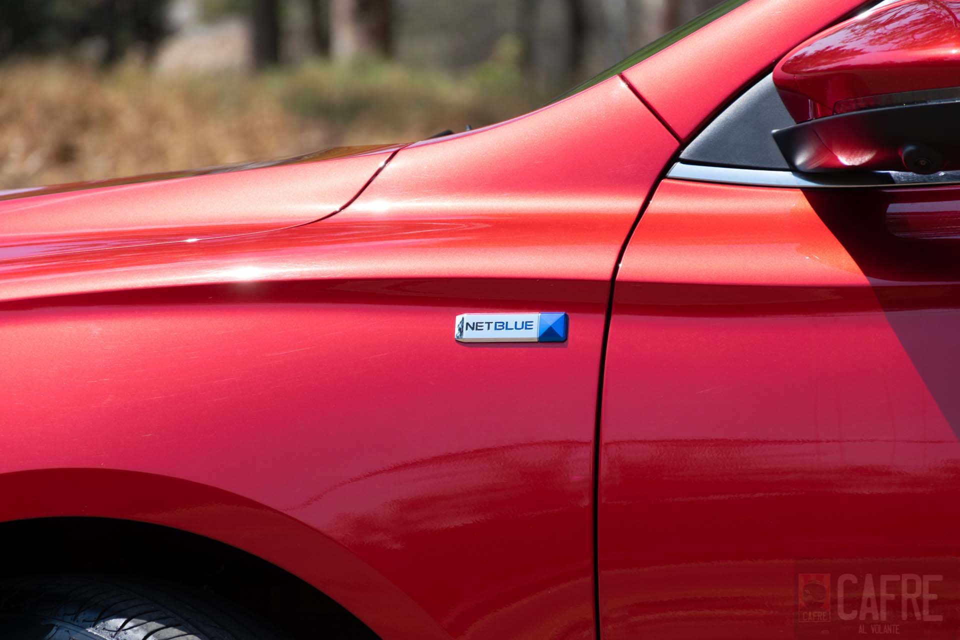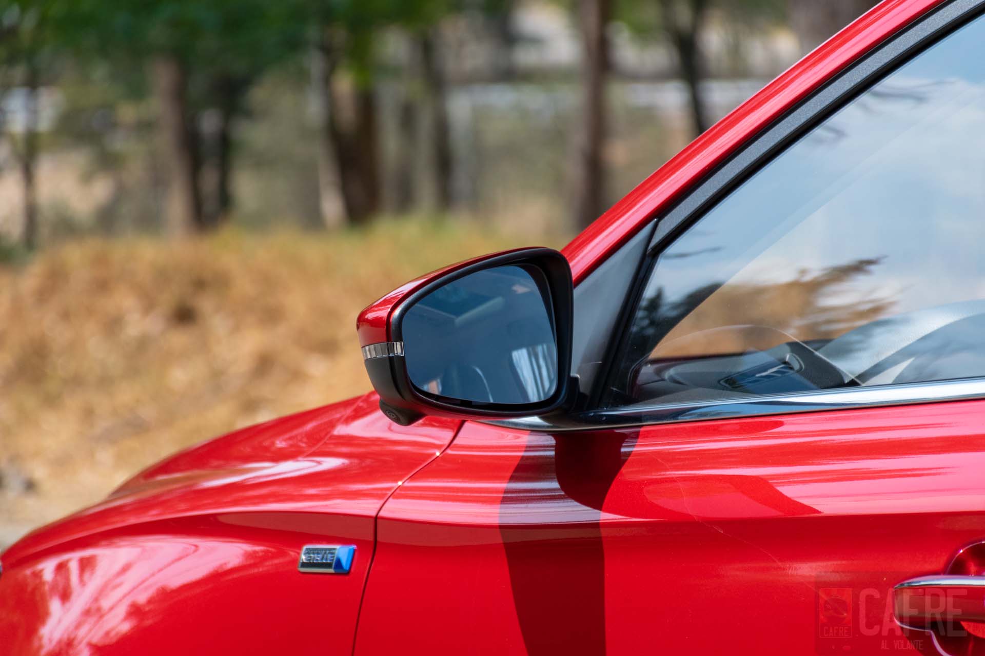A los costados, tendremos los rines de aluminio de 16 pulgadas con un diseño de rayos dobles, estos tienen un acabado en dos colores con el emblema de MG al centro. Recorriendo la silueta de este sedan de punta a punta, notaremos unas líneas muy sutiles en la carrocería para dar ese efecto de fluidez. En las salpicaderas delanteras tendremos un pequeño emblema de NETBLUE que es la tecnología que incorpora el MG 5 para tener el mejor desempeño posible con un consumo mínimo de combustible. Los espejos laterales incorporan las cámaras para la visión de 360 grados.