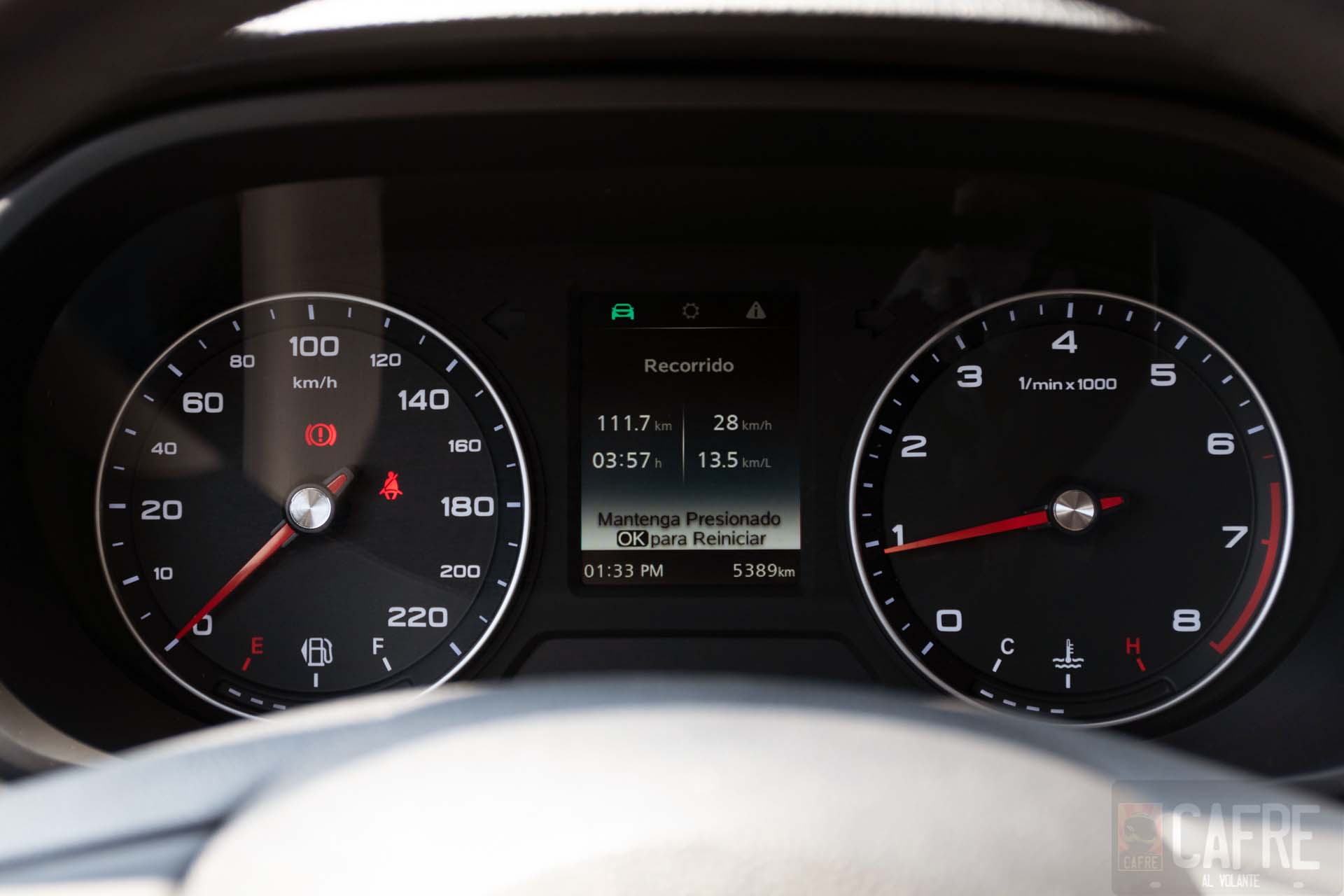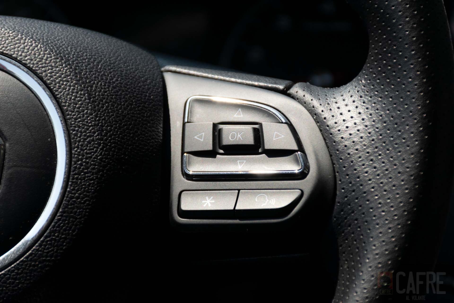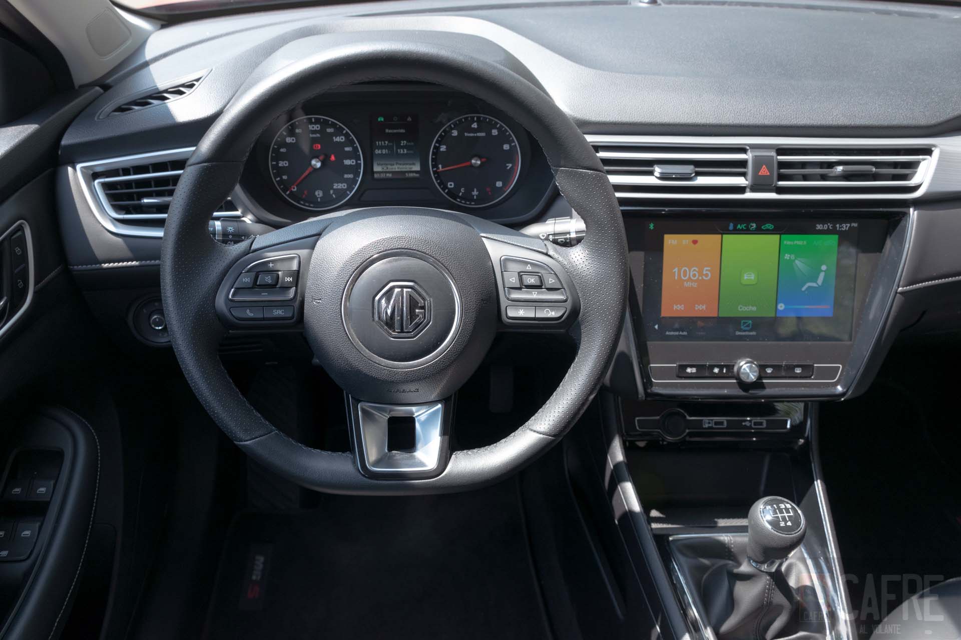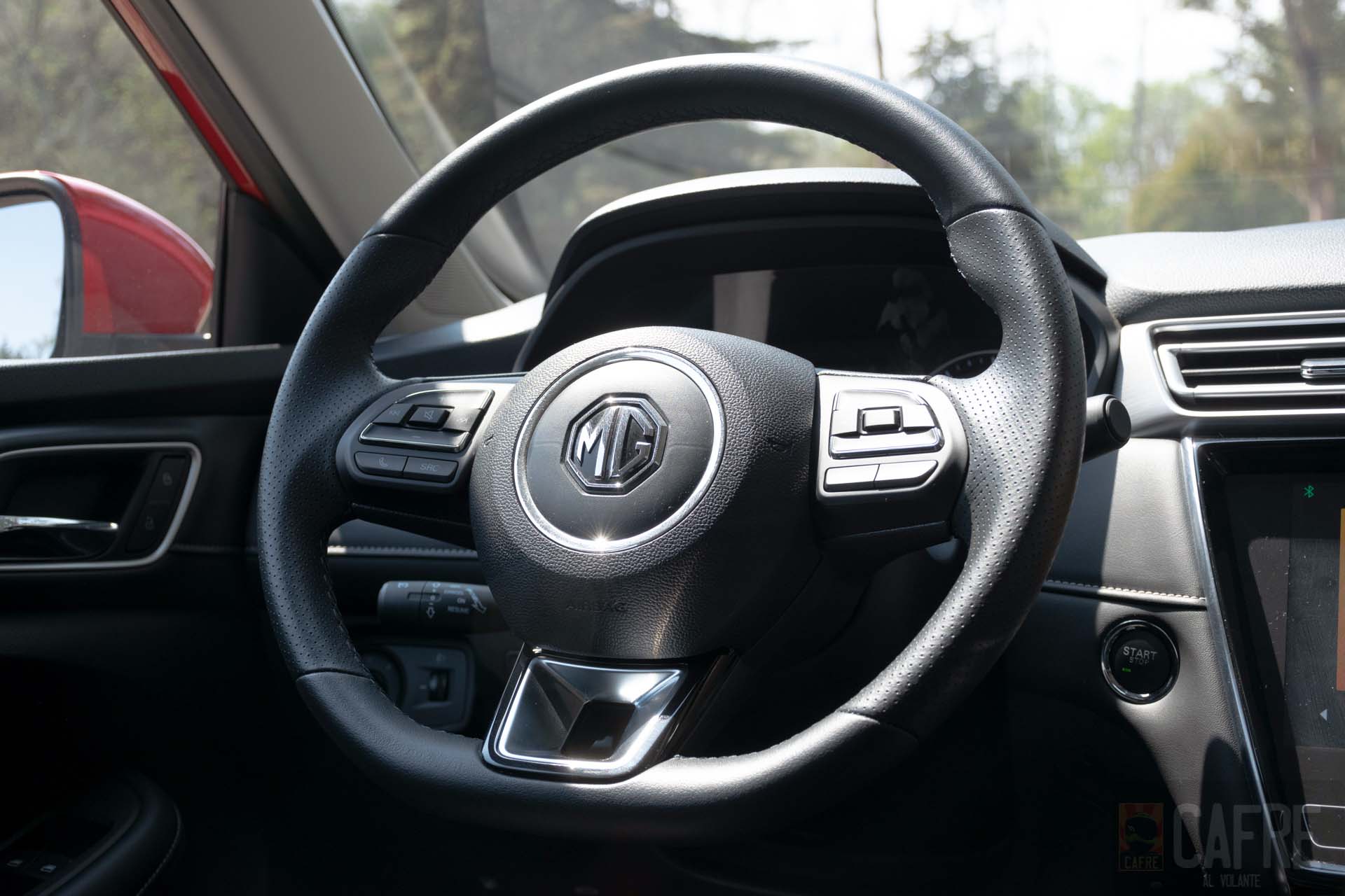 Estar en el asiento del conductor nos permite tener mejor perspectiva del equipamiento del MG 5, comenzando en la parte superior con un quemacocos eléctrico. Viendo al frente notamos el volante multifunción con un corte en “D”, este tendrá los botones para el sistema de infoentretenimiento o seleccionar las funciones de la pantalla a color de 3.5 pulgadas de la computadora de viaje. El panel de instrumentos cuenta con la información necesaria como el velocímetro y tacómetro de manera análoga con los indicadores de temperatura y gasolina en digital.