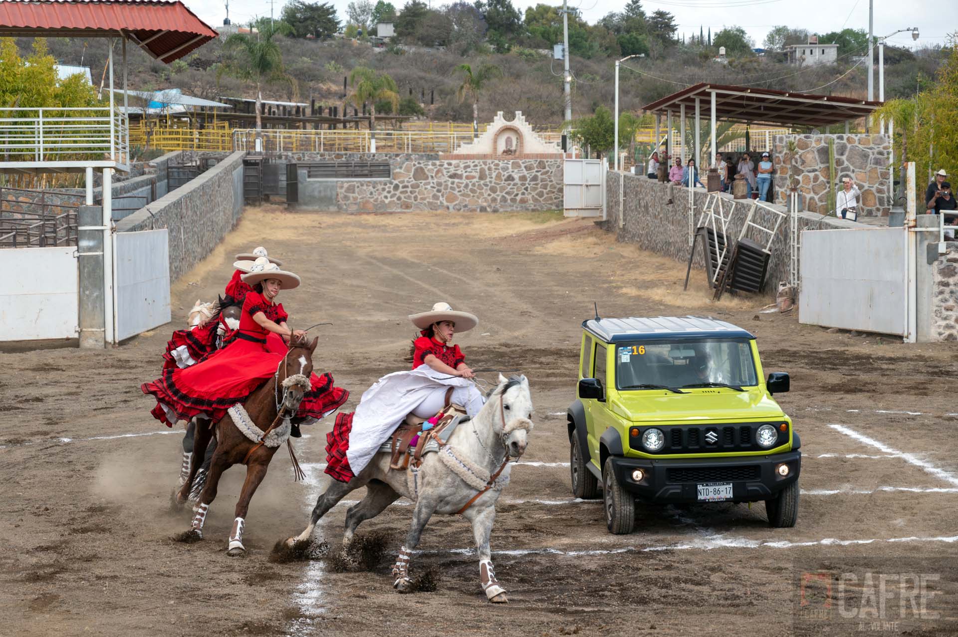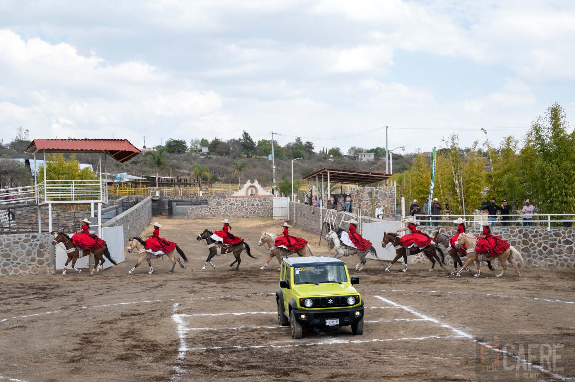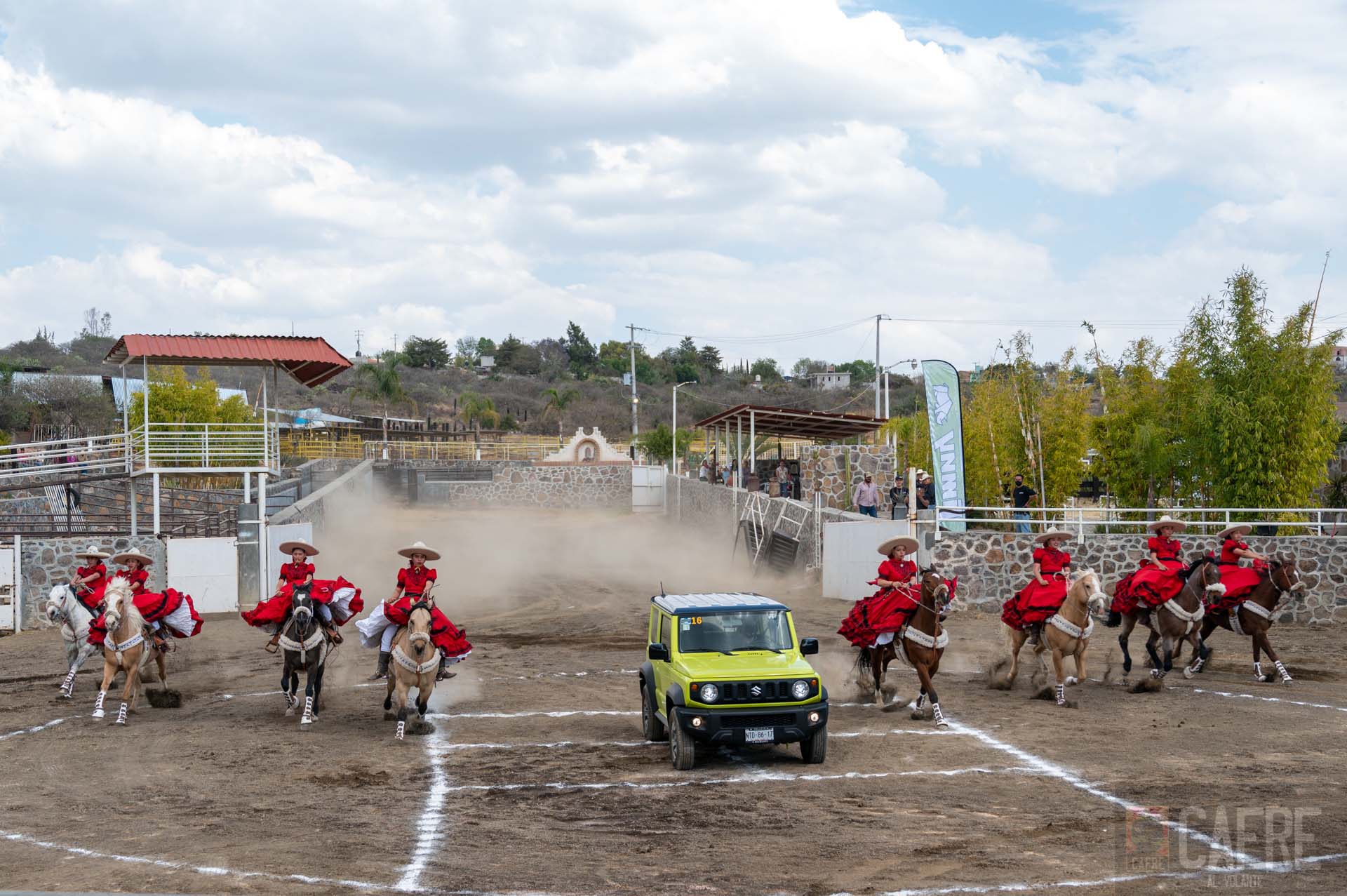 Continuando la prueba, seguíamos manejando en terracería y caminos estrechos, siendo una gran ventaja para las dimensiones del Jimny principalmente cuando había tráfico en contraflujo. Nuestro siguiente punto sería el Rancho Las Josefinas. Aquí tendríamos otras dos actividades del concurso, uno era adivinar el contenido que había en las cajas y el segundo un juego de rayuela con los sacos de arena del principio. Con motivo de nuestra visita a este rancho, tuvimos una presentación de charrería, el floreo de reata y las escaramuzas, que sin duda nos llenaron de orgullo al ser un deporte nacional. Acabando estas presentaciones fue el momento de la comida y el cambio de piloto (al fin iba a tomar fotos de la prueba).