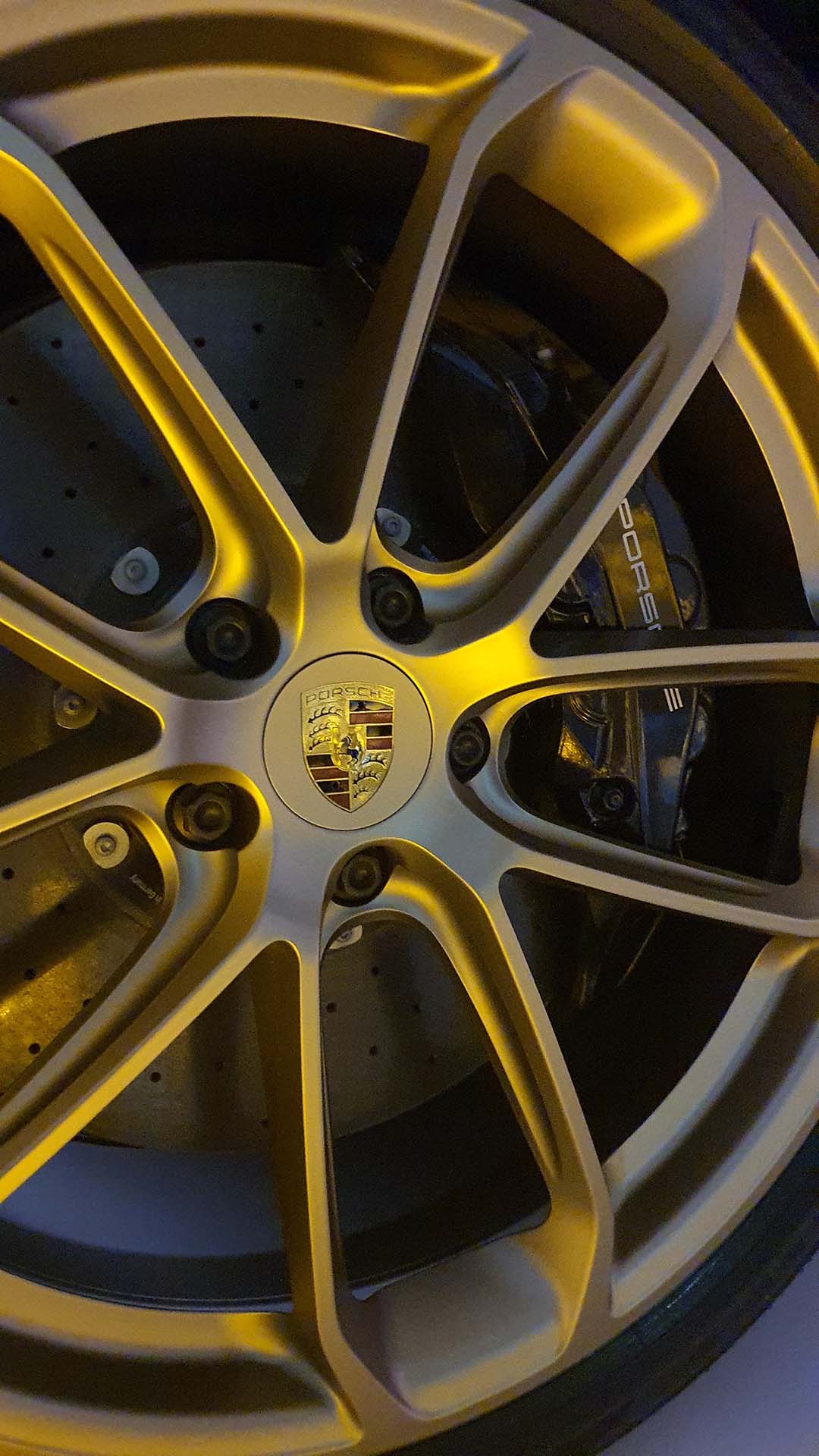 El resultado es un agarre y una estabilidad aún mejores, además de una mayor precisión en curvas de alta velocidad. En línea con todo ello, el sistema Porsche Torque Vectoring permite un rango mayor en el par que envía a cada rueda. La optimización del eje delantero también tiene un efecto positivo en el comportamiento. En comparación con el Turbo Coupé, los rines de delanteros son más anchos y la caída negativa (camber) fue incrementada en 0,45 grados. Con esto se logra que los nuevos neumáticos Pirelli P Zero Corsa de 22 pulgadas, desarrollados específicamente para el Turbo GT, tengan una superficie de contacto mayor. El nuevo modelo lleva de serie el sistema de frenos Porsche Ceramic Composite Brake (PCCB).