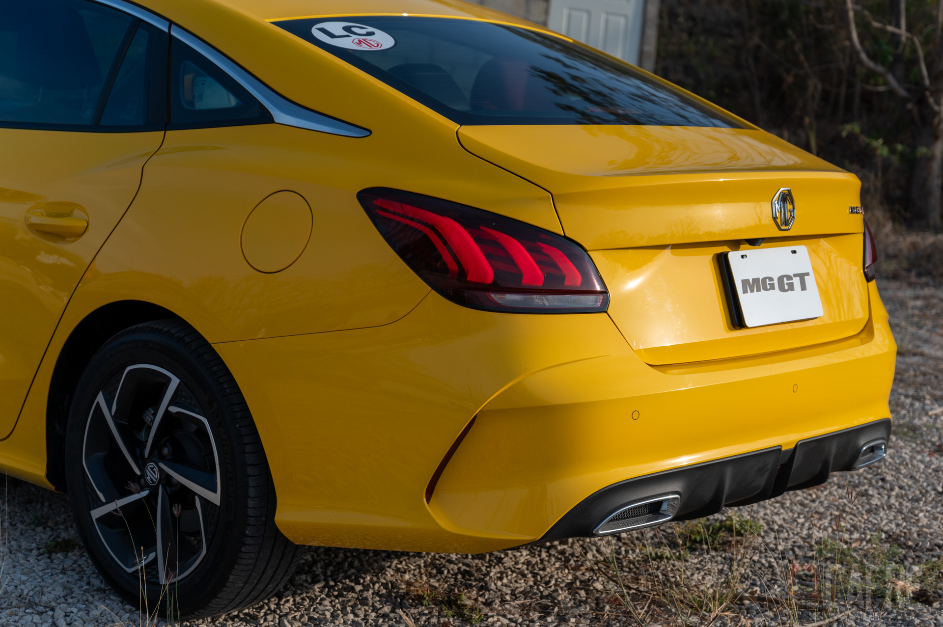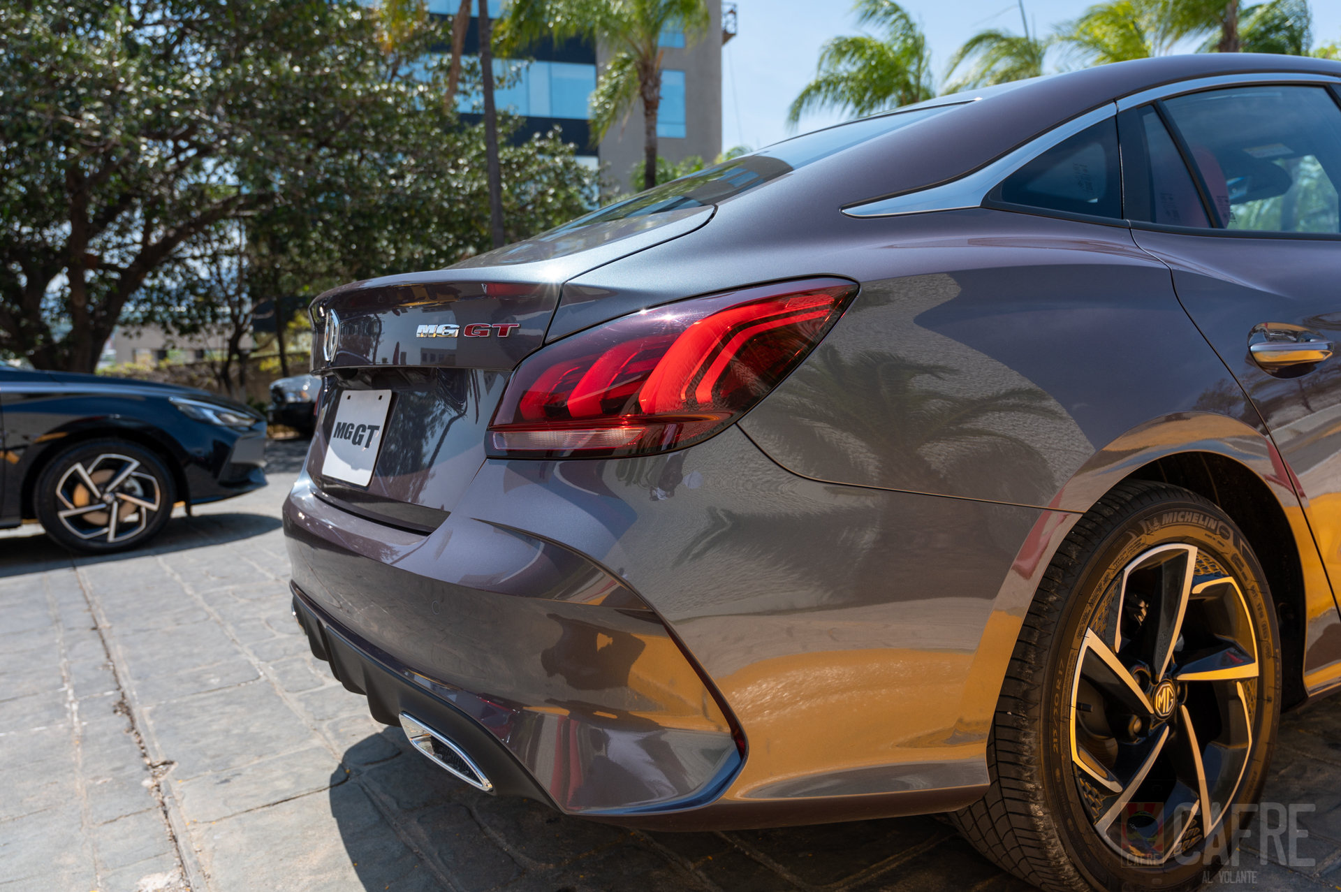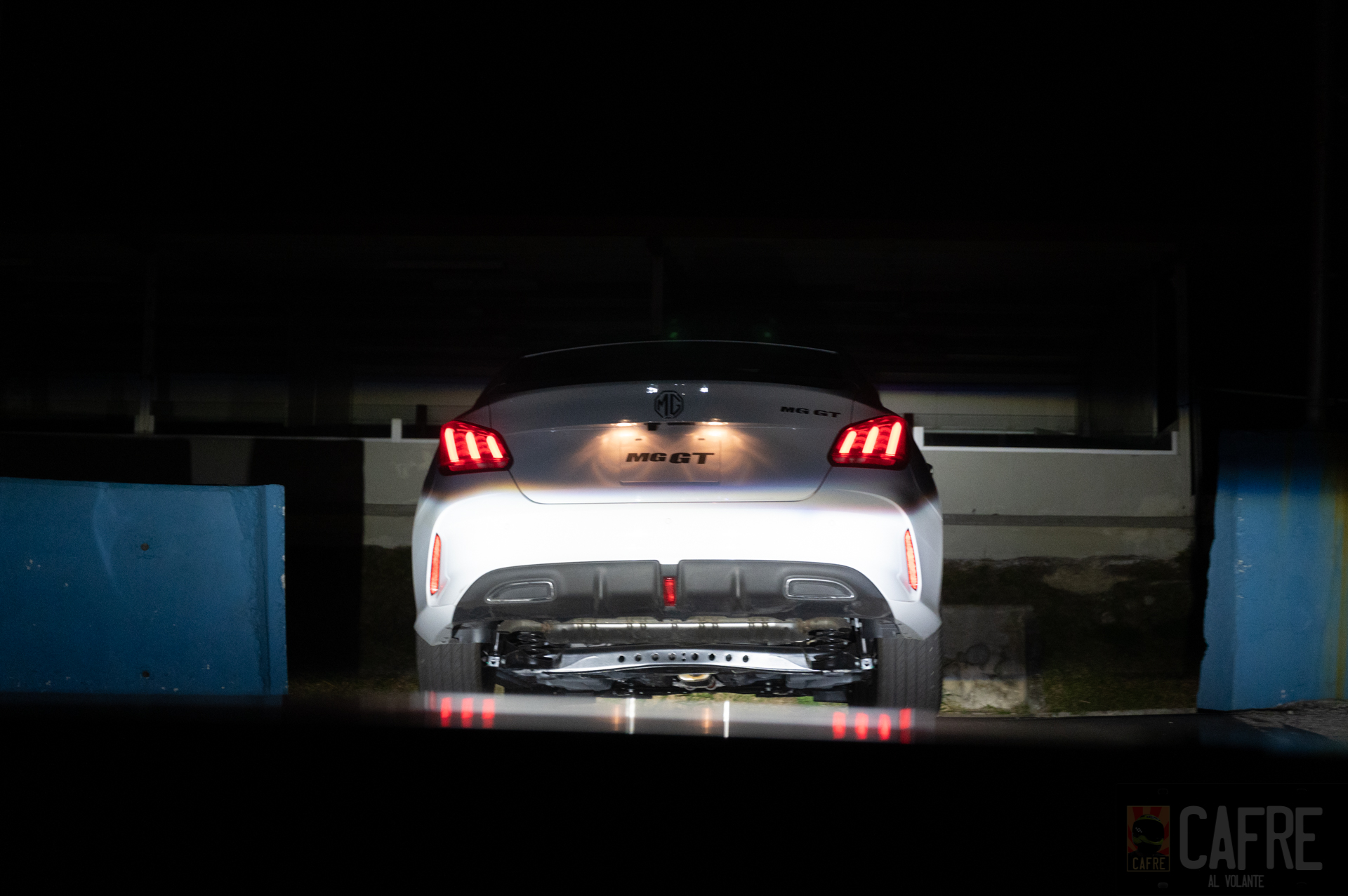 La parte trasera da un aspecto coupé/sport back por la inclinación del medallón trasero y la cajuela, las luces traseras de led tienen una iluminación de flechas para las luces nocturnas. Al filo de la cajuela tendremos los emblemas de MG y MG GT y en la parte inferior de la fascia tendremos la simulación de salidas de escapes, sin duda el aspecto deportivo lo tiene.