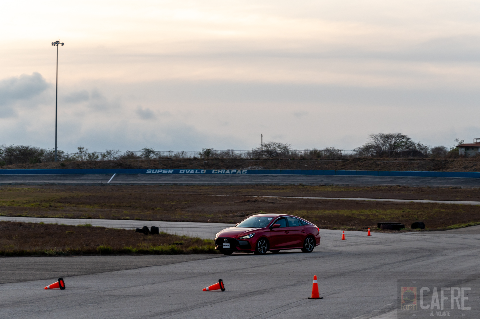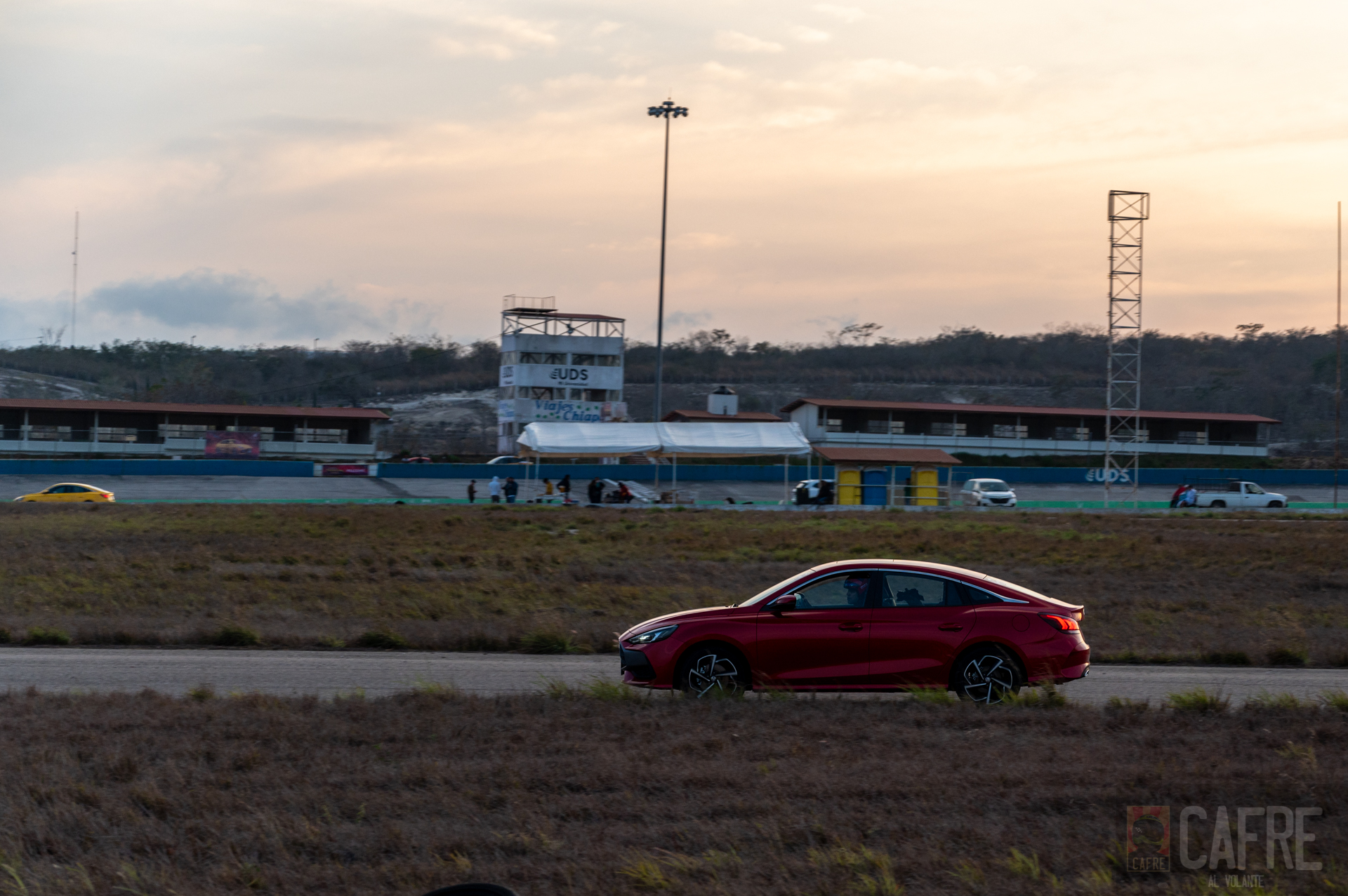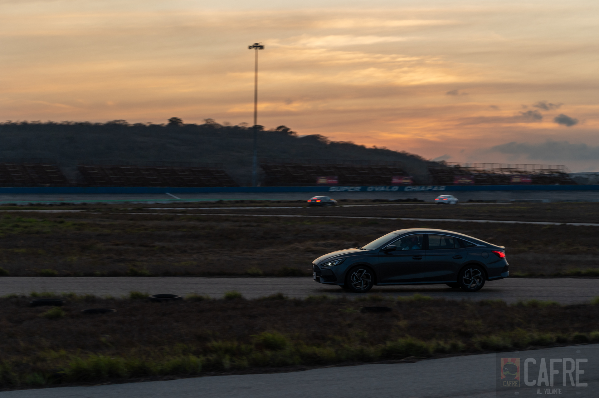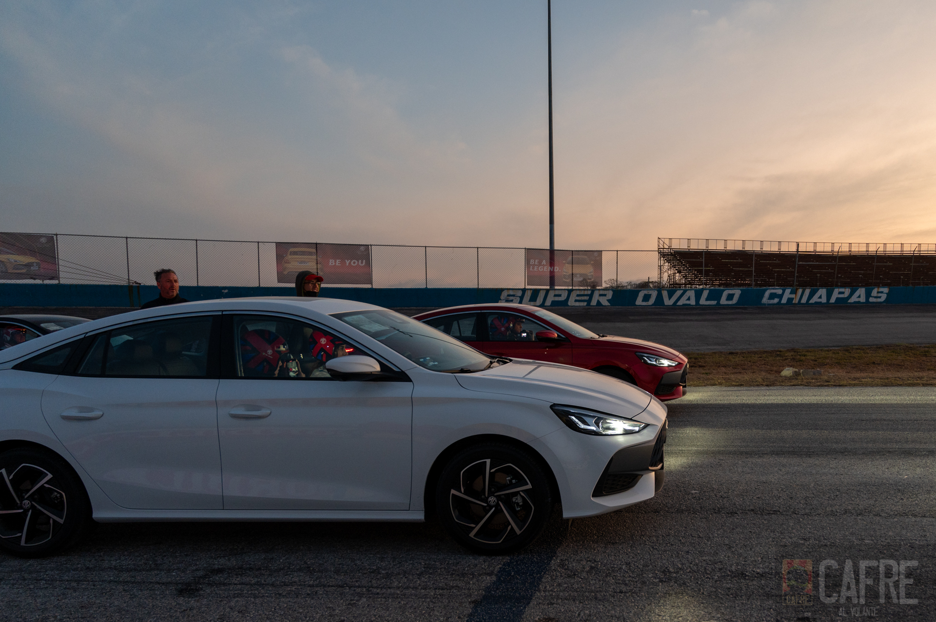 Para poner a prueba toda la capacidad deportiva del MG GT, llegamos al Super Óvalo de Chiapas, MG nos tenía preparadas dos actividades en esta pista, la primera fue una vuelta en un circuito interno donde pudimos exigirle a la dirección, suspensión y frenos principalmente. Algo que nos sorprendió mientras buscábamos hacer una vuelta perfecta fue lo controlado que se sentía al entrar rápido a una curva, eso sí, había momentos en donde se manifestaban las asistencias en el tablero (principalmente el control de estabilidad). La segunda actividad fueron los arrancones de 1/8 de milla, aquí nos enseñaron un método para poder simular un launch control, consistía pisar el freno con el pie izquierdo y acelerar el motor a las 2,300 revoluciones, para que al soltar el pedal tuviéramos el turbo trabajando y así disponer de todo el torque que este generaba. Como última actividad en el autódromo había la posibilidad de dar vueltas rápidas en el óvalo, pero con el instructor conduciendo, aquí aprovechamos para tomar fotos mientras los autos iban en el peralte.