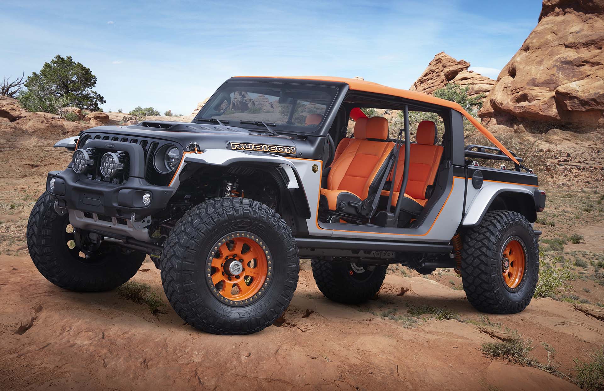 Basado en un Jeep JT Rubicon, los rasgos más notables de esta pickup no son lo que lleva, sino lo que le falta. Se han quitado las cuatro puertas y los pilares B para disfrutar de la máxima libertad al aire libre. Además, se ha realizado una perforación sobre el techo rígido original y se ha colocado una cubierta estirada en la parte superior para ofrecer protección contra los elementos y permitir el paso de la luz natural.