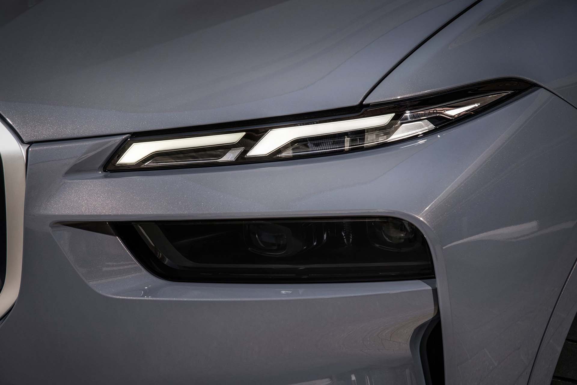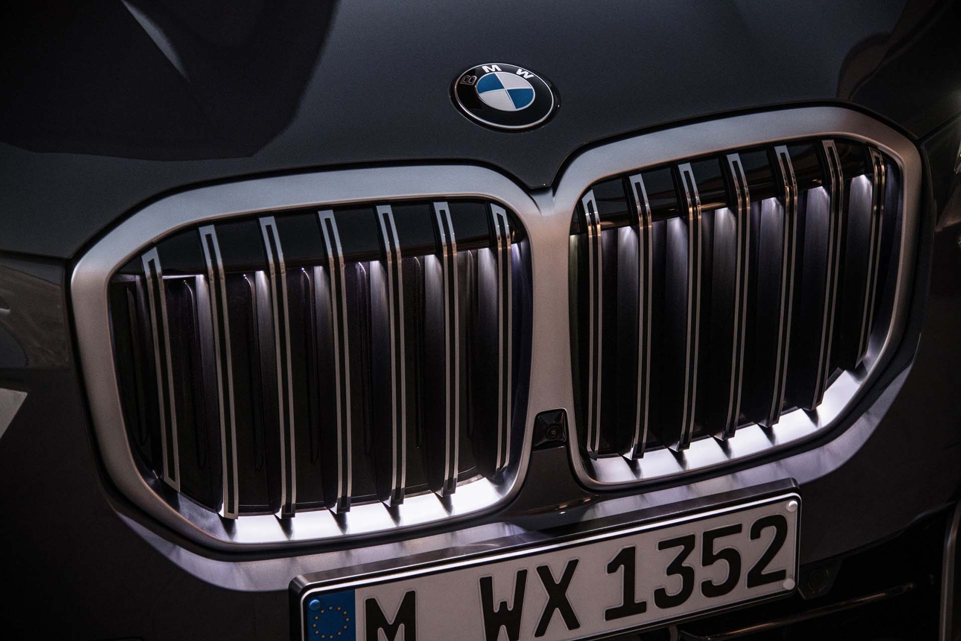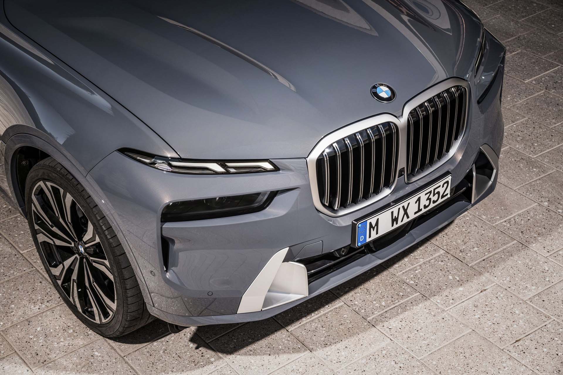 Las unidades de faros divididos están haciendo su debut en el nuevo BMW X7. Los elementos de luces LED horizontales colocados más arriba en la parte delantera albergan la luz de posición, las luces de conducción diurna y los indicadores de señal de giro. Las unidades LED ubicadas debajo de ellos para las luces de cruce y de carretera dan la impresión de retirarse al fondo con su carcasa oscura y su posición profundamente incrustada en el faldón delantero, y solo pasan a primer plano cuando se activan. Los nuevos faros LED de matriz adaptativa con luz de carretera no deslumbrante y distribución de luz adaptativa ahora también brindan la funcionalidad de las luces antiniebla delanteras con su luz automática de mal tiempo.