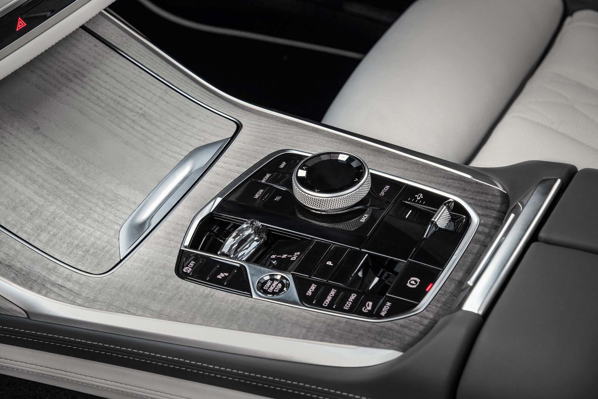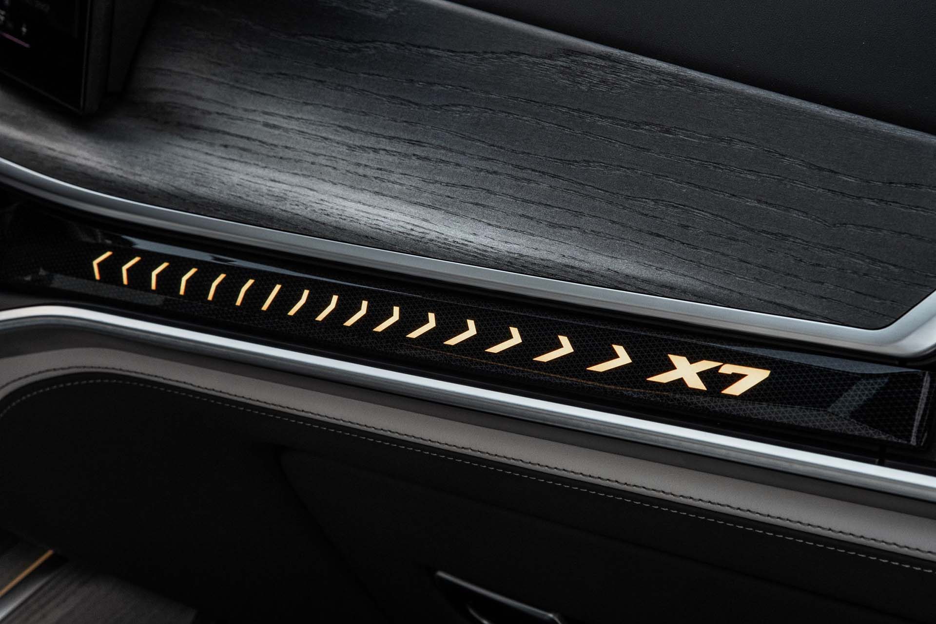 Juntos, el panel de instrumentos de nuevo diseño, con sus salidas de aire delgadas y una barra de luz ambiental incluida de serie en su sección inferior, y la pantalla curva de BMW aportan un estilo moderno moldeado por la digitalización progresiva a la cabina. La innovadora luz se complementa con la luz ambiental de serie. Su eficaz retroiluminación, con la ayuda de unidades LED y un gráfico que incluye las letras “X7” (o el logotipo M en el nuevo BMW X7 M60i xDrive), es un elemento integral de los efectos de luz basados en la situación y realza el aura de exclusividad dentro de la cabina. La palanca selectora de marchas también recibe un nuevo y vanguardista diseño.