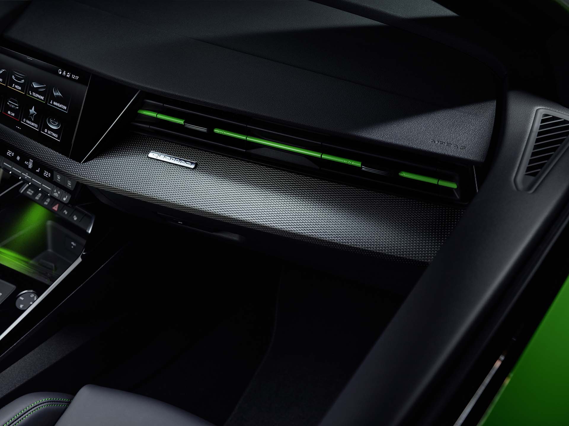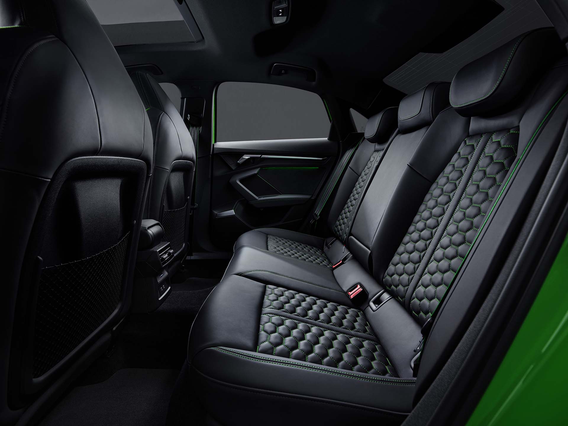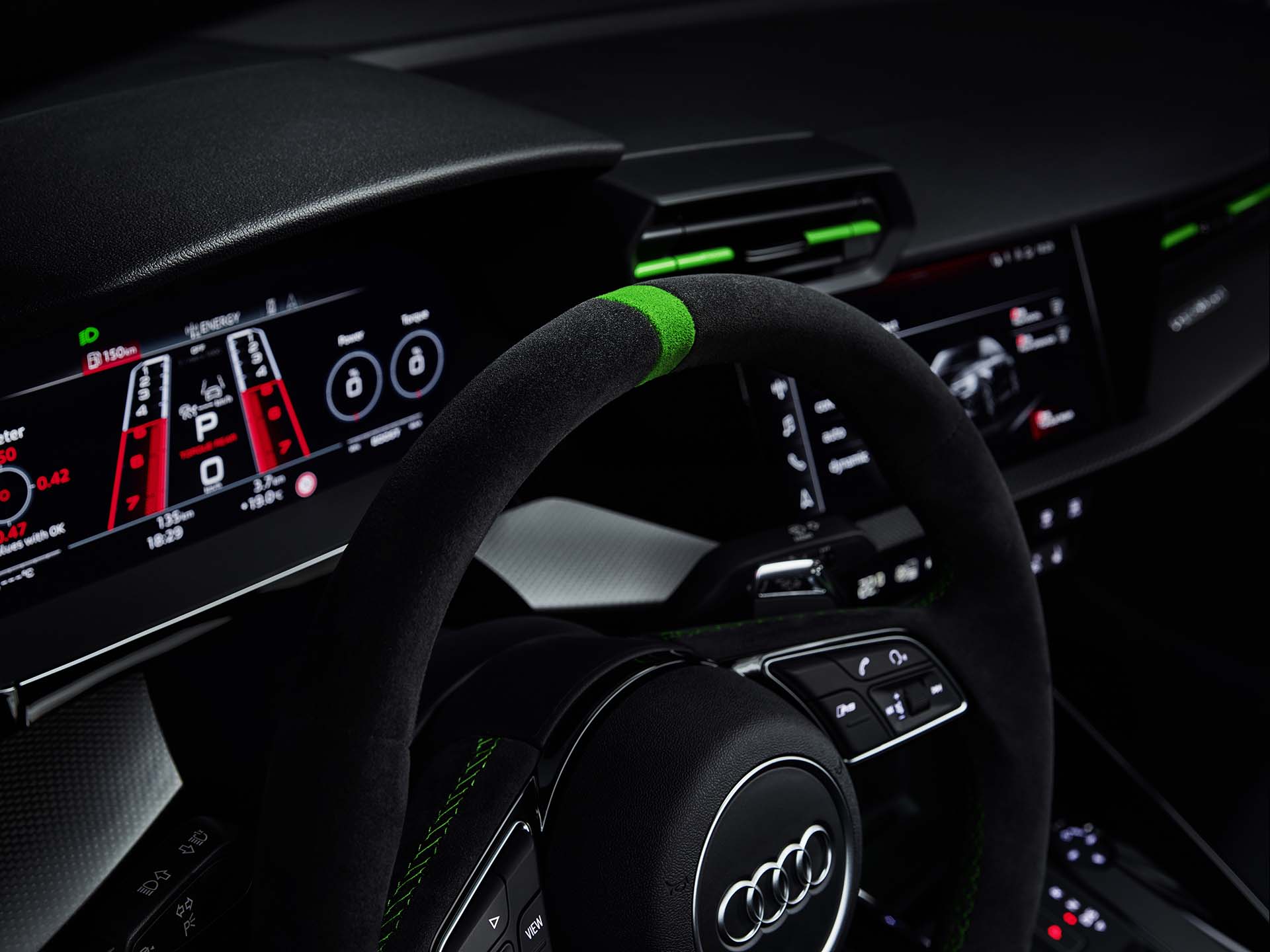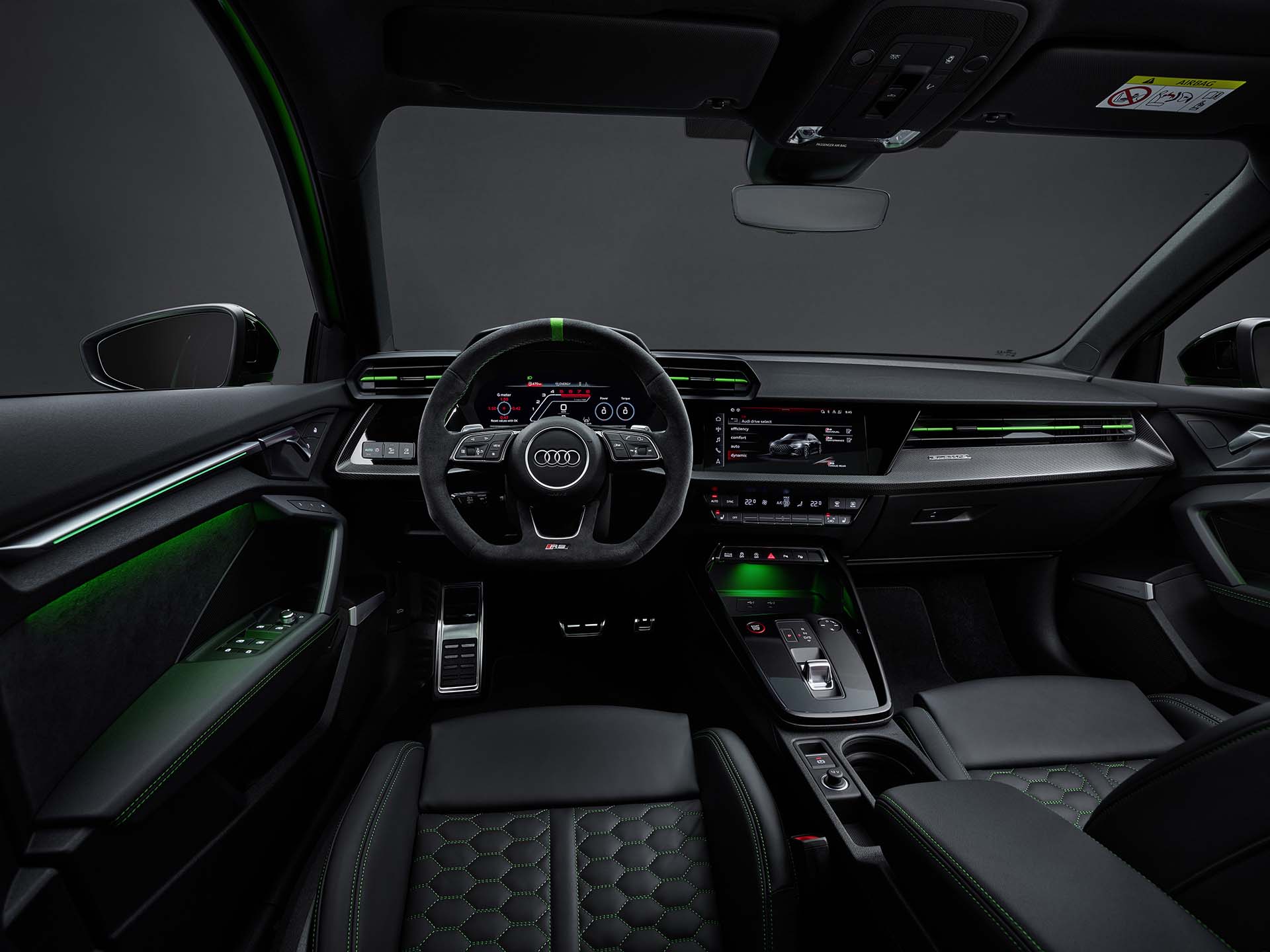 El aviso de cambio de marcha específico RS en el modo de cambio manual va modificando la visualización de las revoluciones de color verde a amarillo y a rojo, parpadeando de forma idéntica a la utilizada en competición para indicar el momento ideal para cambiar de marcha. Esta funcionalidad también se integra en el head-up display opcional, disponible por primera vez para el RS 3, que proyecta información relevante sobre el parabrisas dentro del campo visual directo del conductor. La pantalla táctil de 26 cm (10.1 pulgadas) en el tablero también incluye información sobre las temperaturas del refrigerante, del lubricante del motor y de la transmisión, así como fuerzas g y la presión de los neumáticos. La genuina sensación de competición se ve reforzada por el tablero de fibra de carbono y los asientos deportivos con logos. La tapicería de los asientos está disponible en piel Nappa fina con logotipos RS en forma de panal de abeja y costuras de contraste en negro brillante, rojo o, por primera vez, verde. Hay disponibles paquetes de diseño RS a juego en rojo y verde que incluyen alfombrillas especiales con costuras de contraste y bordado RS, así como cinturones de seguridad con bordes de color. El paquete de diseño RS incluye los laterales de los asientos en rojo o verde y un toque de color en las salidas de aire.