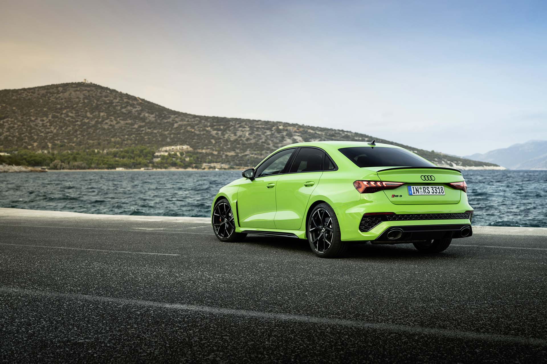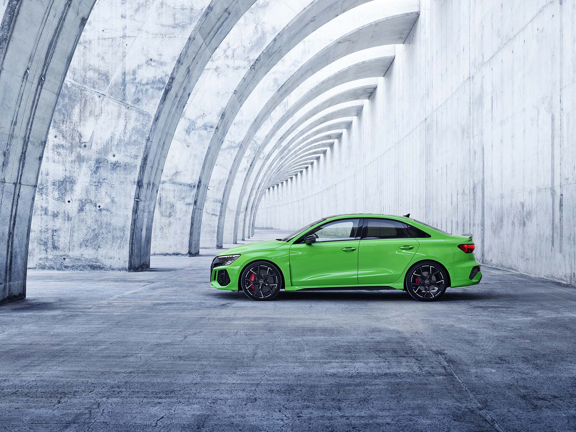 El diseño del nuevo Audi RS 3 es aún más dinámico y llamativo que el de su predecesor. En el frontal, la rediseñada parrilla Singleframe con su distintiva rejilla en forma de panal y las grandes tomas de aire confieren al compacto deportivo un aspecto expresivo. Detrás de las salpicaderas delanteras hay una gran salida de aire adicional que recuerda a un auto de competición. El RS 3 equipa de serie faros Matrix LED de diseño plano en forma de cuña y luces traseras LED con intermitentes dinámicos. Los faros cuentan con biseles oscurecidos y sus ángulos exteriores dibujan hacia abajo la luz diurna digital. Con su disposición de píxeles de 3 x 5 segmentos LED, proporcionan un aspecto inconfundible: al abrir el vehículo aparece en el faro izquierdo la inscripción RS 3 y una bandera a cuadros en el derecho, creando una representación dinámica. Al conducir, la bandera a cuadros se ilumina en ambos lados. El RS 3 está equipado de serie con rines de 19 pulgadas con diseño de 10 radios en Y. Los de 5 radios con el distintivo RS, disponibles opcionalmente, representan un auténtico diseño de competición que también inspira la parte trasera rediseñada con un difusor integrado y el sistema de escape RS con dos grandes salidas ovaladas. Algunos elementos de la carrocería, como las carcasas de los espejos retrovisores, las inserciones de los estribos y los spoilers de la cajuela o del borde del techo están disponibles en polímero reforzado con fibra de carbono para un aspecto aún más deportivo. El nuevo Audi RS 3 se puede solicitar en un total de ocho colores de carrocería, incluyendo dos colores exclusivos RS: verde Kyalami y gris Kemora.