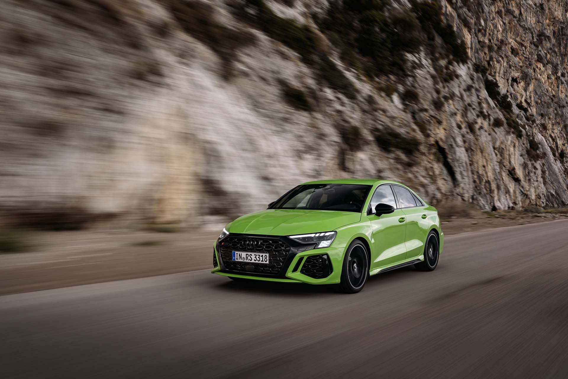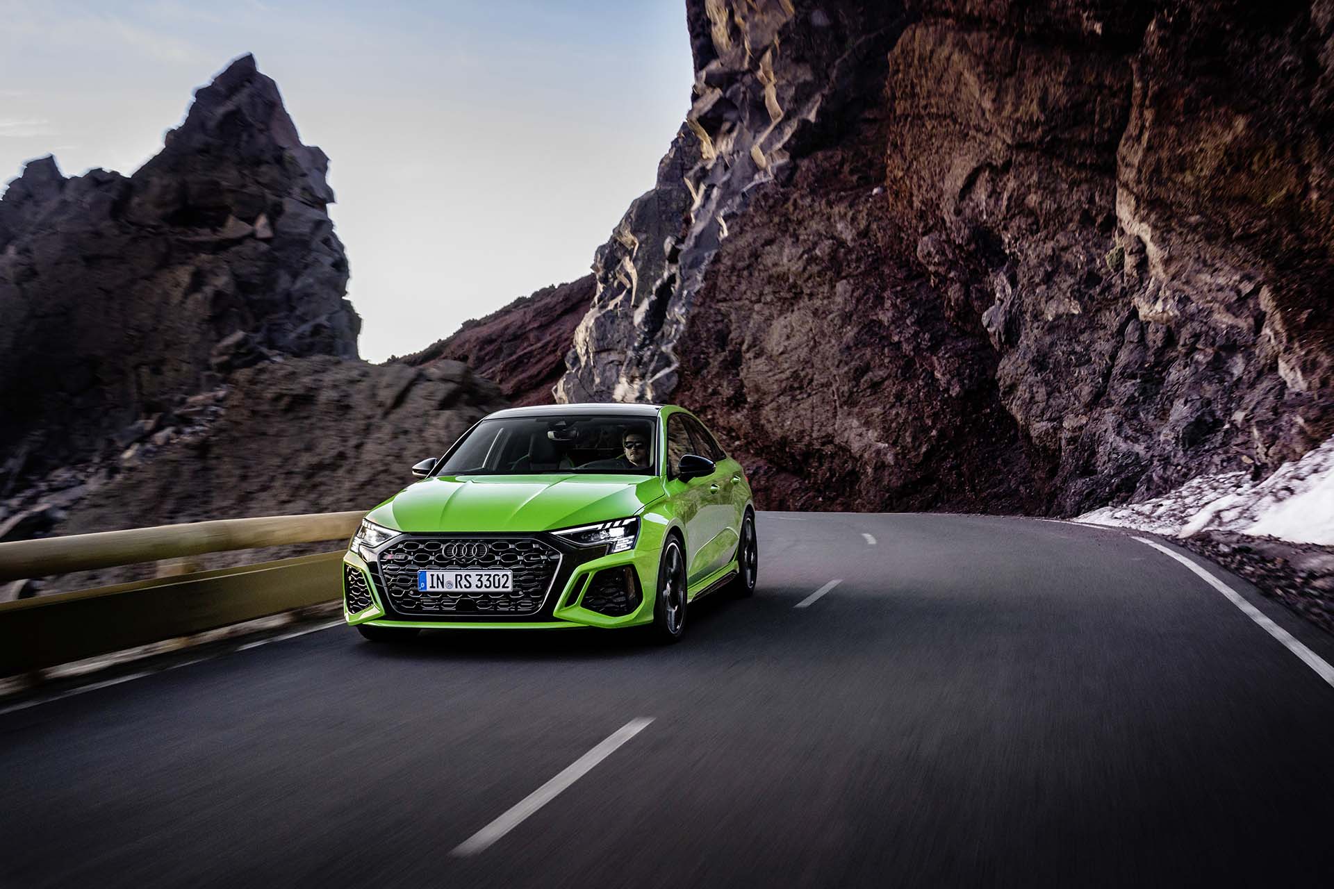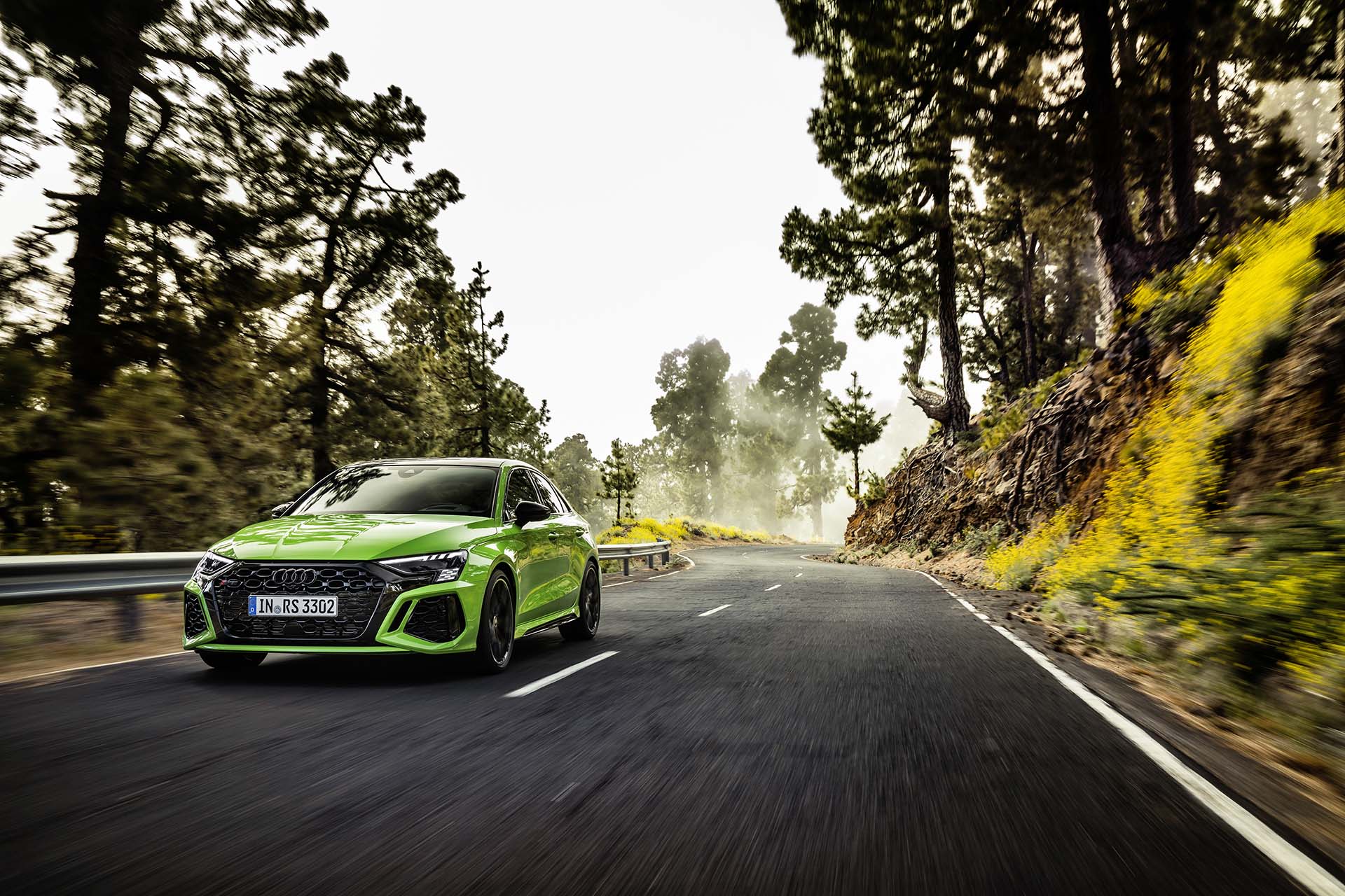 Con su motor de cinco cilindros de altas prestaciones, el Audi RS 3 es único en su clase. El 2.5 TFSI ha ganado nueve veces consecutivas el premio “Motor Internacional del Año”. Ahora, la última generación del deportivo compacto, es más potente que nunca. Esto se debe, sobre todo, al aumento de par motor hasta 500 Nm, disponibles entre 2,250 y 5,850 rpm, lo que supone un incremento de 20 Nm respecto a su predecesor. La potencia máxima, de 400 hp (294 kW), está disponible a un régimen inferior que antes, 5,850 rpm, y se mantiene hasta 7,000 rpm. El nuevo RS 3 acelera de 0 a 100 km/h en solo 3.8 segundos gracias al Launch Control, tres décimas de segundo más rápido que la generación anterior. Su velocidad máxima está limitada a 250 km/h, cifra que puede aumentarse hasta 290 km/h con un paquete opcional. Junto a la aceleración, son cifras de referencia en el segmento de los deportivos compactos.