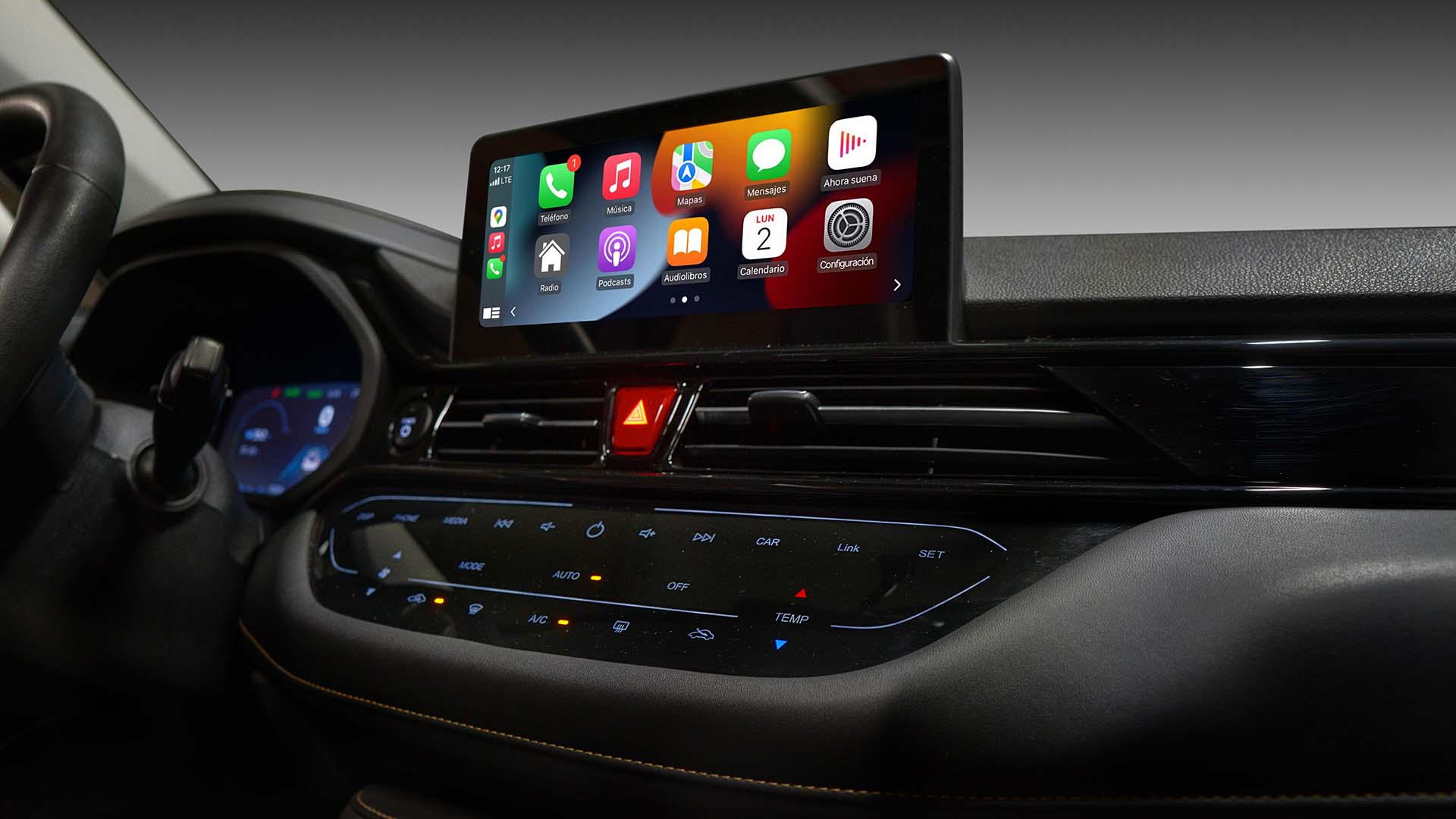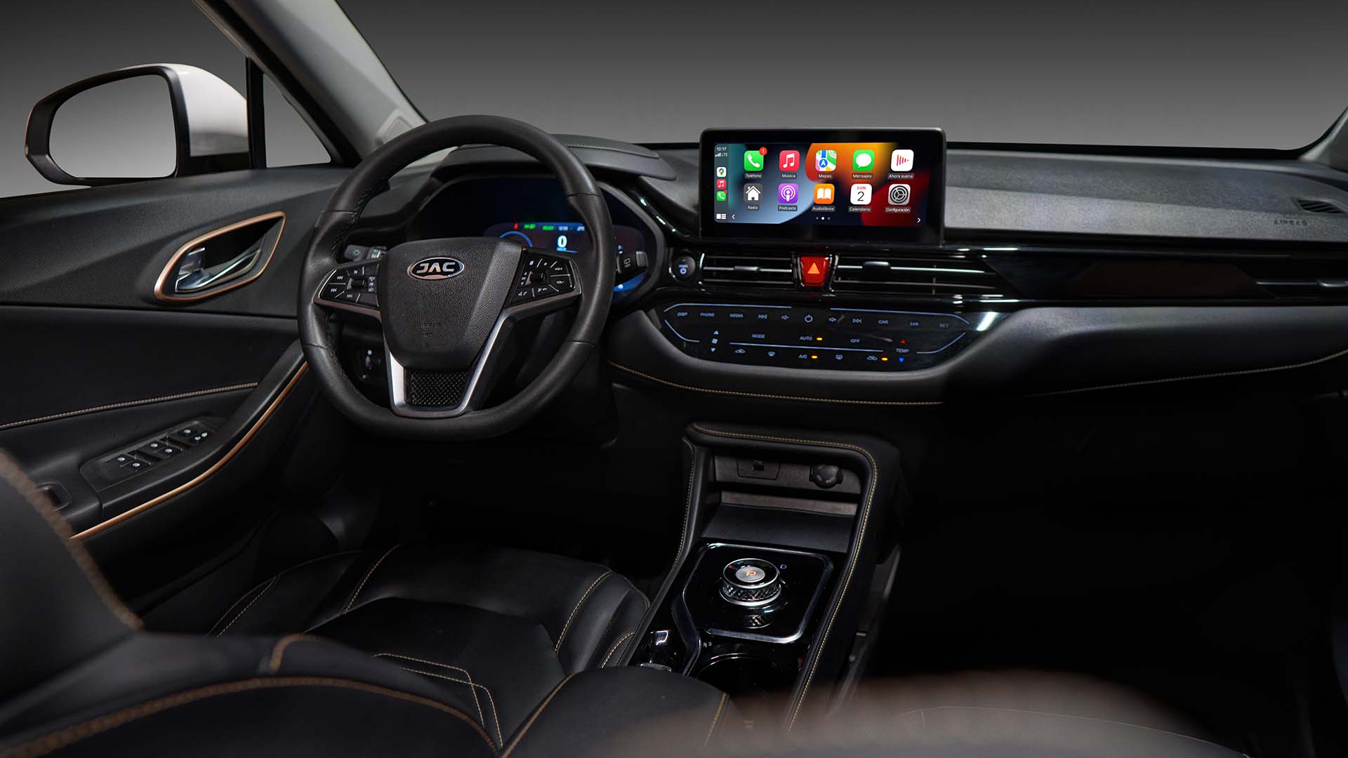 El interior JAC E Sei4 Pro, cuenta con una pantalla multimedia flotante de 10.25” y sistema de infoentretenimiento con Apple CarPlayTM y Android AutoTM, además de 6 bocinas y una consola digital táctil, el clúster digital cuenta con tres modos de personalización. El selector de marchas también es nuevo en este modelo, incluyendo un diseño ergonómico y estilizado.