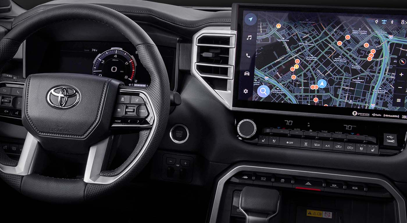 Al interior de Tundra, destaca su pantalla táctil HD de 14 pulgadas, que cuenta con gran conectividad al integrar Apple Carplay y Android Auto, ambos inalámbricos, que se suman al Bluetooth dual para dos teléfonos simultáneos. En su tablero encontrarán una pantalla multi-información de 12,3 pulgadas, que permite visualizar la información fácilmente mejorando, así la experiencia en aplicaciones móviles al facilitar la navegación. Tundra cuenta con sistemas de carga para tus dispositivos que van desde conectores USB hasta cargador inalámbrico Qi para celulares.