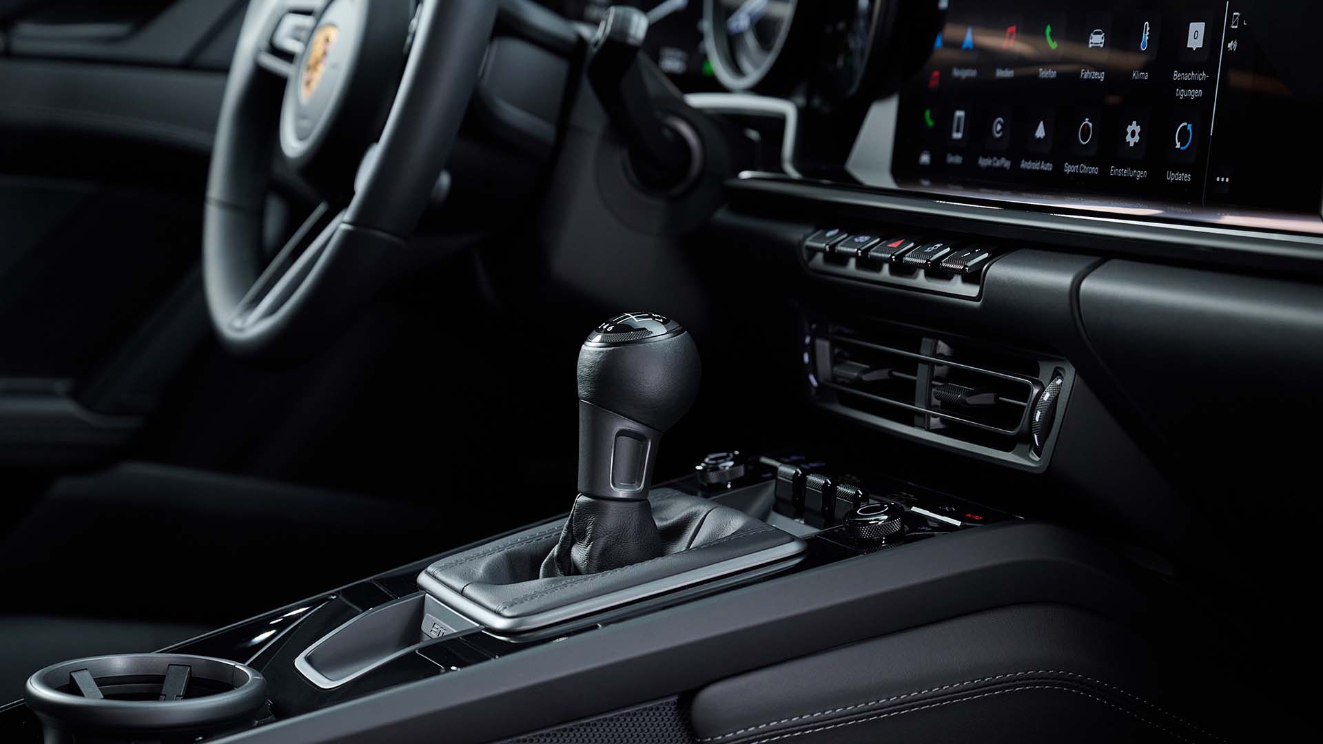 En el equipamiento específico del ‘T’ encontramos los rines Carrera S de color gris Titanio, de 20 pulgadas adelante y 21 atrás, con neumáticos 245/35 y 305/30, respectivamente. El 911 Carrera T también está equipado de serie con el volante deportivo GT, el sistema de escape deportivo y los asientos Sport Plus (ajuste eléctrico de cuatro posiciones). Con un peso de solo 1470 kilogramos, el 911 Carrera T manual es el 911 de serie más liviano con el motor de entrada, pues pesa 35 kg menos que el 911 Carrera, que tiene de serie el cambio PDK de ocho velocidades. Esa versión no está disponible con cambio manual. Además de eliminar los asientos traseros y reducir el aislamiento, el peso se reduce aún más al emplear cristales y batería más livianos.