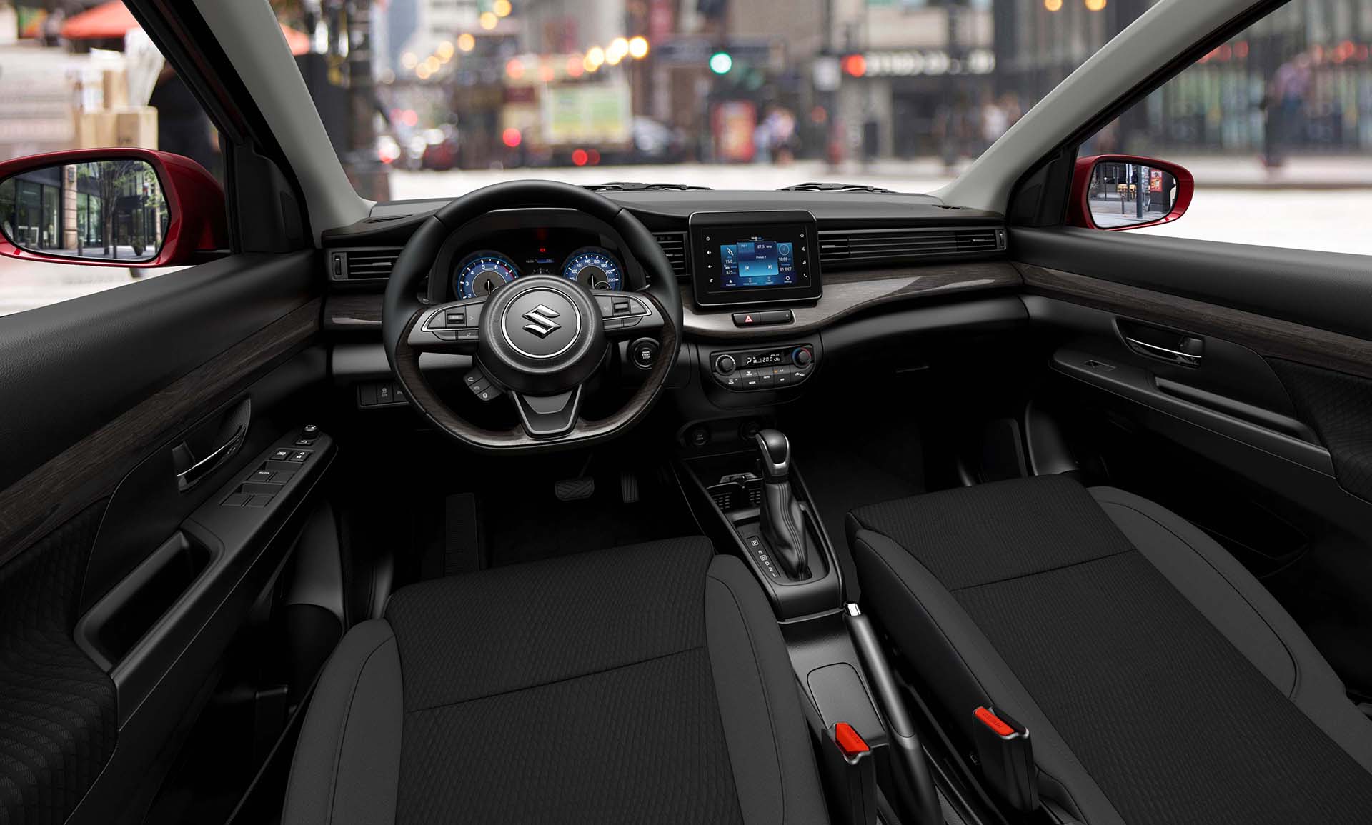 En el exterior se aprecia una nueva parrilla con acabado piano black, el logo SUZUKI de mayor tamaño; faros de halógeno multireflector, luces diurnas con tecnología LED; faros de niebla; rines de aleación de aluminio de 16” con neumáticos de baja resistencia al rodamiento.