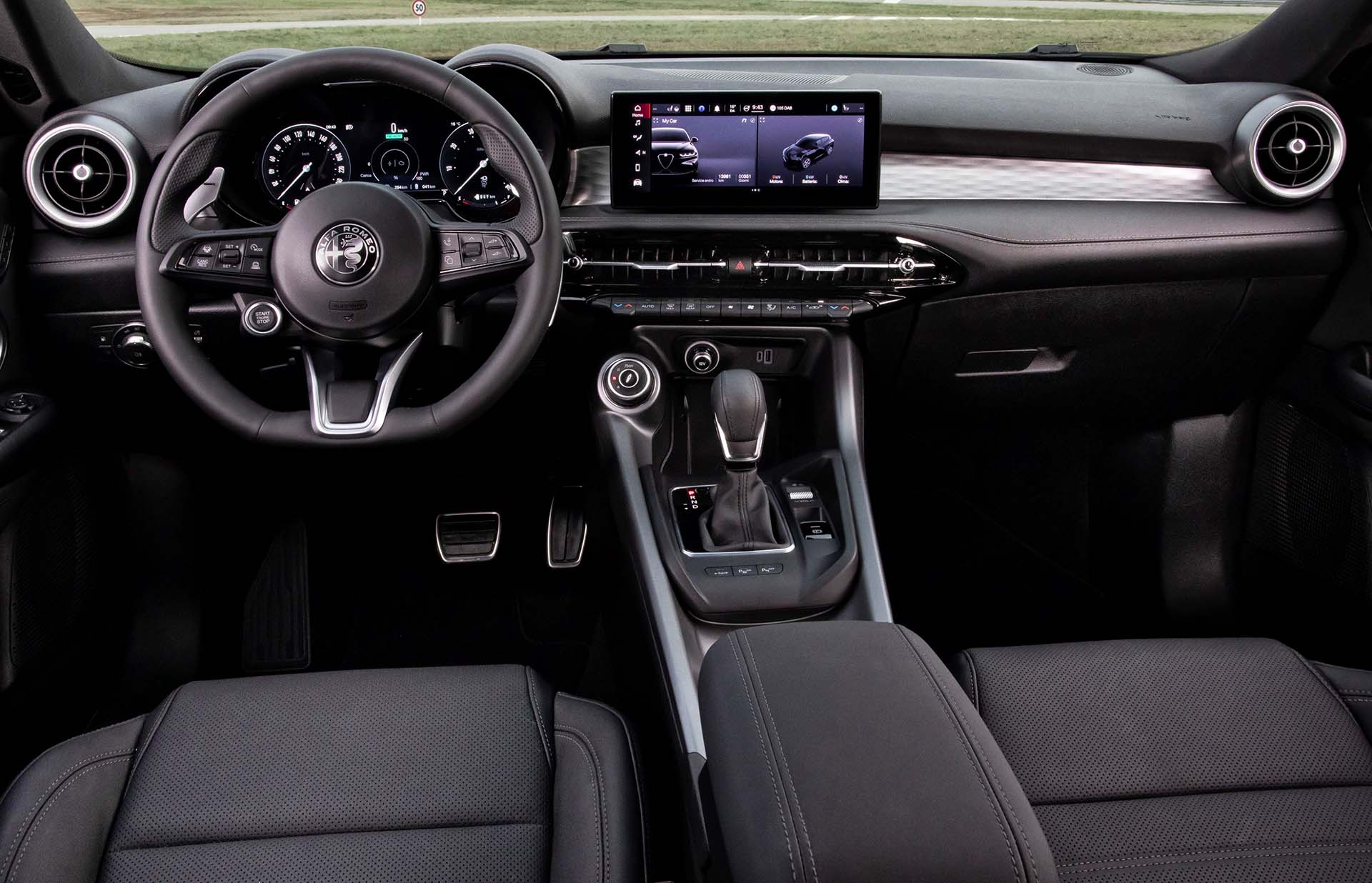 - Tablero con diseño de efecto carbono y el logotipo de Alfa Romeo iluminado.