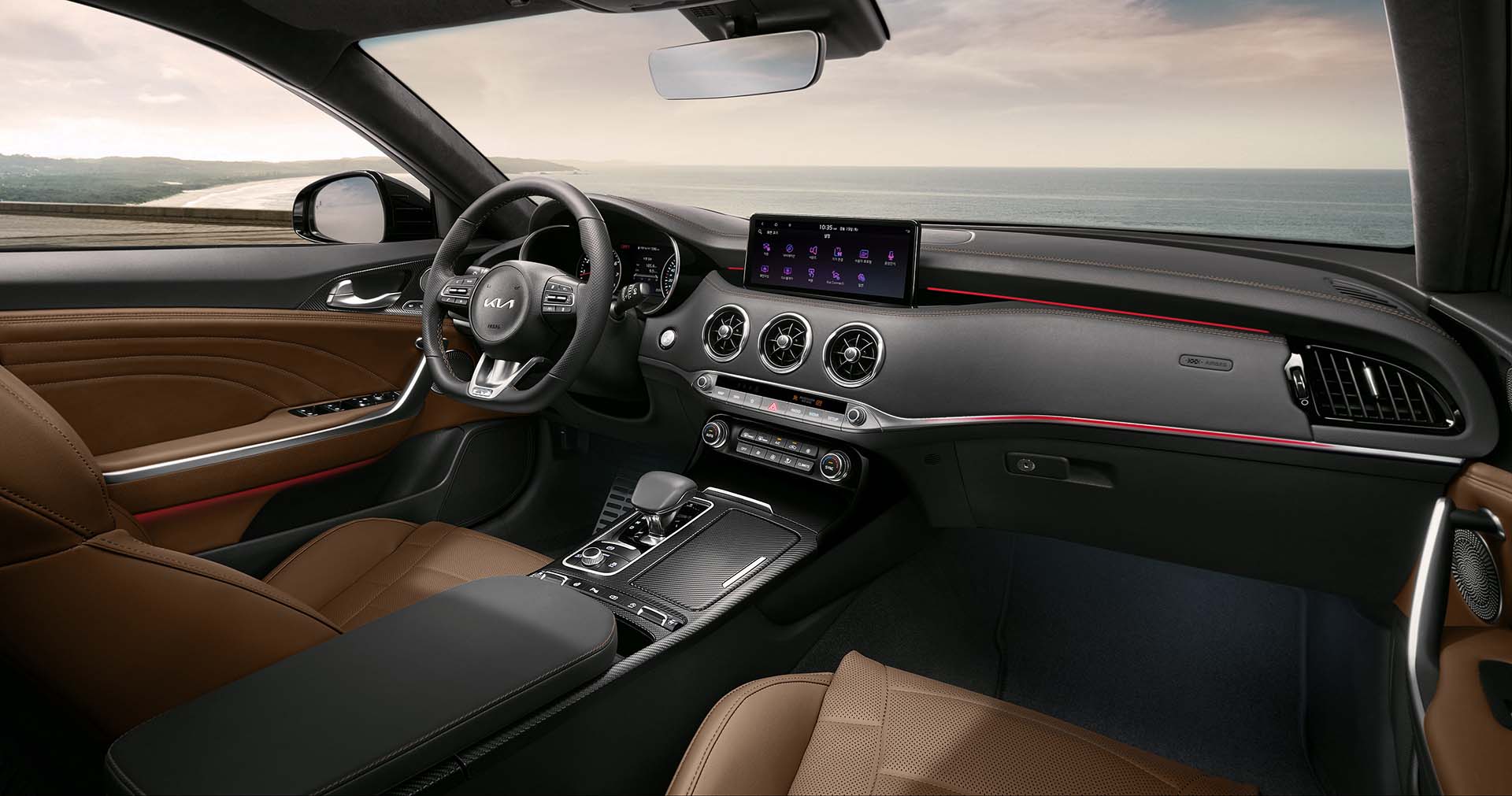 En el interior, una colección de mejoras de diseño y materiales cuidadosamente seleccionados mejora aún más el ambiente deportivo de la espaciosa y moderna cabina del Stinger. El cuero marrón terracota enriquece los asientos deportivos, y el atemporal atractivo de dicho material se extiende a otros elementos como: volante, revestimiento lateral de puertas y las manijas de las puertas. Además, los diseñadores de Kia han aplicado un acabado con efecto de carbono a la cubierta superior de la consola y los paneles de las puertas para complementar el tapizado en cuero Terracota.