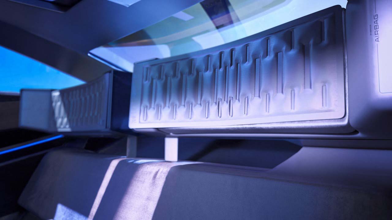 Los asientos y el suelo están revestidos de un terciopelo muy especial, 100% poliéster reciclado, con un brillo muy metalizado para jugar con la luz que difunde la cápsula de cristal. Este material es 100% reciclado. Para complementar las nuevas vistas que ofrecen las posturas de los asientos y la visión despejada hacia la carretera, este terciopelo se extiende hasta el suelo. Luego se imprime con patrones 3D para actuar como una alfombra de piso. La continuidad entre los asientos y el suelo se puede conseguir con un único material. La impresión 3D sobre este textil flexible es revolucionaria y 100% reciclable, realizada en colaboración con STRATASYS.