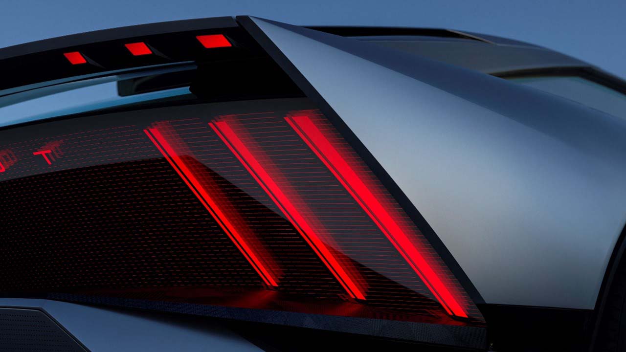 La parte trasera, que refleja la nueva firma frontal, ha recibido un tratamiento de muy alta tecnología, con las tres garras que parecen entrar en el coche infinitamente, gracias a las dos capas de vidrio. Esto proporciona un efecto verdaderamente mágico. La parte trasera del PEUGEOT INCEPTION CONCEPT destaca la sutil escultura de las alas, marcada por una línea sencilla que se prolonga en una curva generosa y sensual.