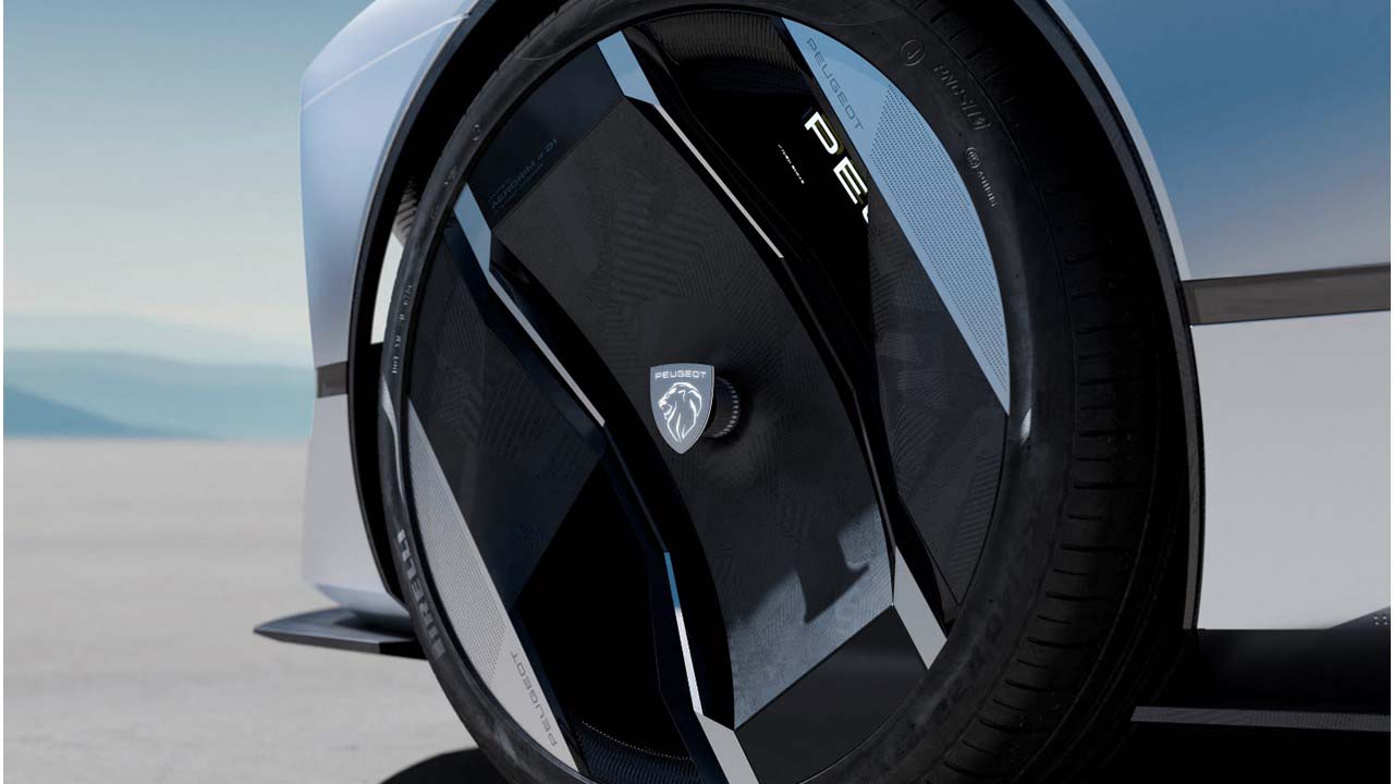 Las llantas «AERORIM» del PEUGEOT INCEPTION CONCEPT combinan de manera brillante aerodinámica y estética. Están diseñadas sobre una simetría axial, al igual que las llantas de 20 pulgadas del nuevo PEUGEOT 408. Las inserciones textiles forjadas contribuyen al esfuerzo aerodinámico, mientras que las inserciones de aluminio con microperforaciones subrayan el aspecto muy tecnológico del diseño. El emblema del León iluminado permanece estático cuando se gira el volante. Dentro de la rueda, la pinza de freno está cubierta con un espejo de vidrio. Este peculiar aspecto de diseño hace eco de las partes de vidrio del Hypersquare, la parte delantera y la parte trasera del PEUGEOT INCEPTION CONCEPT.