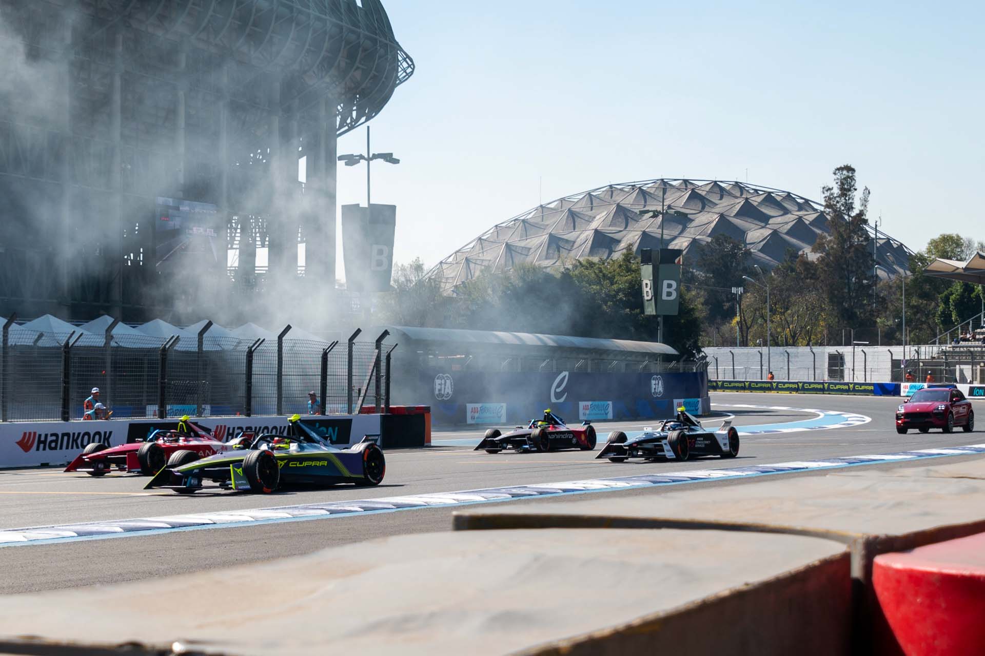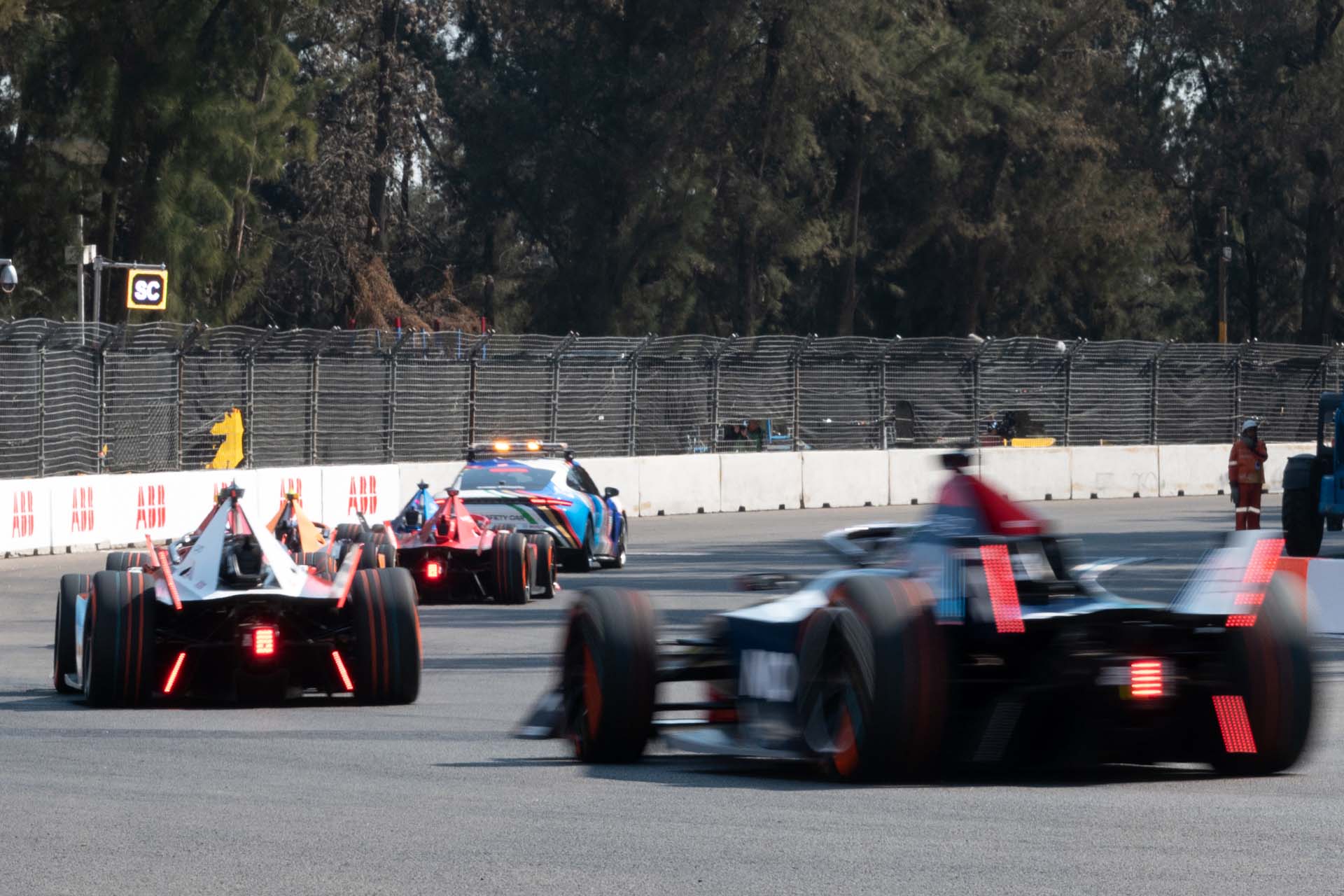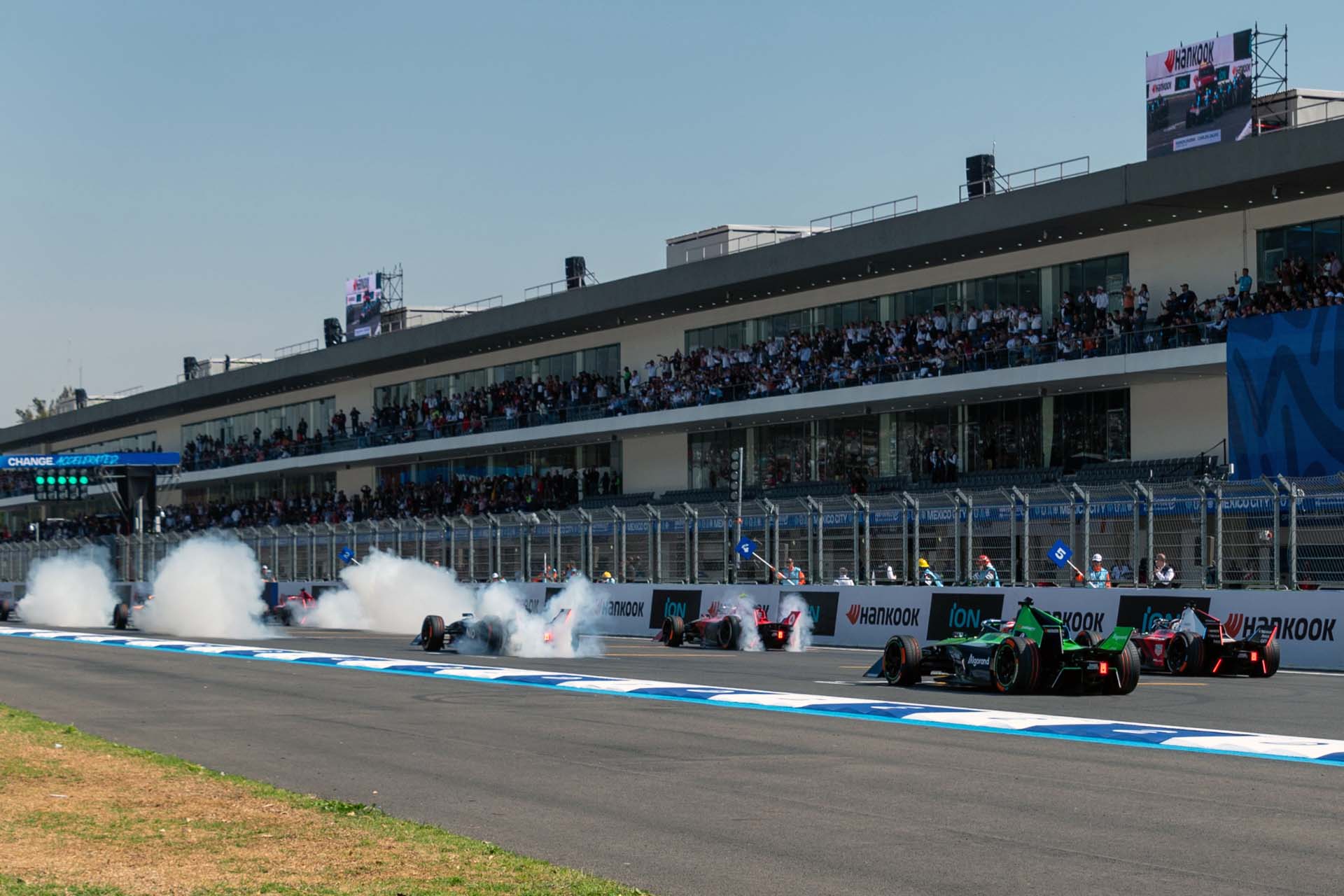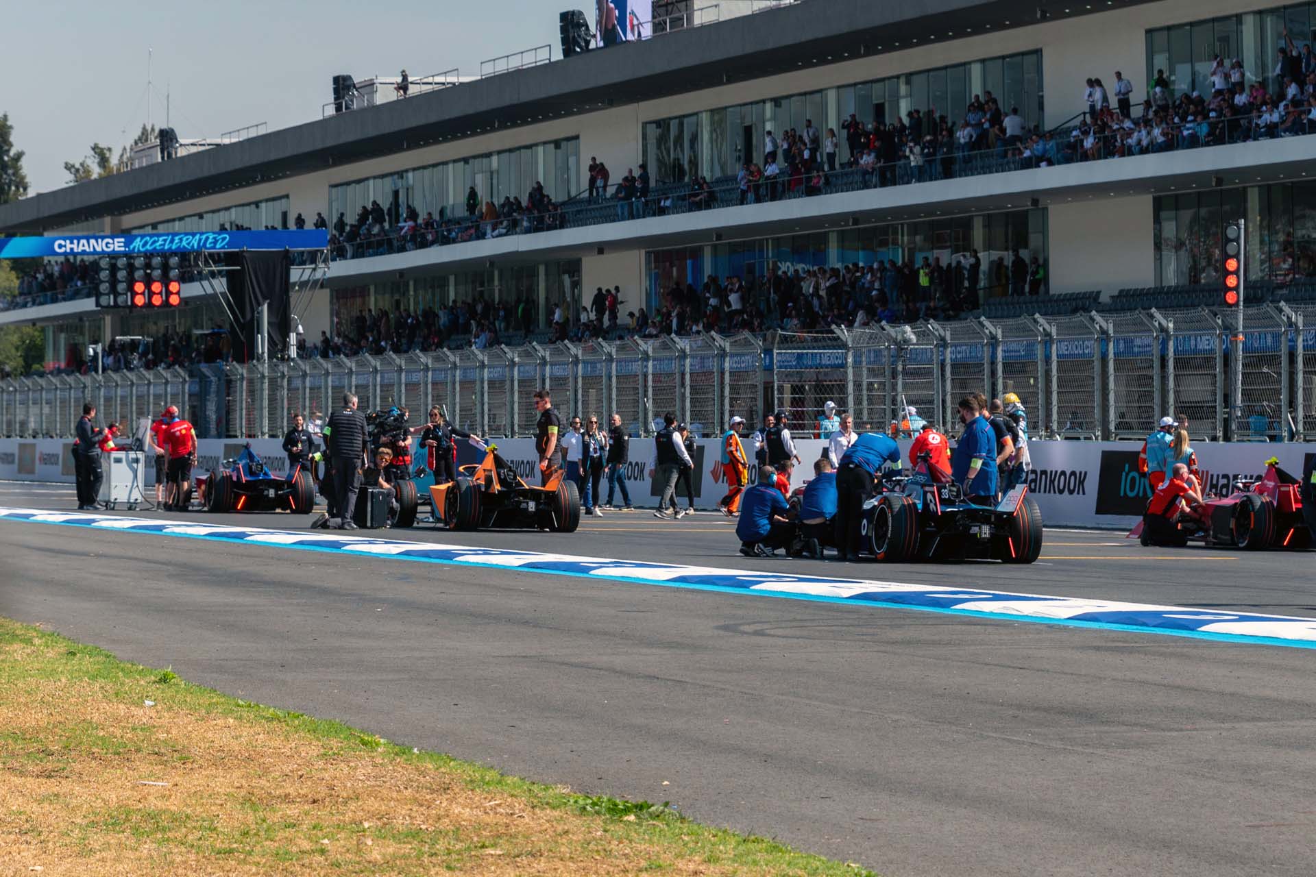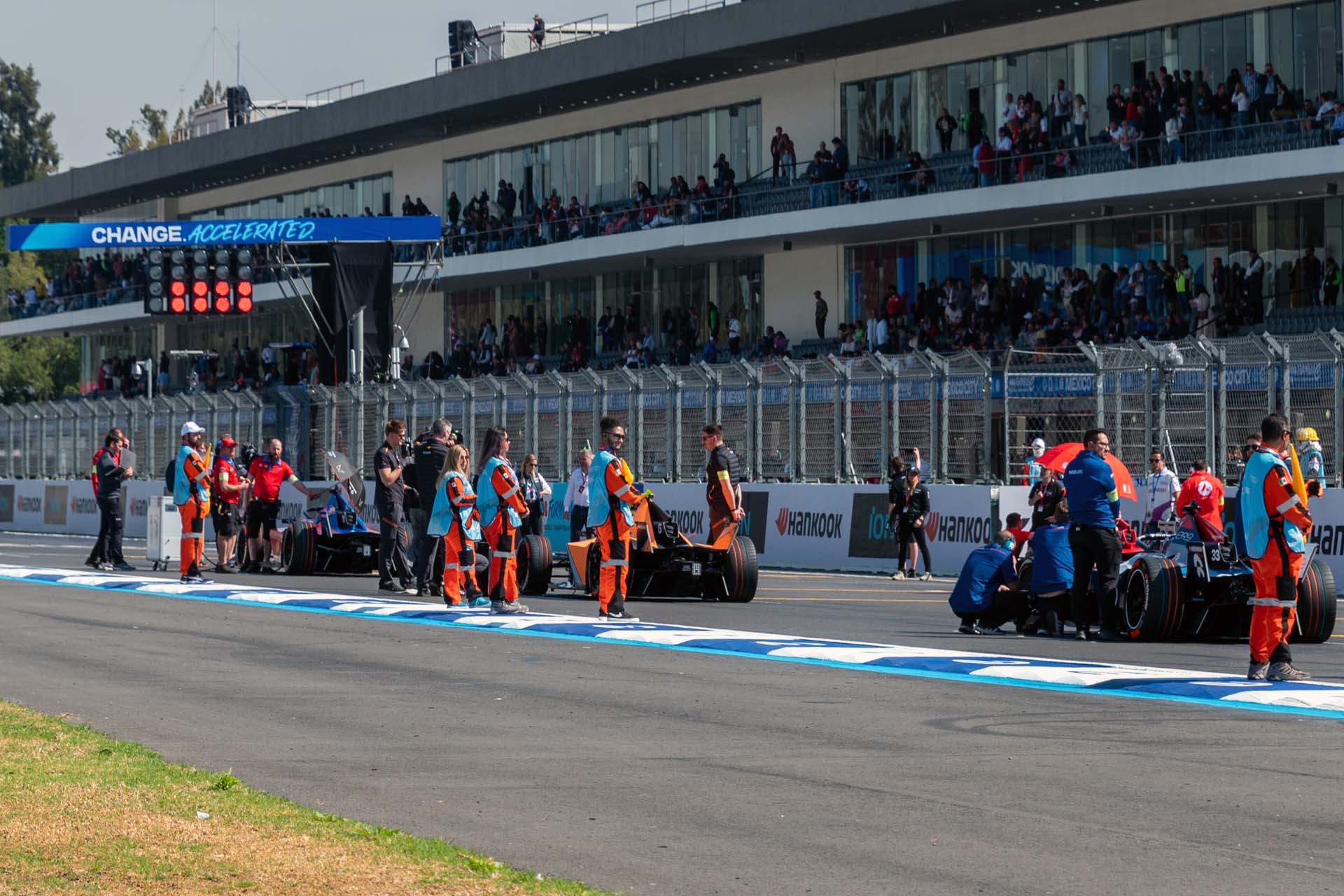 La Formula E se ha caracterizado por ser un serial con un ruido mínimo y eso lo pudimos comprobar estando a un lado de la parrilla ya que lo único que escuchábamos era al público esperando el inicio de la carrera. Fijándose uno en el semáforo, nuestra forma de saber el inicio de Mexico City ePrix, primero con un conteo regresivo, los GEN3 realizan un calentamiento de los neumáticos llenando de humo, ya acomodados en la parrilla, el semáforo vuelve a hacer un conteo para iniciar la carrera.
