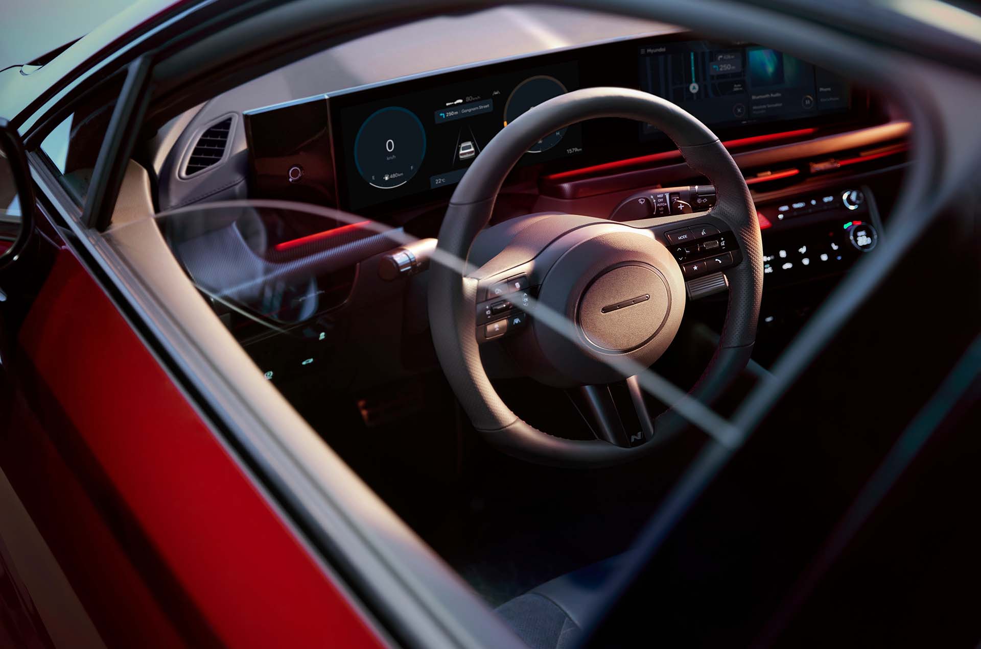 La pantalla curva panorámica, en la que el grupo de información del conductor de 12.3 pulgadas está integrado en el sistema de navegación de audio y video (AVN) de 12.3 pulgadas para brindar a los conductores una experiencia digital inmersiva. Asimismo, la pantalla de visualización frontal (HUD) muestra la información más relevante para los conductores como una proyección de 12 pulgadas en el parabrisas, lo que les permite procesar la información rápidamente mientras mantienen su atención en el camino por delante.