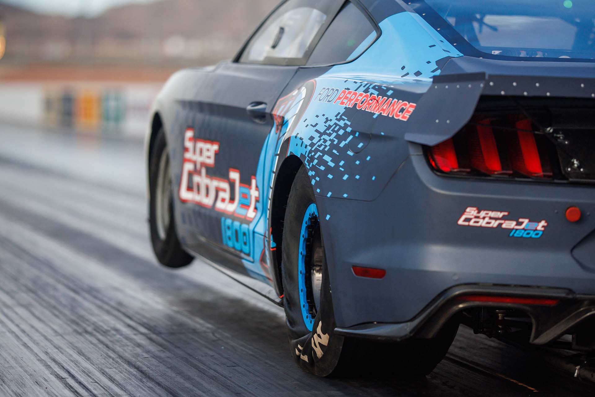 Ford performance presenta un paso más en la continua evolución de sus esfuerzos por llevar el deporte motor de propulsión eléctrica al siguiente nivel con Mustang Super Cobra Jet 1800. Una reinvención agresiva del Mustang Cobra Jet 1400, que posee el récord mundial de la Asociación Nacional del Hot Rod (NHRA por sus siglas en inglés). Este vehículo está destinado a superar el récord mundial para vehículos eléctricos en el cuarto de milla impuesto por Cobra Jet 1400 de 8.128 segundos a 276.75 kilómetros por hora.