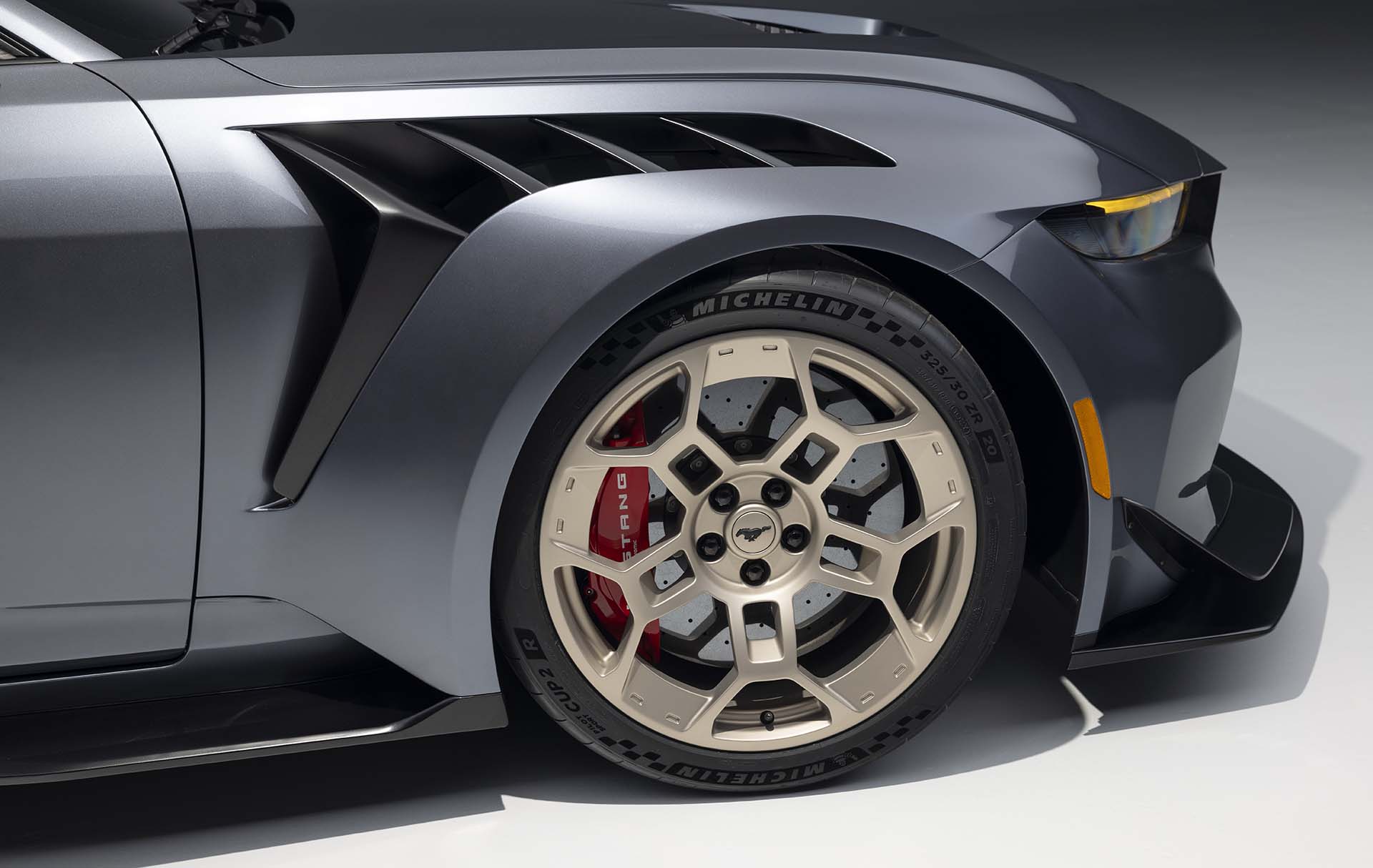 El agarre en carretera y la estabilidad en curva de Mustang GTD proviene de los neumáticos delanteros de 325 milímetros de anchura, tan anchos como los neumáticos traseros del Ford GT, mientras que los traseros son de 345 milímetros, instalados en llantas de aluminio forjado de 20 pulgadas o en llantas de magnesio forjado disponibles. Las llantas de magnesio ofrecen la combinación ideal de peso y durabilidad y con un diseño similar al del Mustang GT3 de carreras.