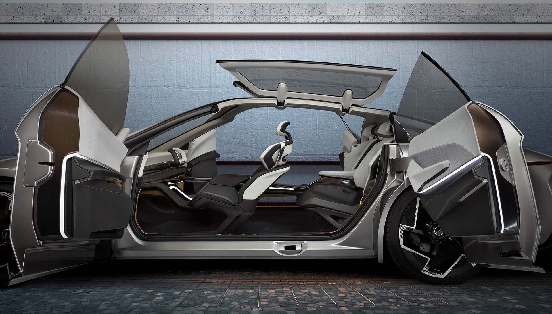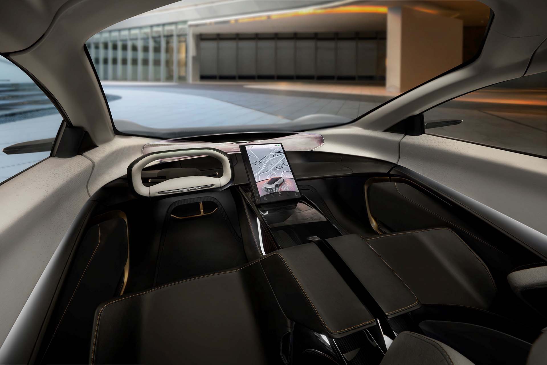 La cabina esculpida está centrada por una pantalla transparente de pilar a pilar que cruza el automóvil, brindando una vista de información orientada hacia adelante mientras mantiene la vista en el camino. Complementando la pantalla hay una pantalla de consola plegable de 15.6 pulgadas que se puede girar para orientación vertical u horizontal y puede ayudar en el inicio y el acceso rápido a la información. Las pantallas se pueden controlar completamente mediante comandos de reconocimiento de voz, lo que disminuye la necesidad de intervención del conductor.