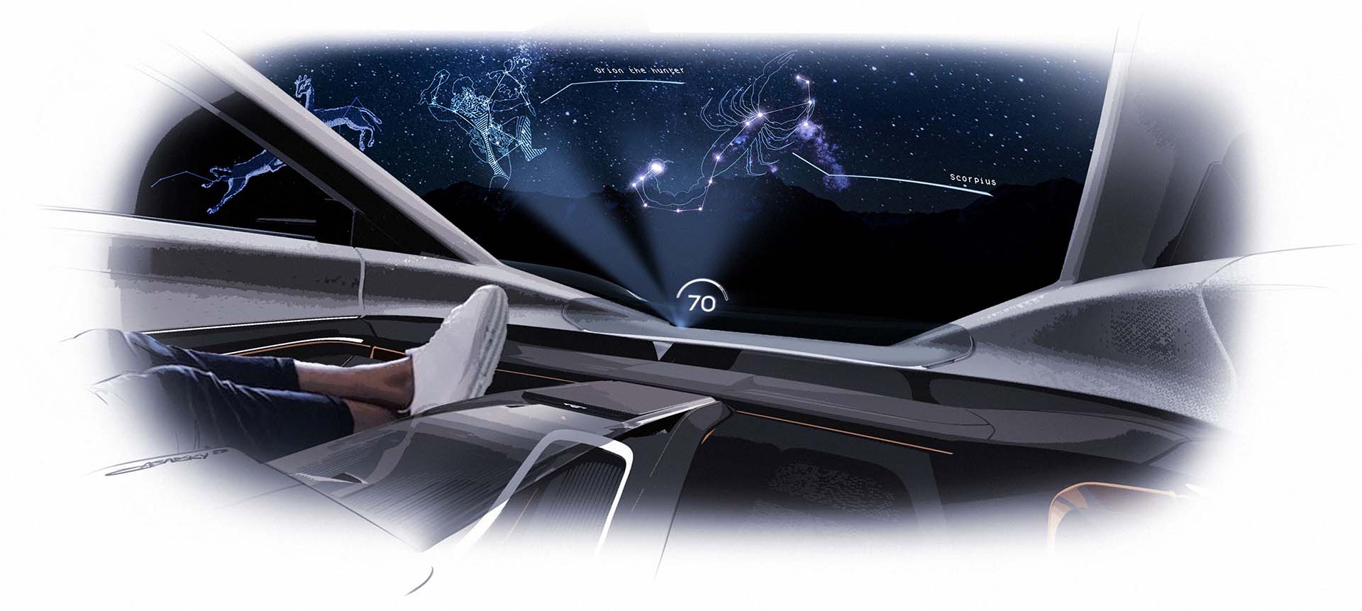 Los ocupantes también pueden ver películas y jugar videojuegos, mientras que el entorno adaptativo cuenta con un sistema multimedia que elige audio y contenido según las preferencias y el historial personal del conductor. El HUD de realidad aumentada incluye una función Memory Landmark que señala puntos de interés y ubicaciones visitadas anteriormente durante el viaje, con marcadores de puntos de referencia seleccionables y compartibles.