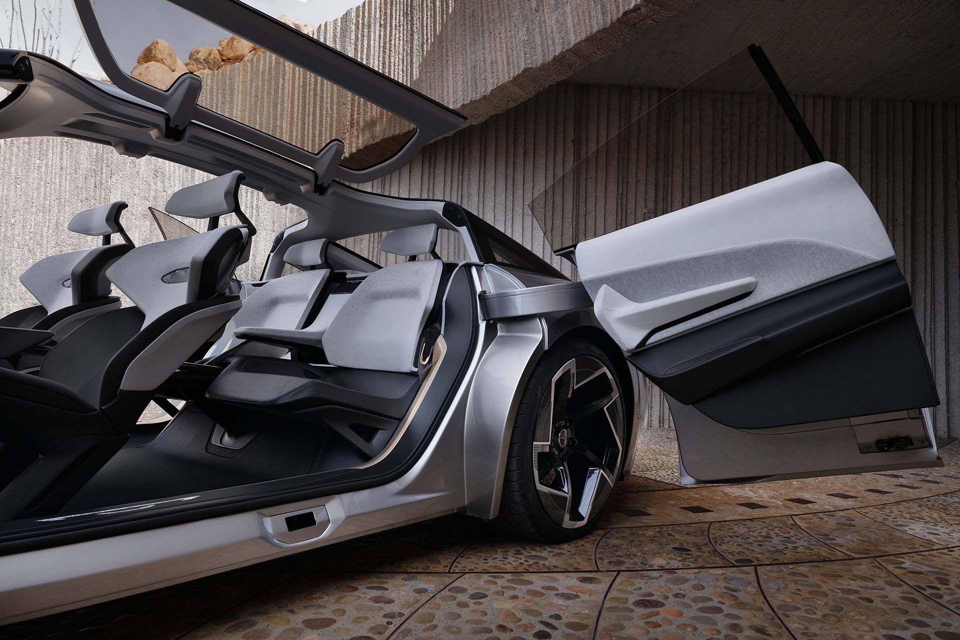 Una cubierta con bisagras de mariposa, teñida de acrílico, sirve como tercera puerta y funciona en sintonía con las puertas laterales estilo alfombra roja para ofrecer entradas y salidas espaciosas. La tapa de vidrio fluido integra el exterior y el interior, brindando vistas perfectas, con el amplio parabrisas, la cubierta y la puerta trasera trabajando en conjunto para brindar una experiencia inmersiva.