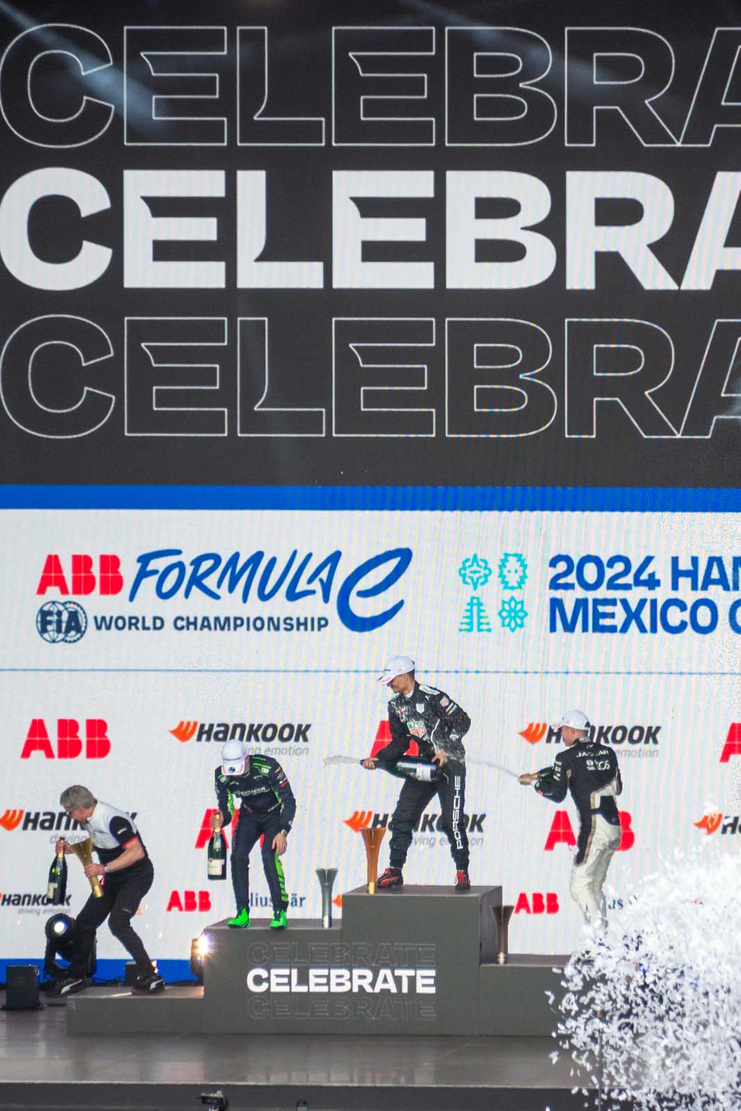 Terminando la carrera puedes ir a la ceremonia de premiación y dependiendo de tu anticipación en llegar tendrás diferentes opciones. La primera si es que llegas muy temprano es ir cerca del escenario donde puedes tener las mejores tomas del piloto en su celebración, pero puedes terminar bañado de champaña y confeti, aunque no suena mal, uno debe pensar en el equipo fotográfico. La otra opción es las tarimas que se encuentran a una distancia del escenario, lo malo de este punto fotográfico es que casi siempre se llena y terminas empujándote con otros fotógrafos (o con los de la transmisión en vivo del canal oficial te quieran quitar de ahí). Yo opté por irme a un punto más lejano y abusando del zoom de mi lente, pude capturar el momento de celebración sin complicaciones.