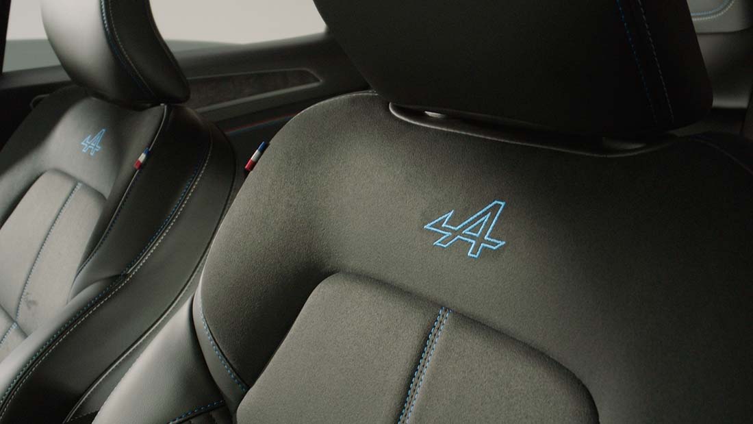 - Asientos delanteros de piel en TEP y gamuza con logotipo Alpine en azul