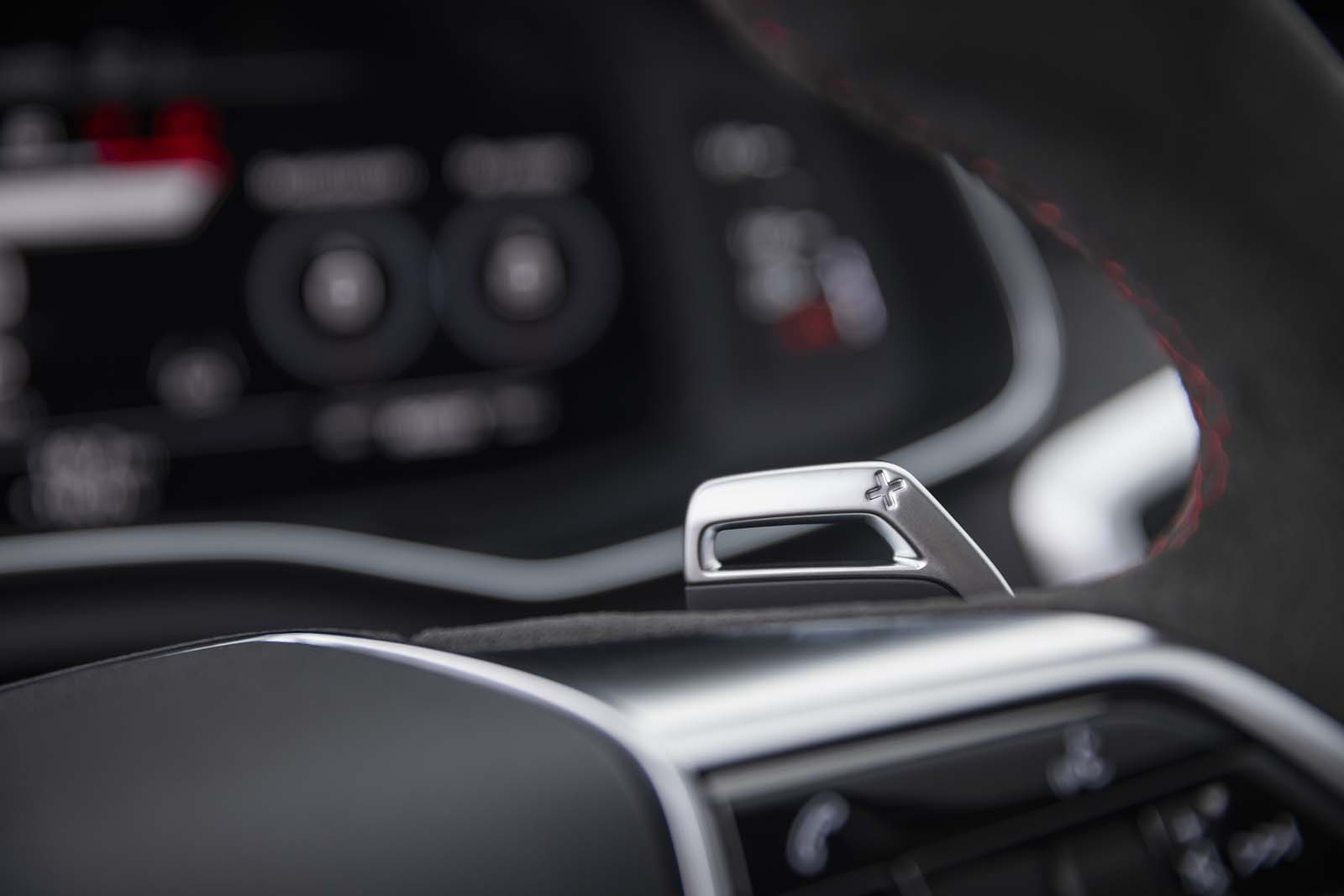 En el habitáculo, la línea de los paquetes de diseño RS en gris y rojo se ha ampliado para incluir el color azul. El aro del volante forrado en Alcantara de color negro incorpora costuras de contraste en azul Mercato; las alfombrillas, el lateral de la consola central y el pomo del selector del cambio también incorporan costuras en azul. Los cinturones de seguridad también lucen el azul Mercato en toda su superficie, con inserciones decorativas en una estructura de carbono con detalles azules opcionales. El pomo del selector del cambio y el lateral de la consola central están forrados con microfibra Dinamica, que incluye alrededor de un 45% de fibras PET recicladas. Y los asientos deportivos cuentan con una tapicería de cuero Valcona perforado de alta calidad con pespuntes de contraste en el citado azul Mercato. Otro elemento distintivo es