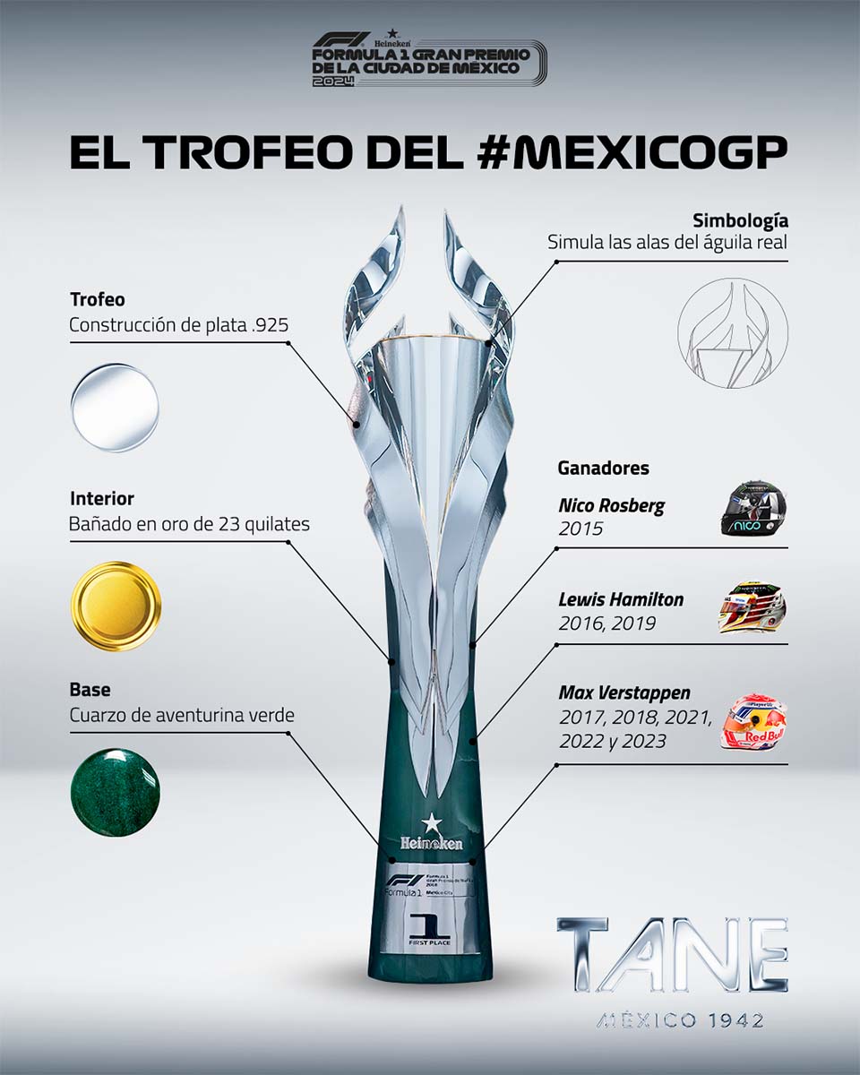 La tradición y modernismo que proyecta el trofeo para el vencedor del FORMULA 1 GRAN PREMIO DE LA CIUDAD DE MÉXICO Presentado por Heineken es producto de la casa de lujo TANE México 1942. Esta pieza, elaborada a mano, se ha convertido en una tradición en el campeonato y en el objeto más deseado por todos los pilotos que pisan el circuito del Autodrómo Hermanos Rodríguez.