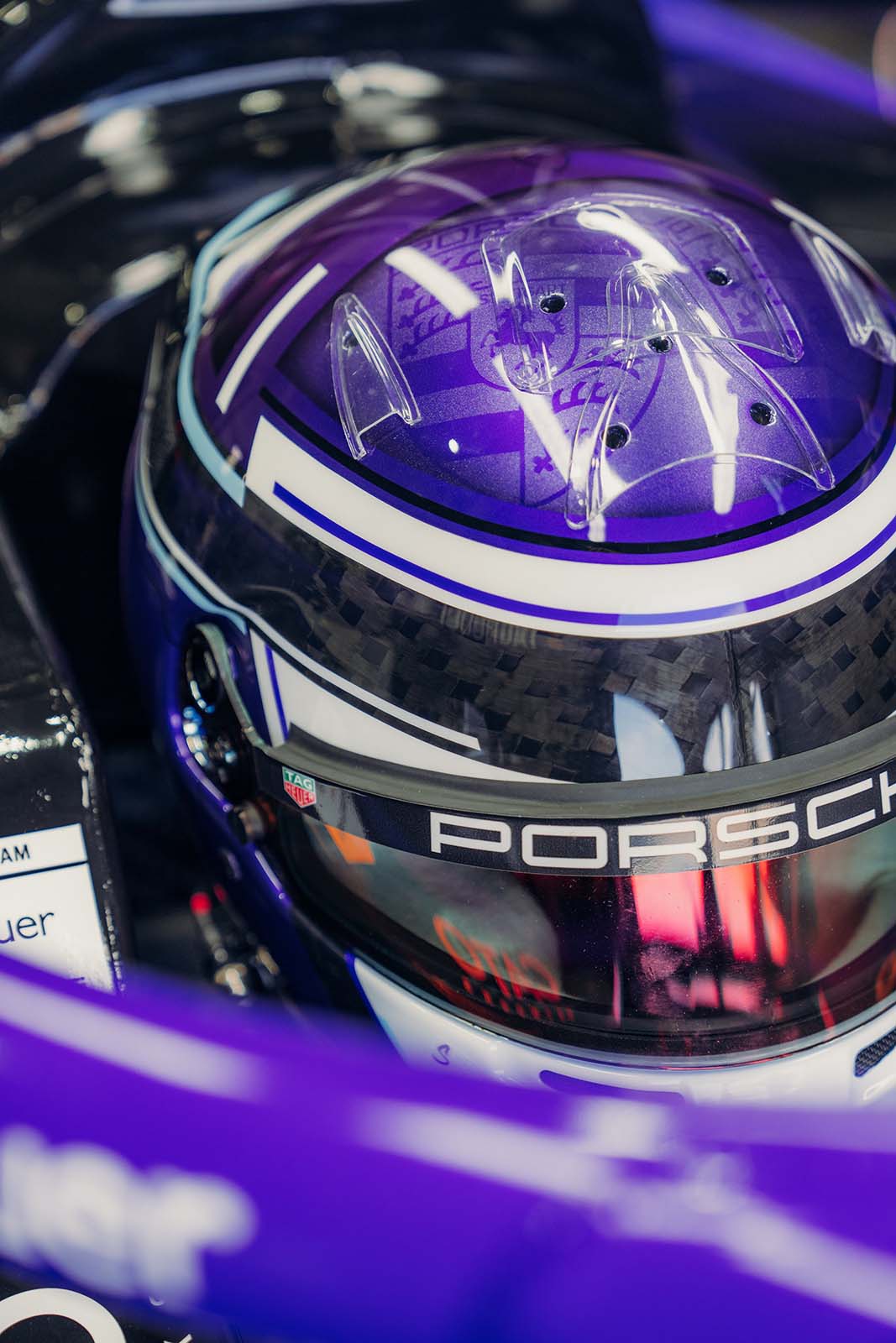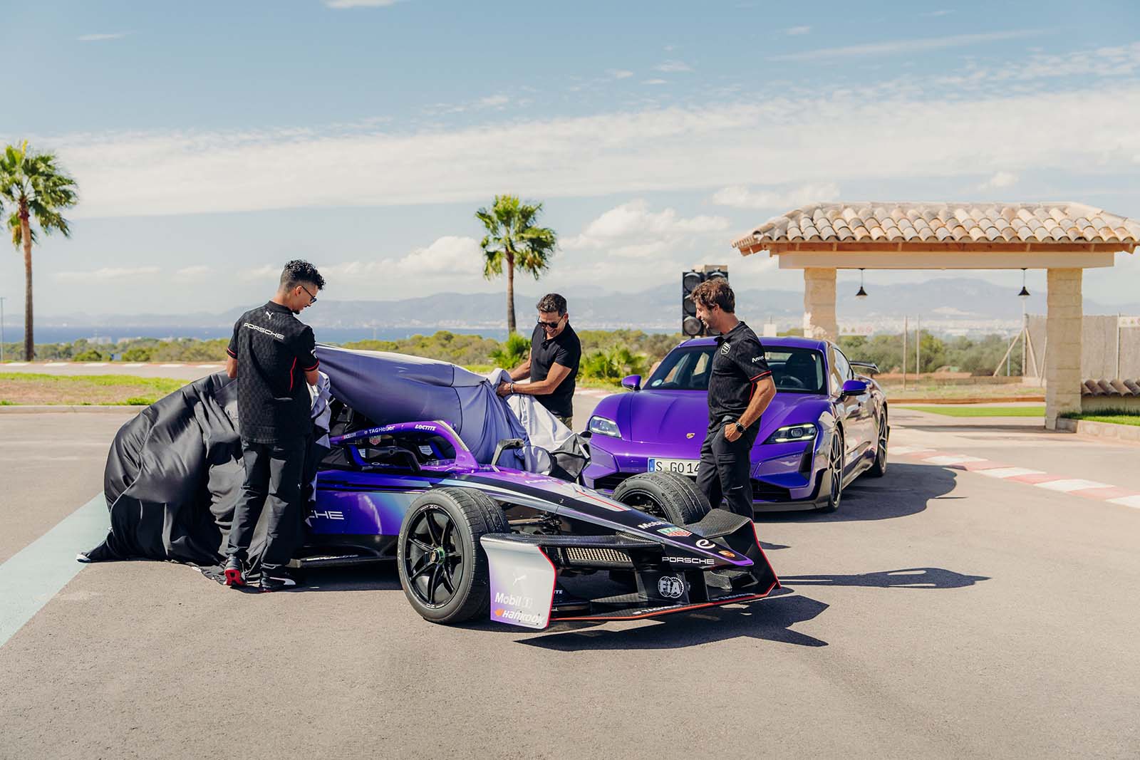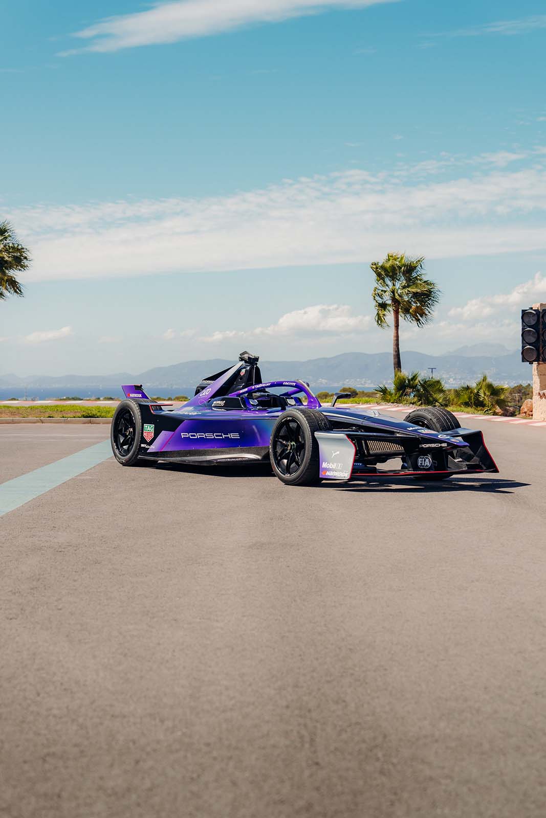 Purple Sky metalizado y verde Shade metalizado: estos son los nuevos colores que dan vida al Porsche 99X Electric. Son los mismos tonos de pintura que Porsche utilizó a principios de año para presentar la nueva punta de lanza de sus deportivos eléctricos para carretera, el Taycan Turbo GT, que es el auto de producción más potente construido por la marca hasta la fecha. Los tonos púrpura y verde sustituyen la tradicional combinación de negro, blanco y rojo, y simbolizan la transferencia de tecnología de las carreras a la producción en serie. El cambio de color también representa la electrificación, el espíritu pionero y la apuesta de Porsche por el campeonato de Fórmula E.