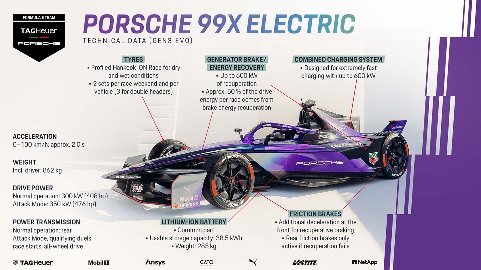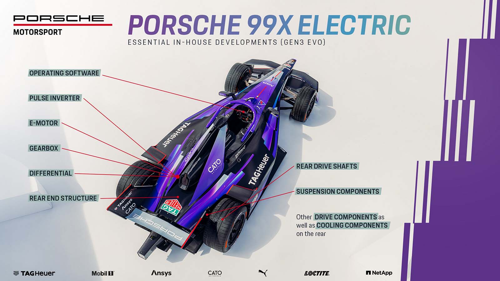 El nuevo Porsche 99X Electric ha debutado en Internet el 24 de octubre, en un vídeo con Bruno Correia, piloto del auto de seguridad de la Fórmula E y de desarrollo del GEN3 Evo. Entre las innovaciones más relevantes figuran la posibilidad de activar la tracción en el eje delantero, unos neumáticos de mayor agarre y un alerón frontal modificado. El campeón del mundo Pascal Wehrlein y António Félix da Costa, el piloto con más victorias de la temporada pasada, se mantienen en el equipo oficial TAG Heuer Porsche de Fórmula E. Los dos autos del equipo cliente Andretti contarán con el anterior campeón del mundo Jake Dennis y con el nuevo piloto oficial de Porsche Nico Müller.