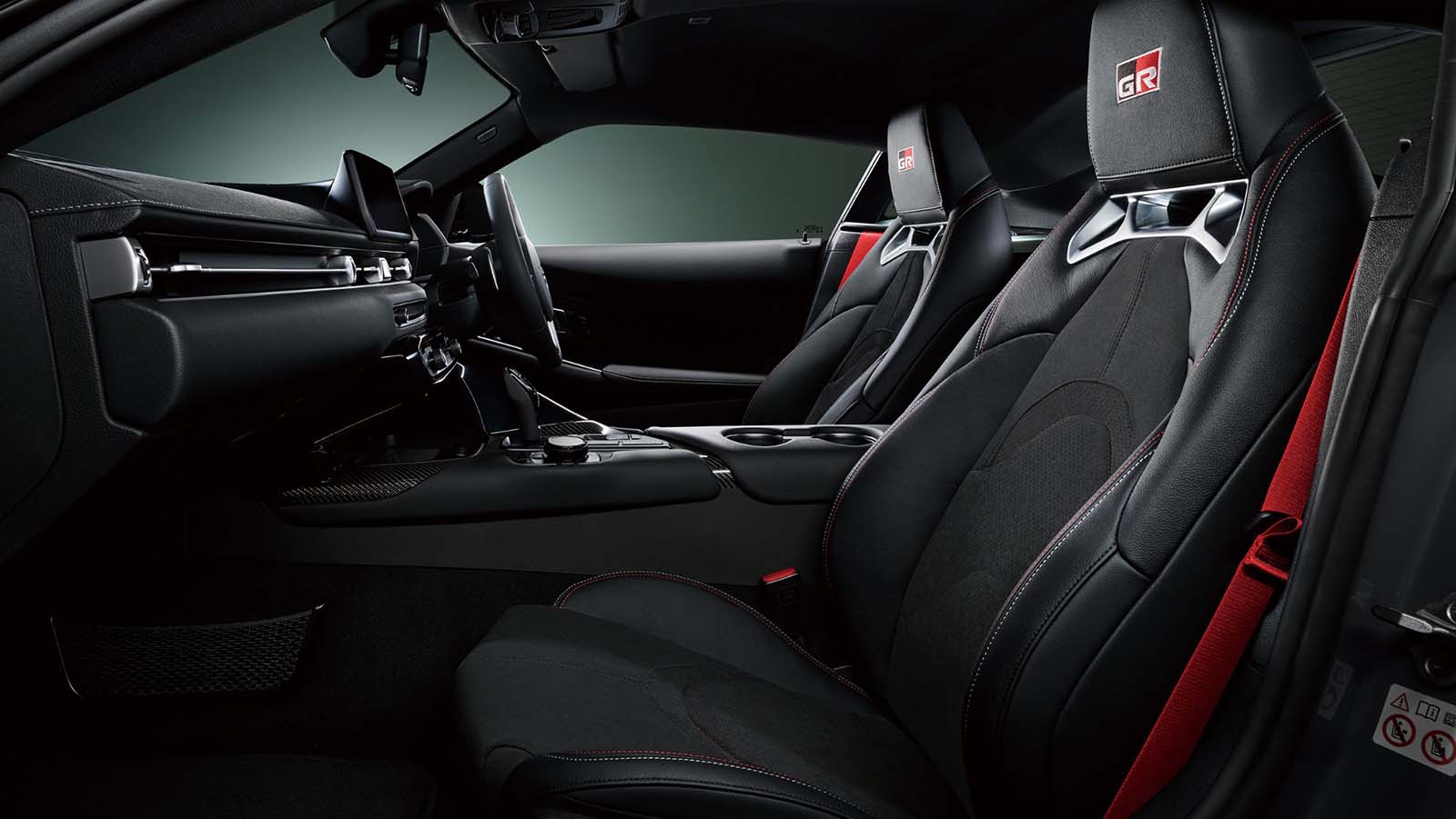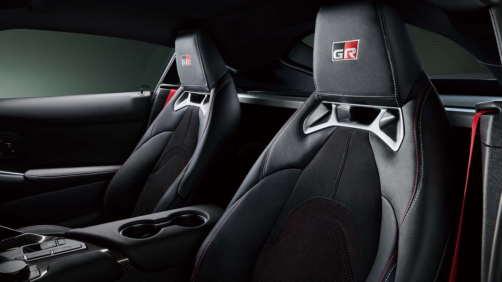 El asiento del conductor está tapizado en Alcantara® con detalles bordados “GR” y cuero genuino. Los detalles rojos en la perilla de cambios (para modelos con transmisión manual), las costuras y los cinturones de seguridad aportan un toque deportivo al interior.
