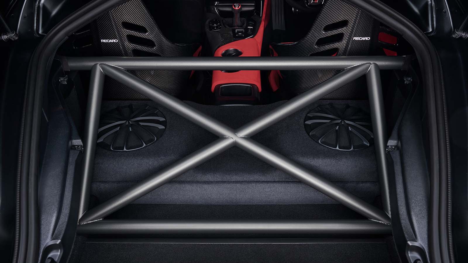 - Los asientos deportivos RECARO de fibra de carbono, tapizados en Alcantara®, ofrecen soporte firme para el conductor, incluso bajo fuerzas extremas en curvas. El asiento del conductor destaca en rojo, acentuando el enfoque deportivo del diseño.