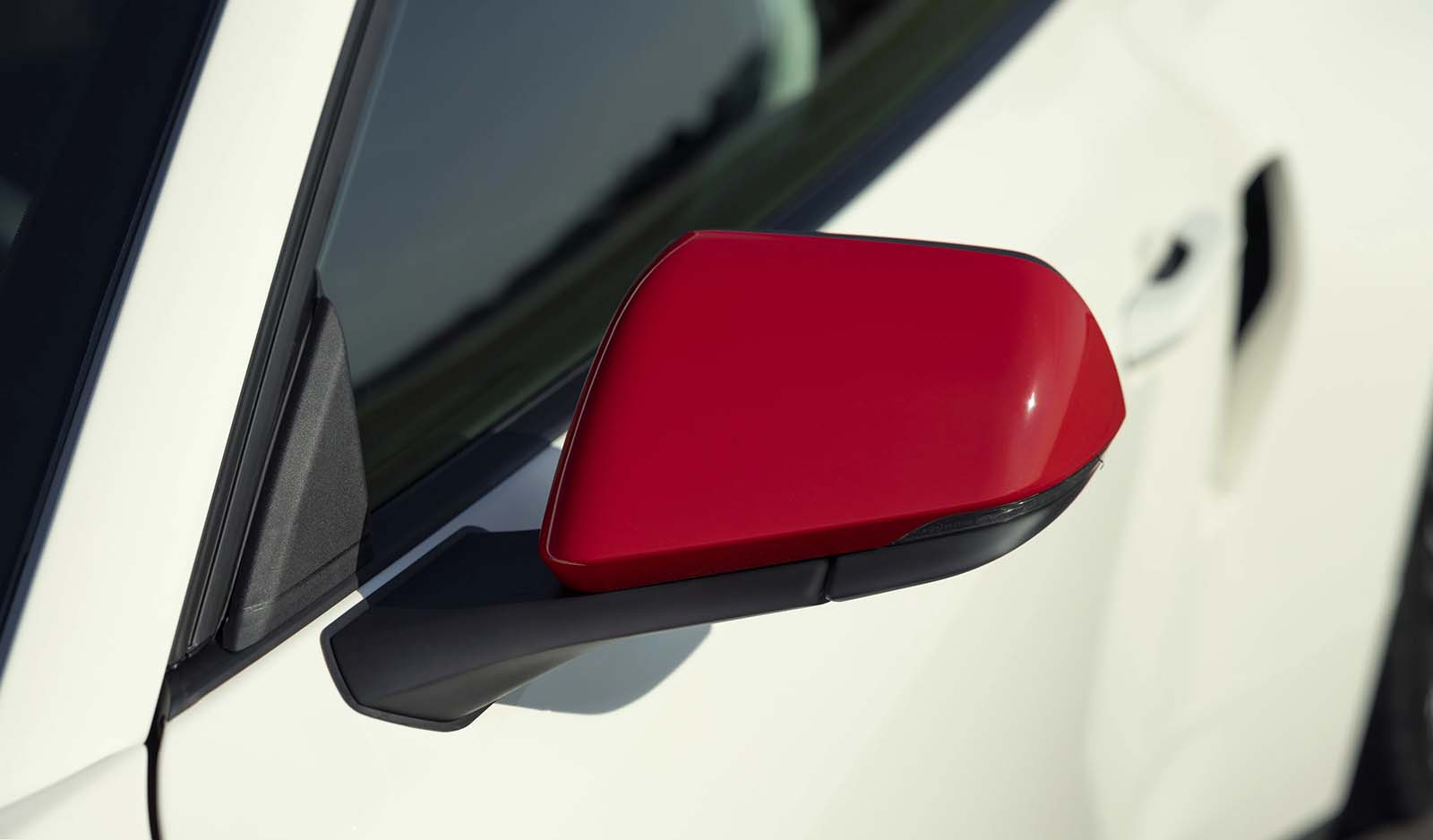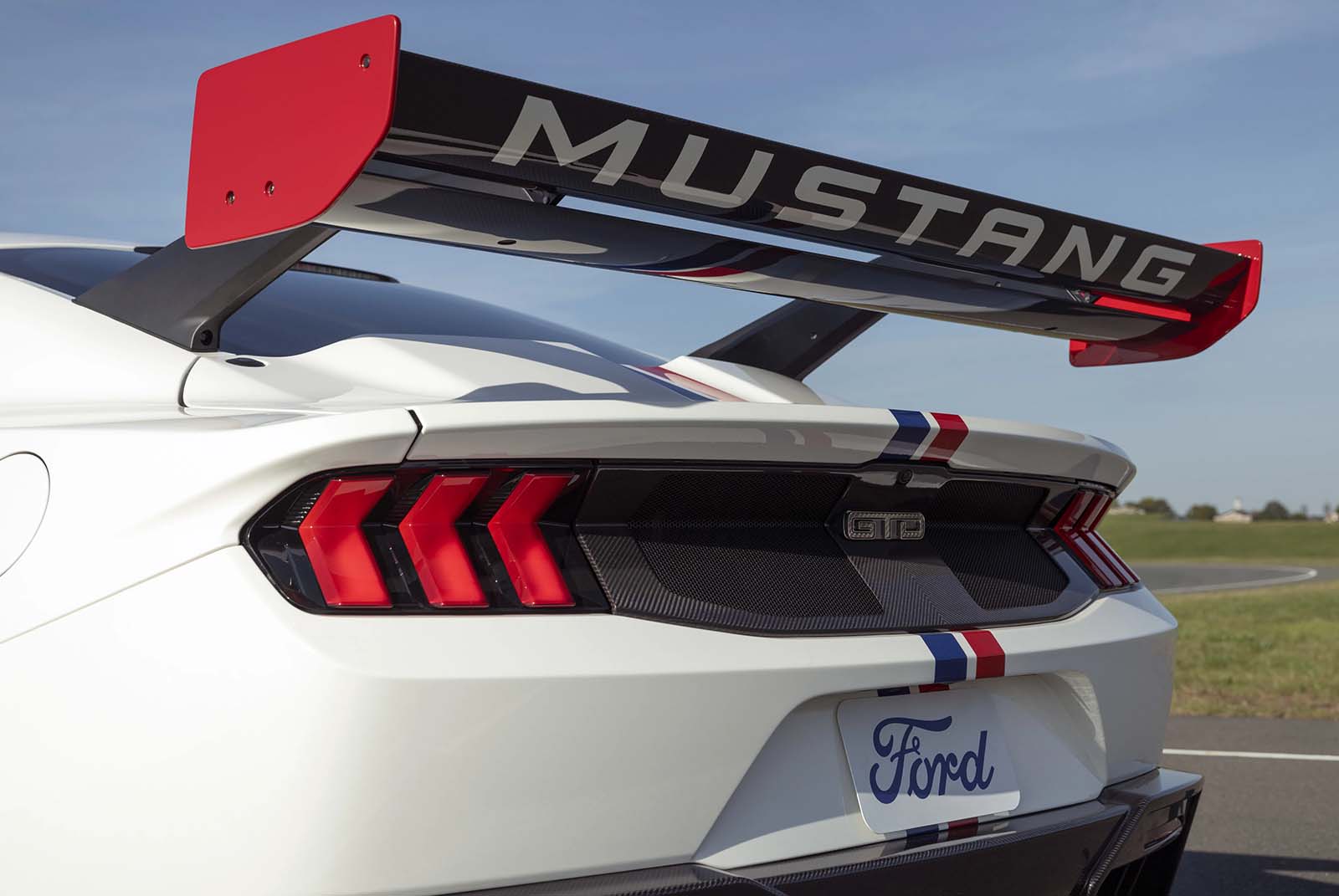 La fibra de carbono expuesta es un elemento principal en los componentes aerodinámicos de esta edición de Mustang GTD, incluyendo el splitter frontal, así como en el difusor trasero y el alerón. El alerón incluye placas de extremo en Race Red y la palabra “MUSTANG” en la parte inferior, asegurándose de que los autos que lo siguen sepan exactamente qué vehículo los acaba de superar. Los propietarios pueden elegir entre las carcasas de los retrovisores en Race Red o en fibra de carbono expuesta, mientras que las pinzas de freno en Red Race son estándares. Además, Mustang GTD Performance Package es estándar en esta versión.