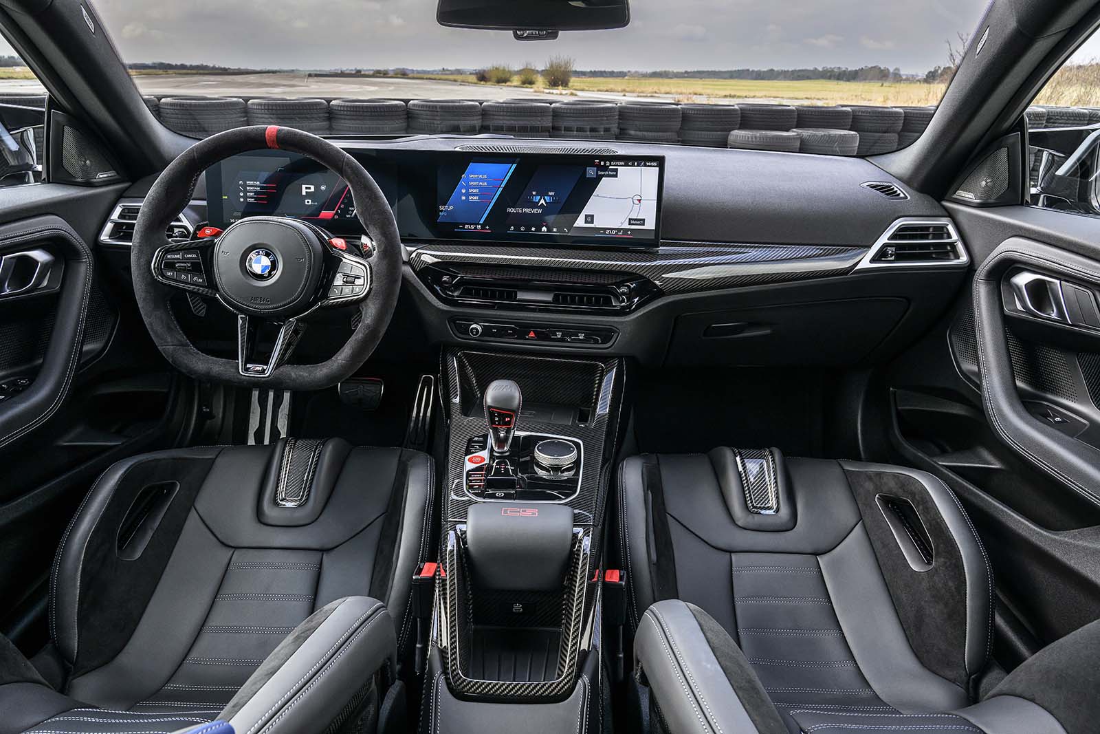 El interior del nuevo BMW M2 CS combina un aspecto exclusivo con la sensación deportiva de las superficies cubiertas en Alcantara y un diseño ligero innovador. Por ejemplo, la consola central está hecha de plástico reforzado con fibra de carbono (CFRP). El conductor y el pasajero ocupan sus lugares en asientos de cubo M de carbono optimizados para el peso, con calefacción y con una amplia gama de ajustes eléctricos, los asientos también incluyen un logo «CS» iluminado. Los reposacabezas integrados son removibles y, gracias a la opción de integrar arneses de múltiples puntos, simplifican la preparación del coche para pista. Las superficies de los asientos están acabadas en cuero Merino.