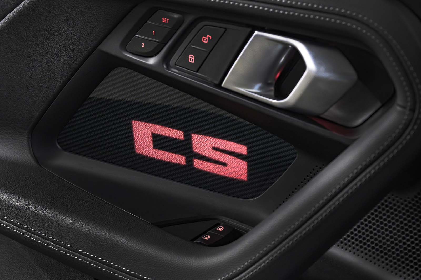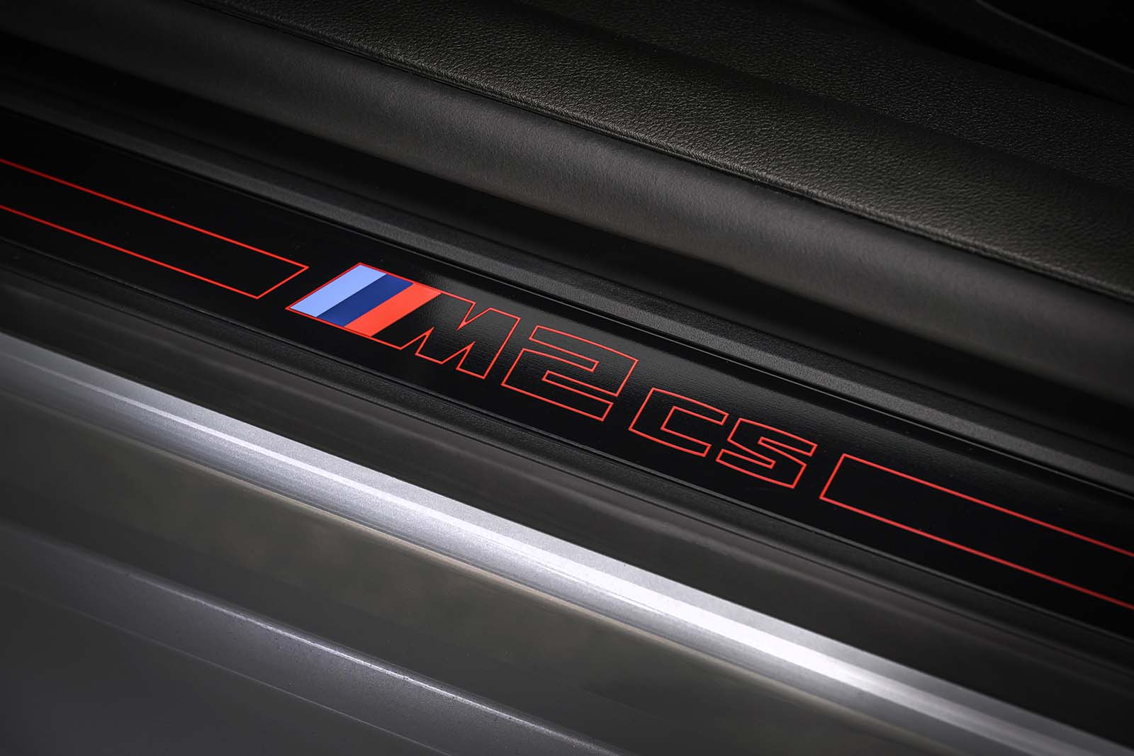 Los elementos decorativos en el panel de instrumentos y la consola central son acabados en fibra de carbono M. Detalles específicos adicionales incluyen el logo «CS» rojo en la consola central, los cinturones de seguridad M y las placas de umbral de las puertas de entrada, que son negras con un logo «M2 CS» y contorno rojo por primera vez. Ahora iluminadas con el logo «CS», los paneles de las puertas ciertamente llaman la atención. El color utilizado aquí se puede configurar de manera individual, al igual que la iluminación ambiental estándar. Cuando está apagada, se puede ver una estructura de carbono. Completando el interior deportivo está el techo M Anthracite.