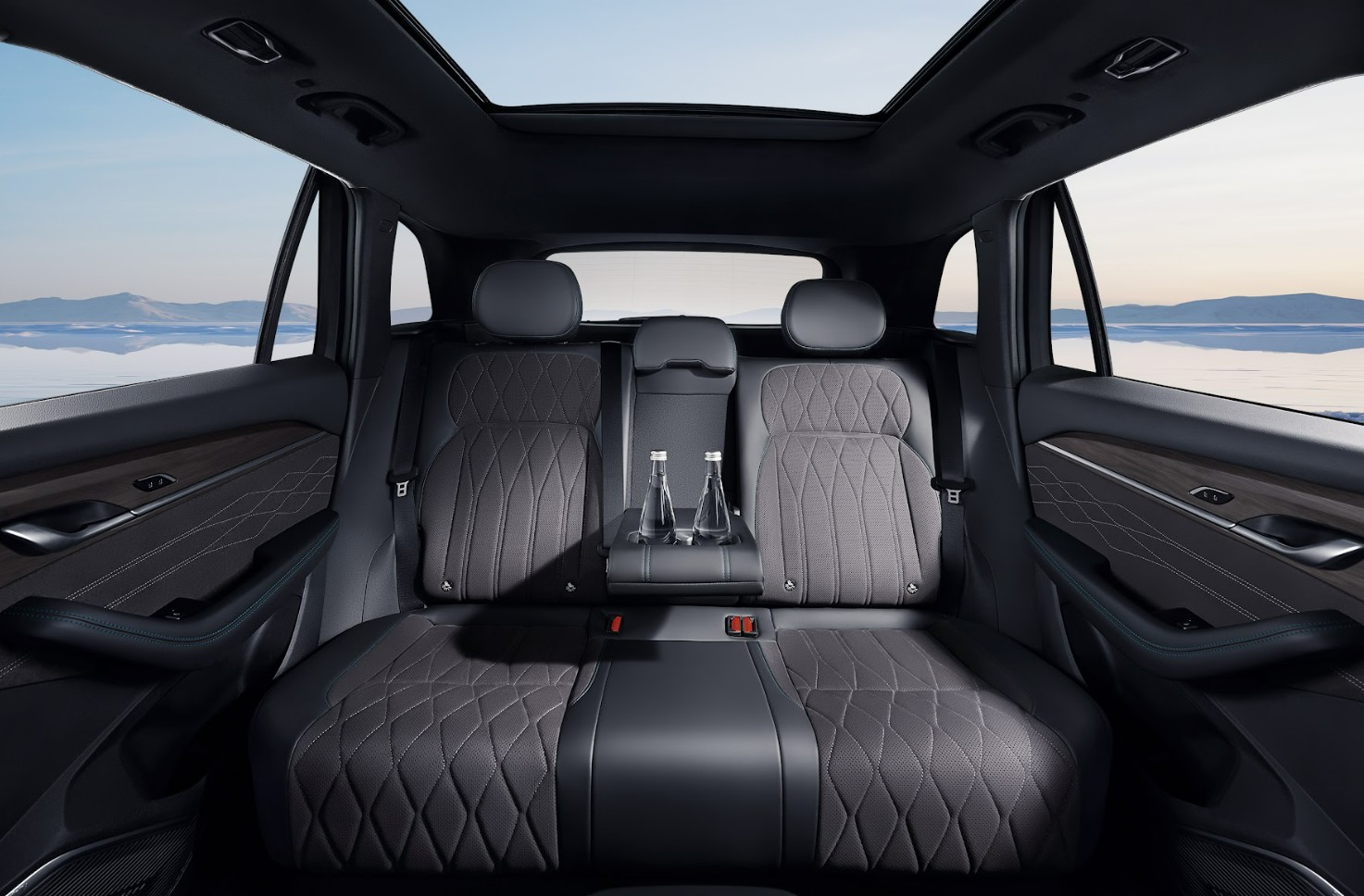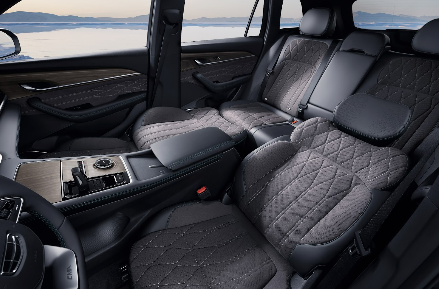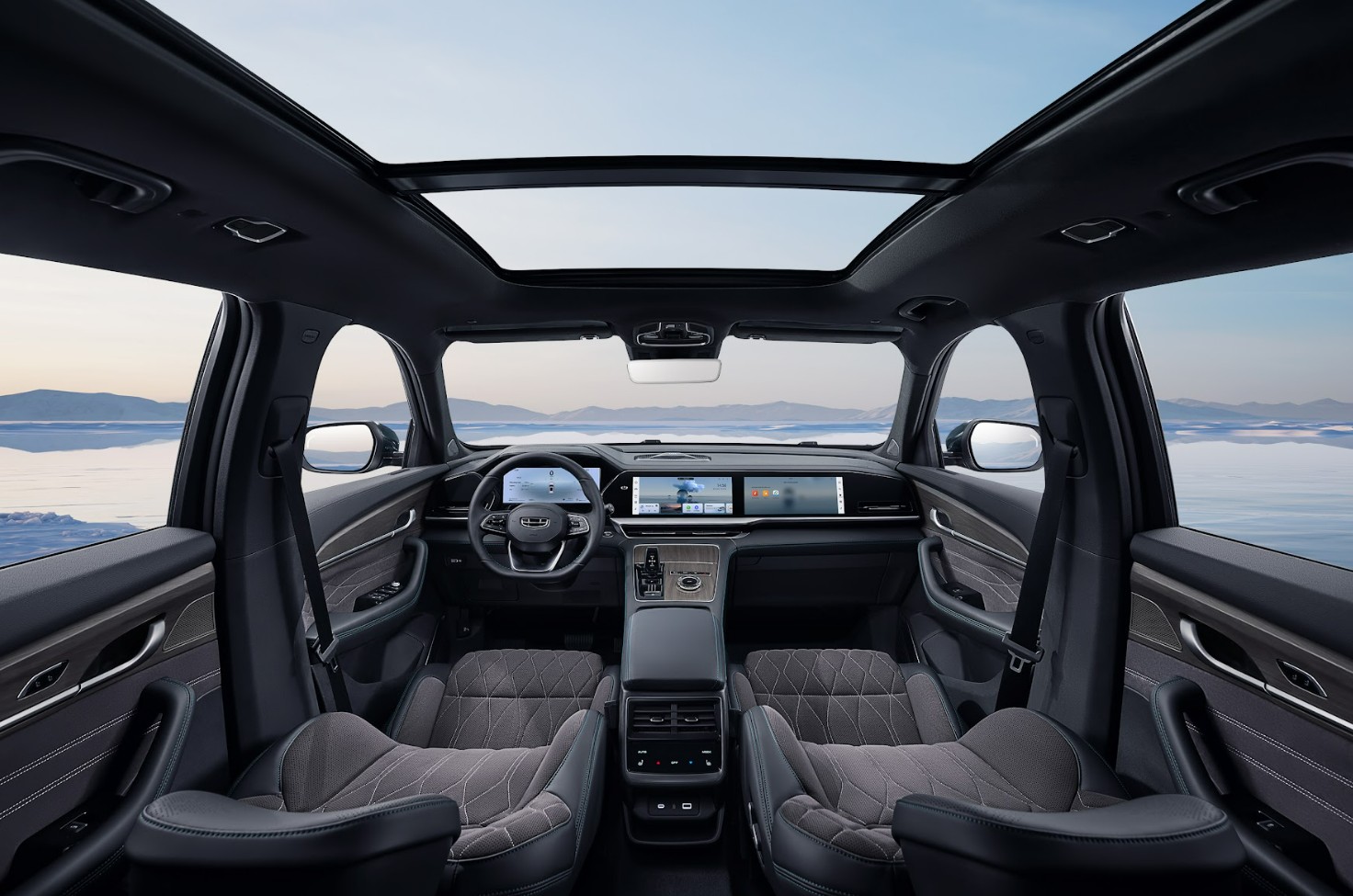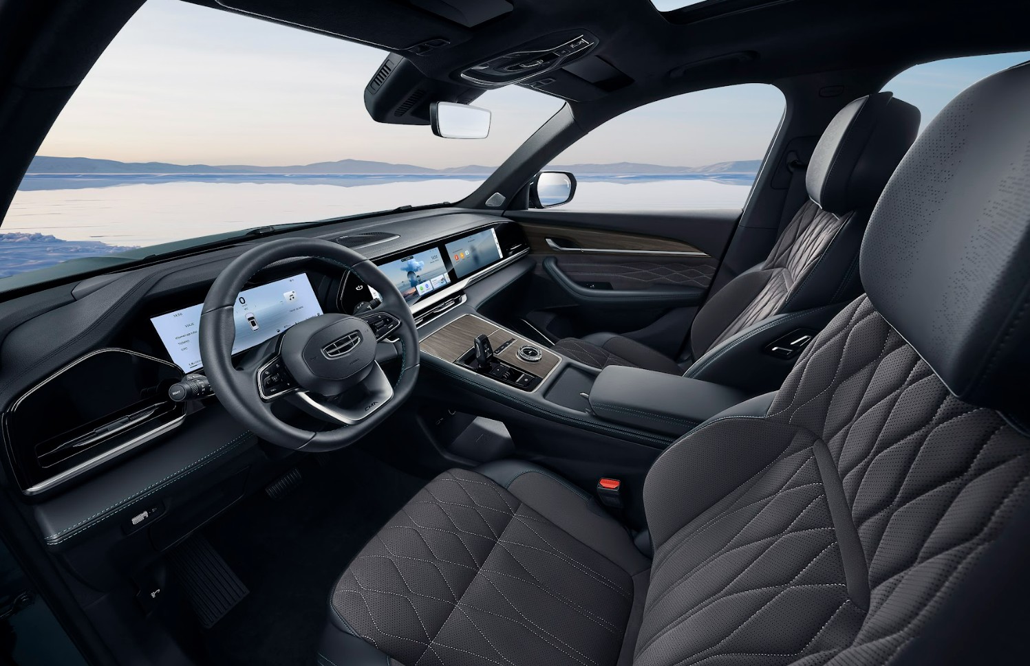 Por dentro Geely Monjaro envuelve al usuario en un ambiente puro de ostentación, sofisticación y tecnología. Los asientos completamente ergonómicos de piel sintética con insertos de microfibra tipo gamuza. Las plazas delanteras son de ajuste eléctrico, con memoria y ventiladas; las posteriores son reclinables y con anclajes ISOFIX.
