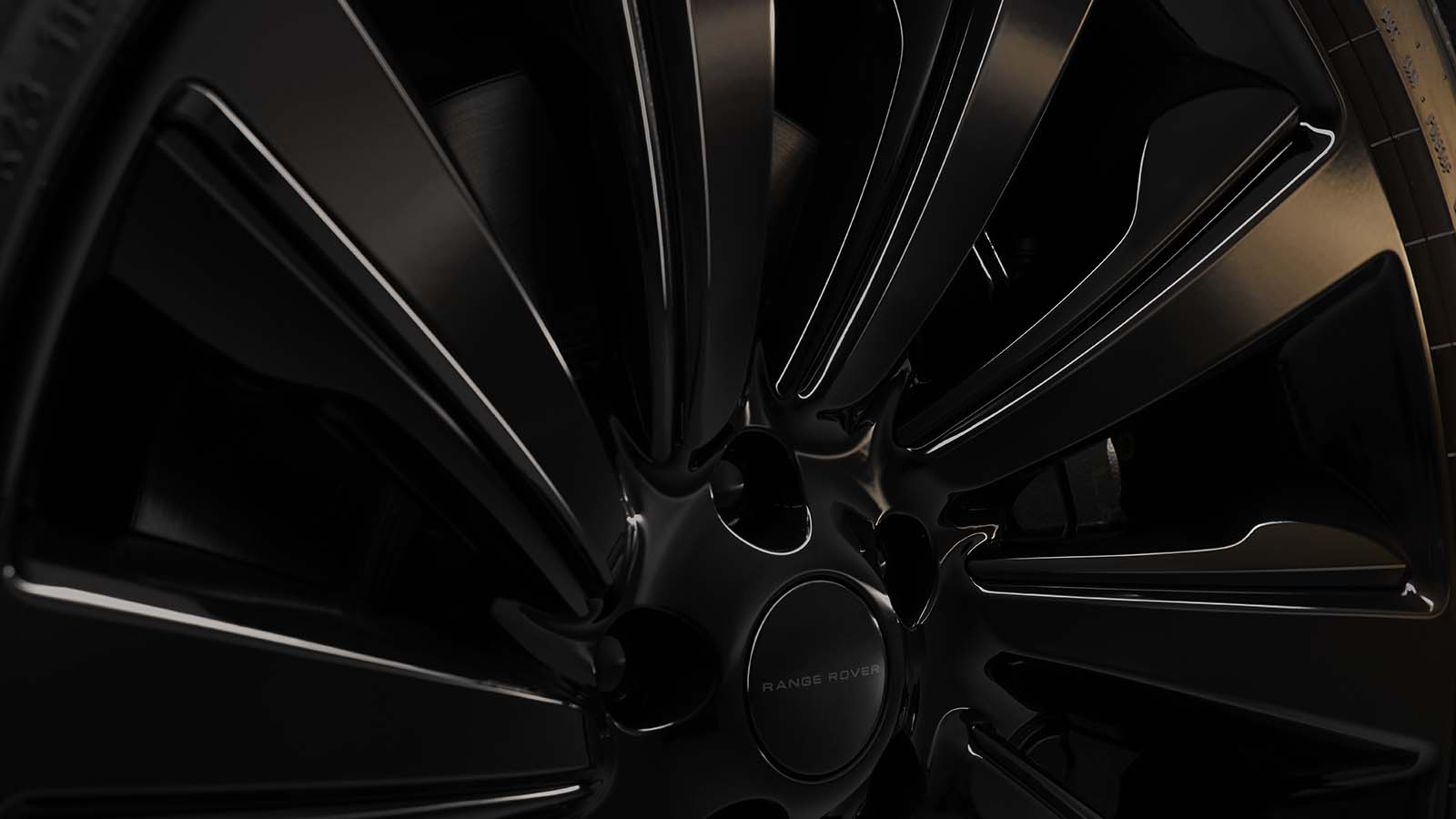 Los detalles exteriores reflejan lo mejor de la artesanía SV: parrilla de malla en negro brillante, logotipo del cofre en el mismo acabado, emblema ovalado en negro oscuro. De perfil, destacan las llantas de 23 pulgadas también en negro brillante, con calipers en acabado oscuro y el logotipo Range Rover con tratamiento sutil.