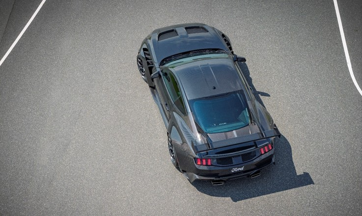 La apariencia también es funcional. Al eliminar la pintura y sustituir la chapa de las puertas por fibra de carbono, el peso disminuye alrededor de 5.8 kg en comparación con Ford Mustang GTD Carbon Series con el paquete Performance.