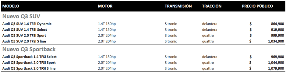 Los nuevos Q3 SUV y Q3 Sportback se encuentran disponibles en todas las concesionarias Audi del país. El Q3 SUV llega al mercado mexicano bajo las versiones: Dynamic, Select, Sport y S Line, mientras que el Q3 Sportback se presenta en las versiones: Select, Sport y S Line.