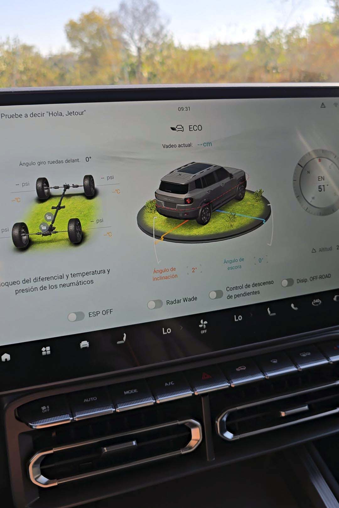 El Jetour T1 no solo muestra robustez; está pensado para enfrentarse a cualquier terreno. La altura libre al suelo es de 190 mm, lo que permite superar muchos obstáculos con certeza. Cuenta con un ángulo de ataque (entrada) de 28°, un ángulo de salida de 30° y un ángulo ventral de 17°, permitiendo superar pendientes pronunciadas y descensos sin riesgo de dañar la carrocería. Su capacidad de vadeo es de 600 mm, lo que le permite enfrentar cruces de agua con una seguridad que muy pocos vehículos pueden igualar (y más gracias al indicador de profundidad que de la pantalla central que mencionamos anteriormente).