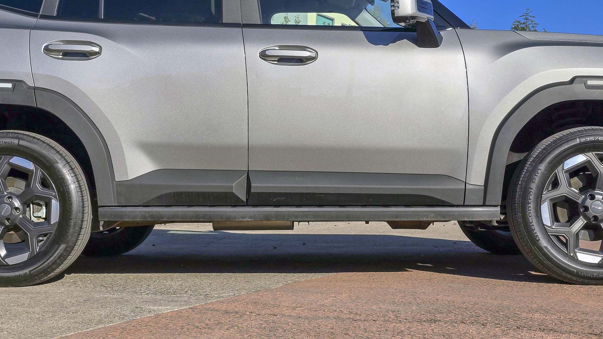 Al costado, lo corto de sus defensas tanto delantera como trasera, nos da una idea de sus ángulos de entrada y de salida, para facilitar el acceso contamos con estribos a los costados. Como también es un vehículo considerado para andar en la ciudad, la versión Wild tiene rines de aluminio 19 pulgadas con neumáticos 235/60 HT R19 con dibujo para el asfalto.