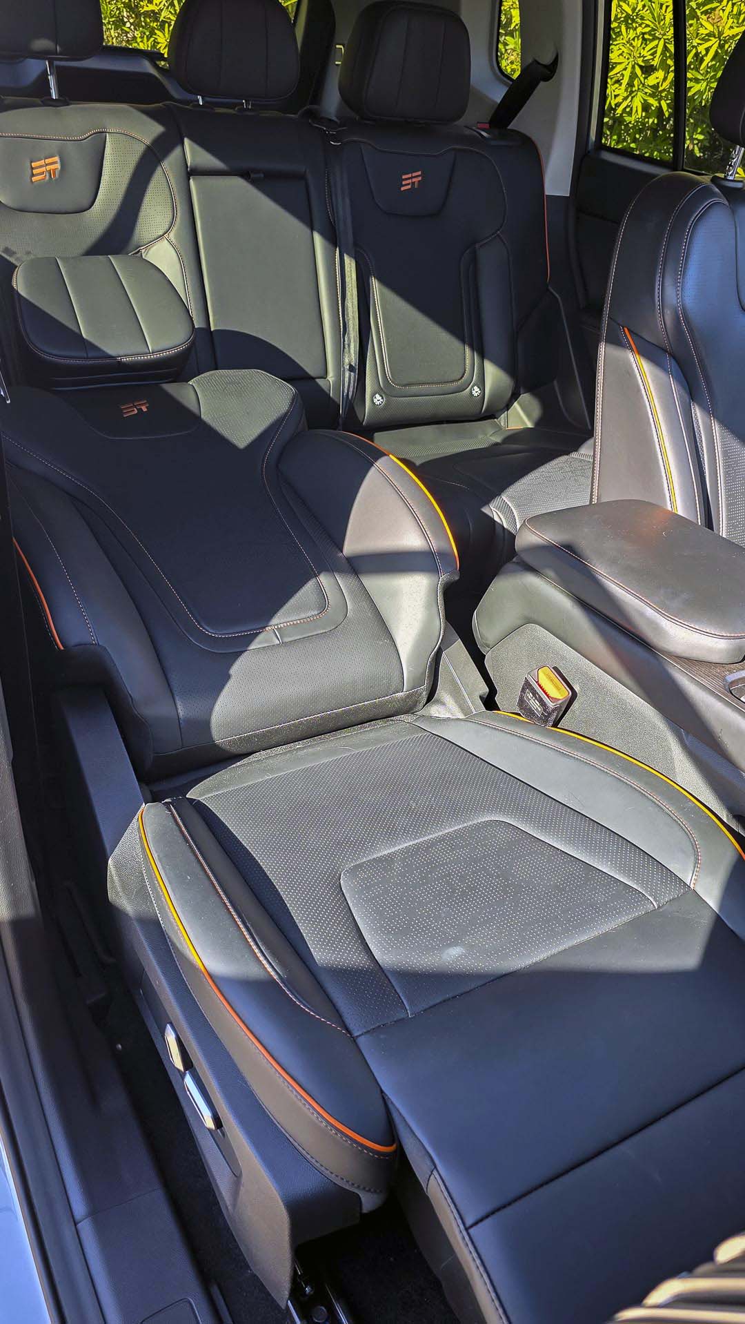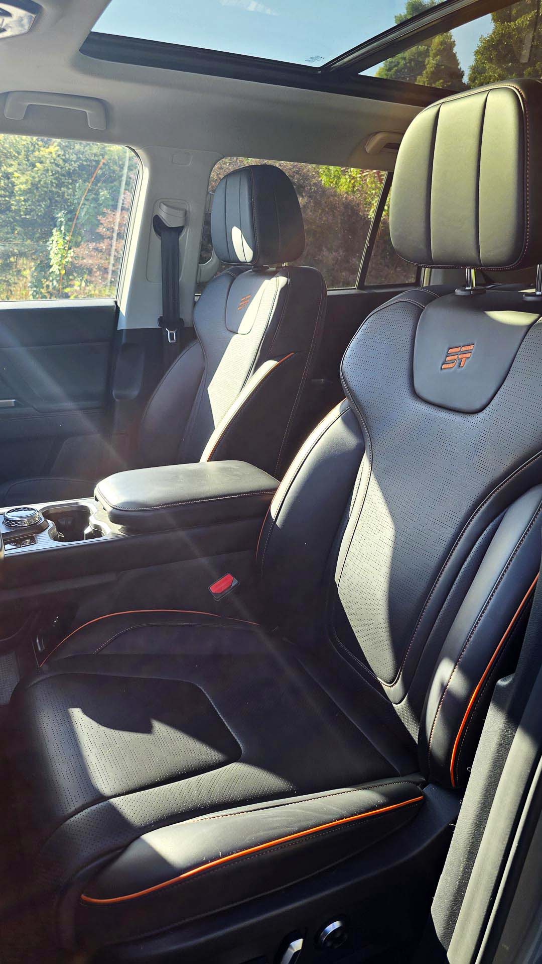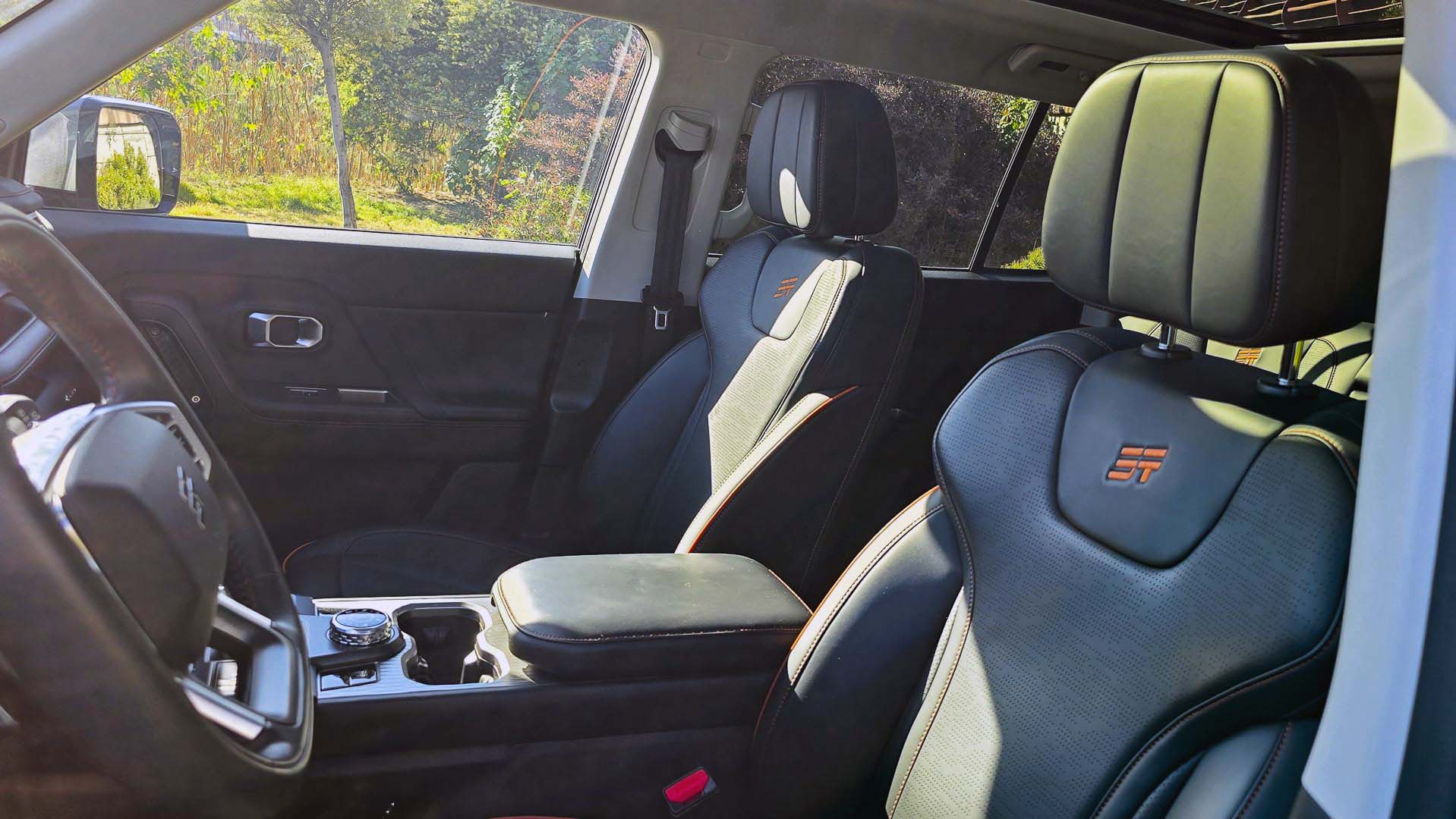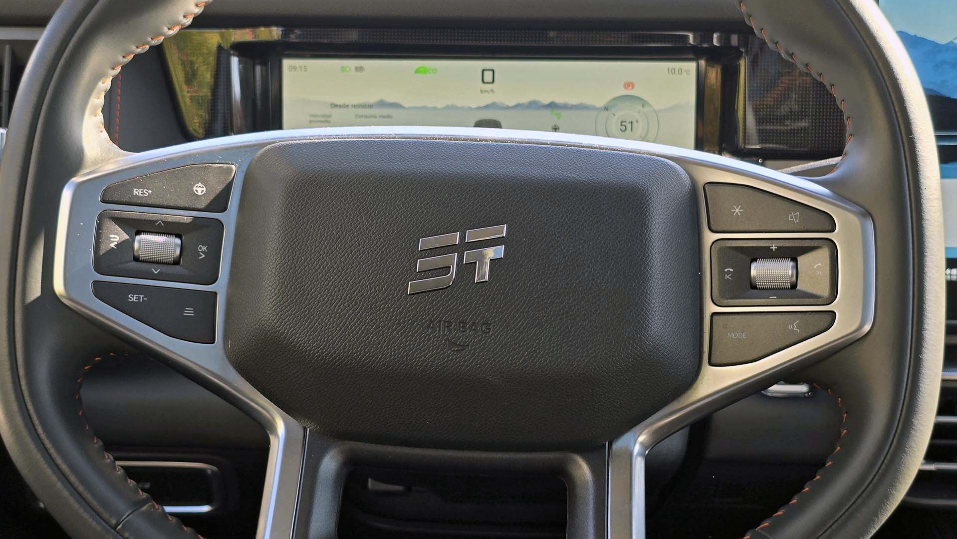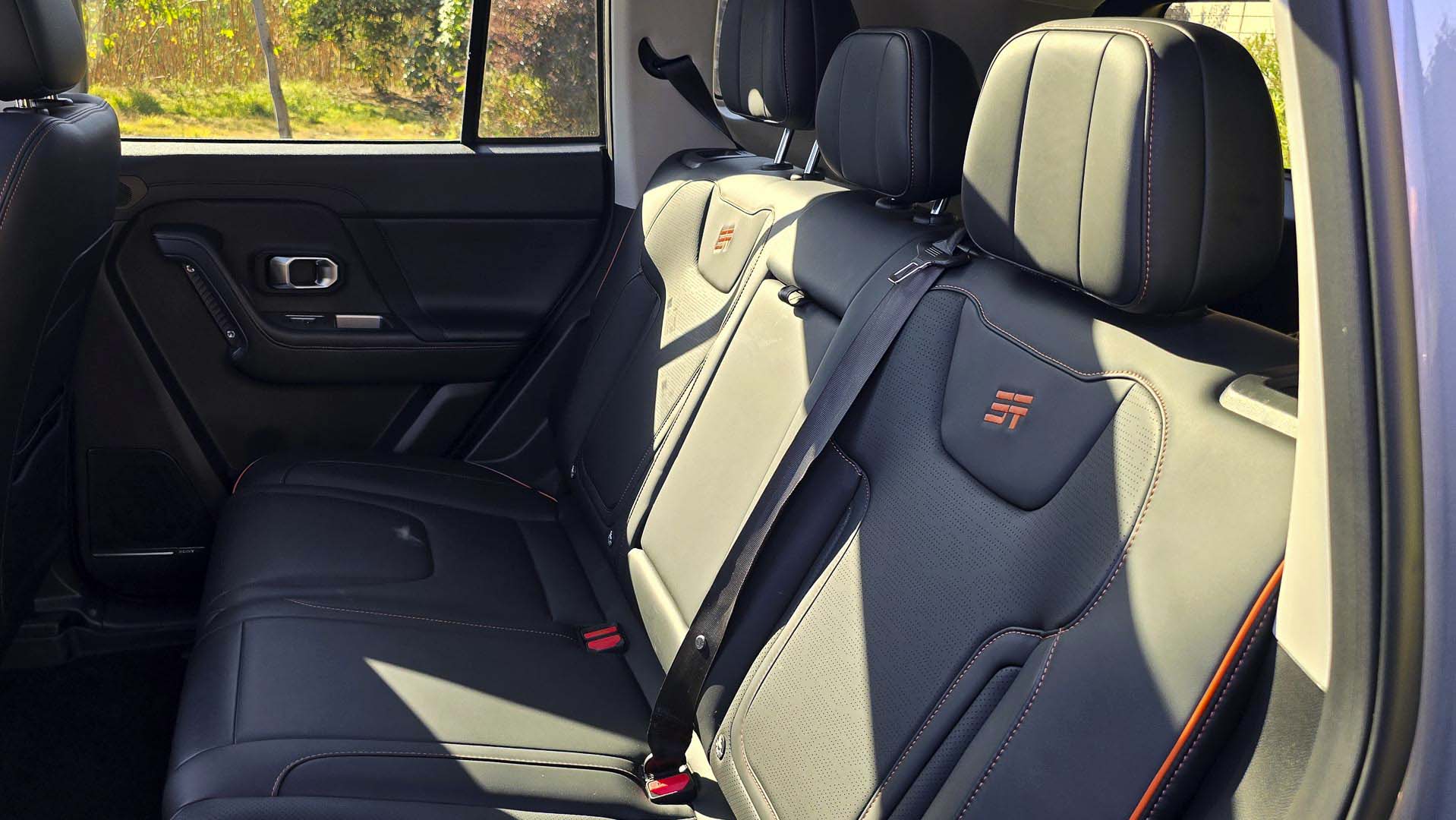 Los asientos delanteros son cómodos, con un soporte adecuado para largos viajes por carretera o en terrenos irregulares. En la versión Wild, suman funciones de calefacción, ventilación y ajustes eléctricos con memoria para el conductor siendo muy práctico por si alguien más conduce la T1, para la comodidad del copiloto el asiento puede reclinarse totalmente, una función que no muchos vehículos lo tienen. La posición de manejo es lo suficientemente alta para tener una visión completa del cofre y del entorno. Esta perspectiva te hace sentir lo voluminoso y alto de la carrocería. Para terminar de envolver la experiencia de sofisticación y amplitud, el techo panorámico permite a las dos filas de asientos la entrada luz natural.