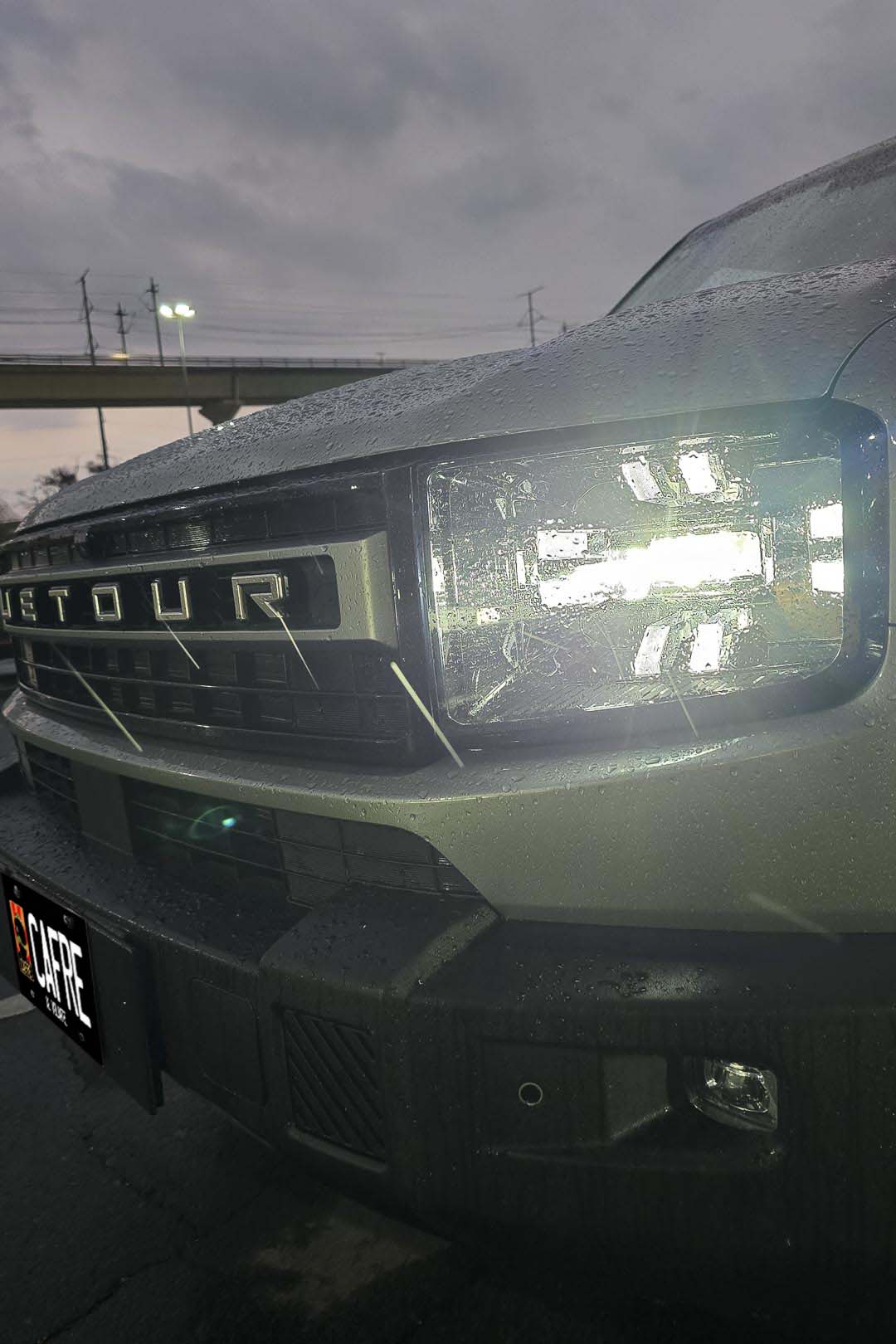 Las luces frontales tienen un diseño denominado Matrix la cual las luces diurnas rodean al faro LED principal dándole un efecto de tercera dimensión. El frente se completa con una parrilla de gran tamaño y un acabado en negro y la palabra «JETOUR» en el centro de la, con una tipografía vanguardista para darle sofisticación a este todoterreno.