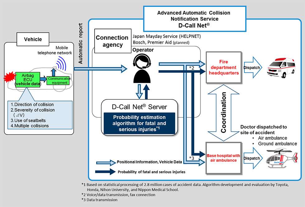 La implementación completa del sistema automático avanzado de notificación de colisión D-Call Net® se está llevando a cabo en aproximadamente 730 locaciones en Japón. El servicio de prueba está en operación desde noviembre de 2015, por lo cual los hospitales de base y ambulancias aéreas han preparado sistemas para transmitir datos de probabilidad de heridas